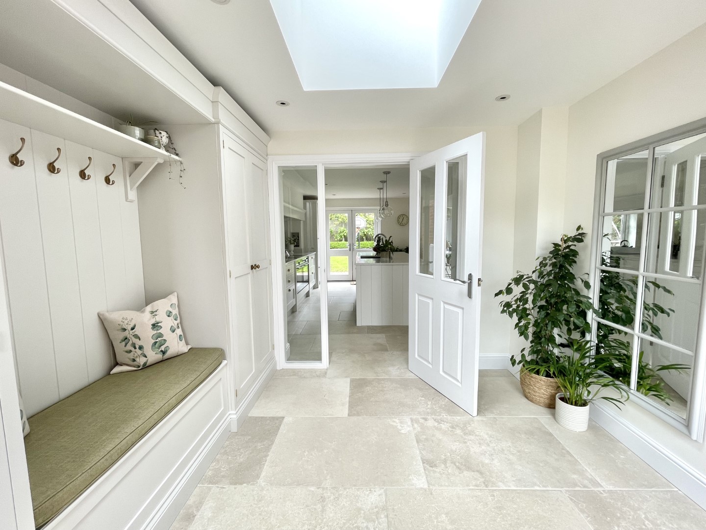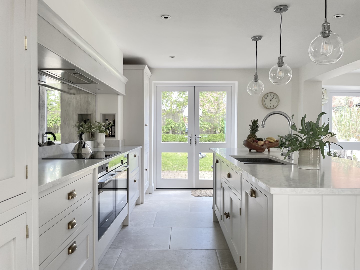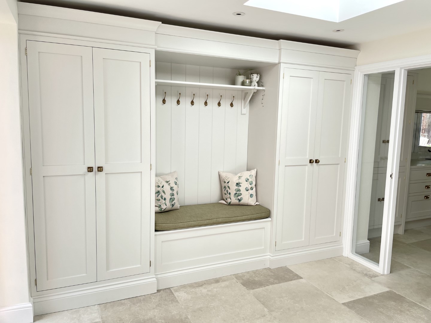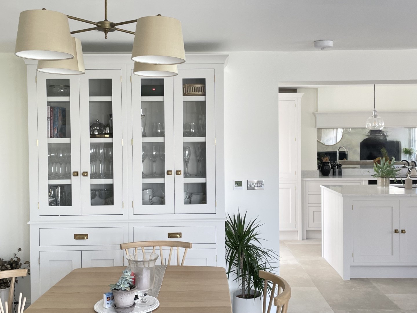 The handcrafted inframe kitchen cabinetry is a key part, hand painted in a classic light grey colour, and giving the room a clean, fresh appeal. The subtle warm tones of the burnished brass handles complement the handmade kitchen cabinetry perfectly. This is a beautiful, bespoke shaker kitchen which will be at the heart of the home for many years to come.