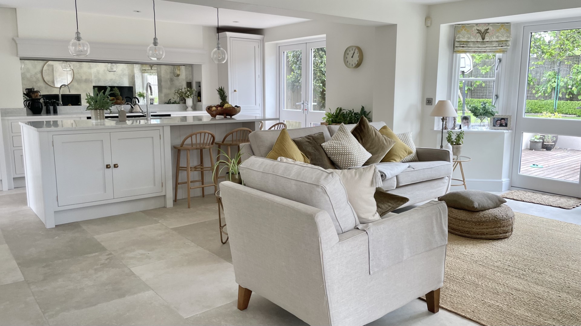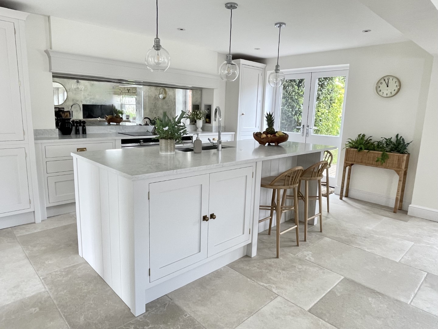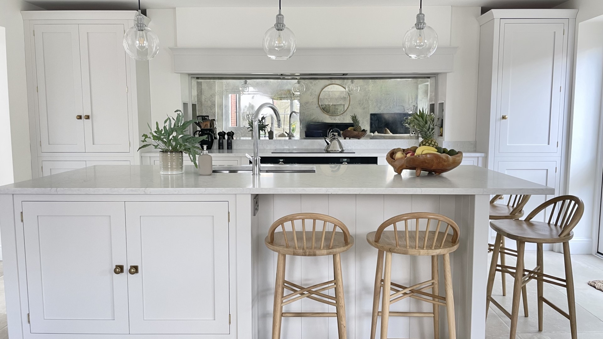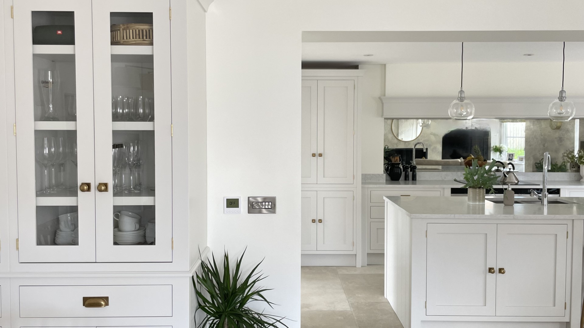 The handcrafted inframe kitchen cabinetry is a key part, hand painted in a classic light grey colour, and giving the room a clean, fresh appeal. The subtle warm tones of the burnished brass handles complement the handmade kitchen cabinetry perfectly. This is a beautiful, bespoke shaker kitchen which will be at the heart of the home for many years to come.