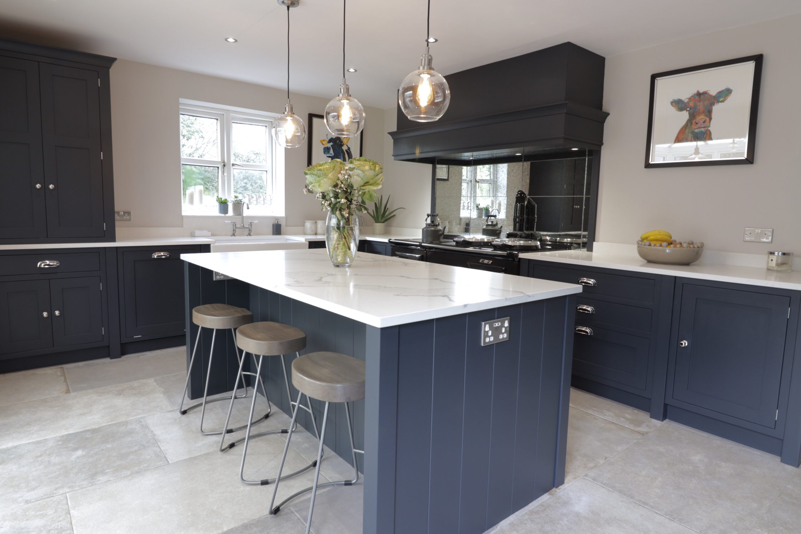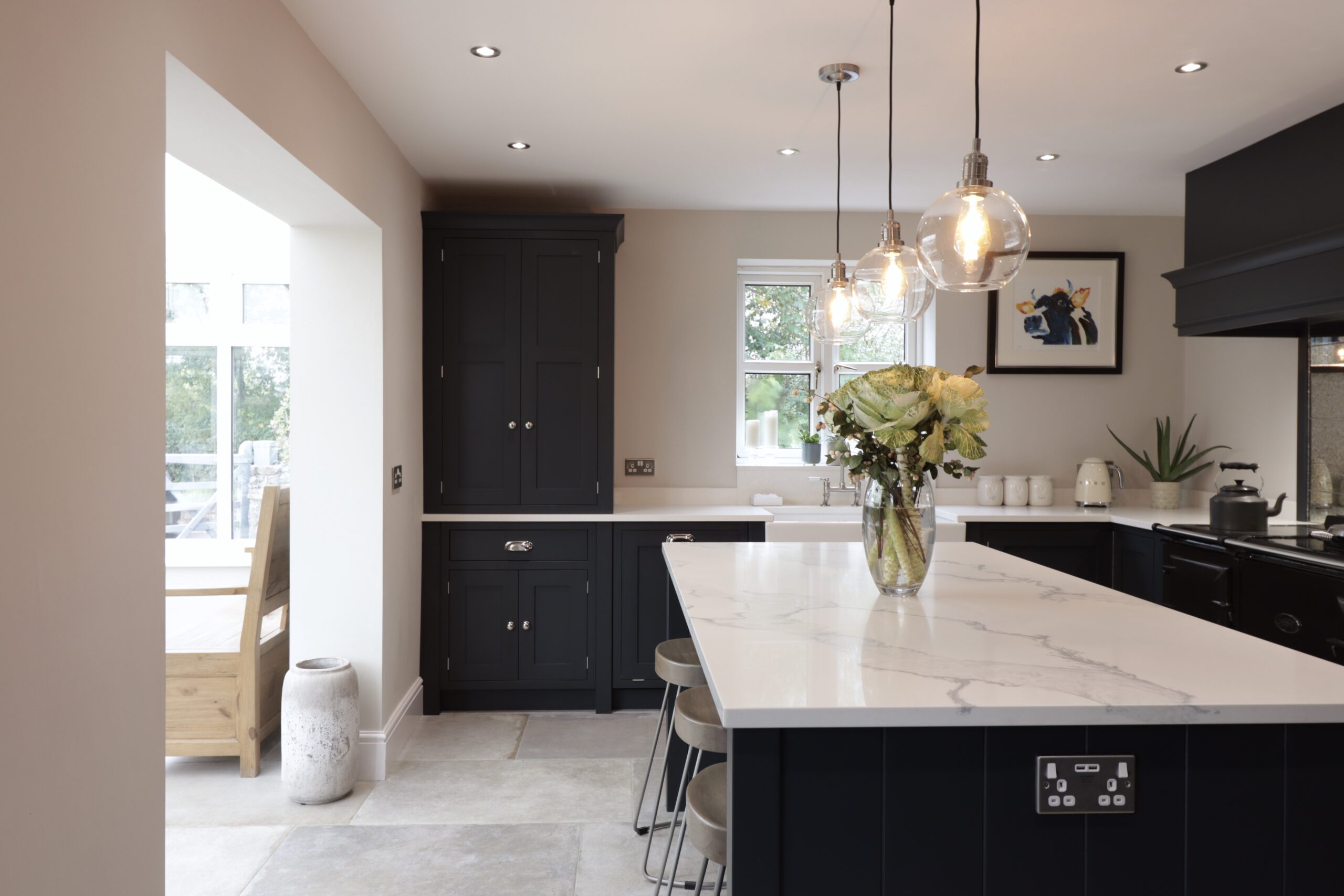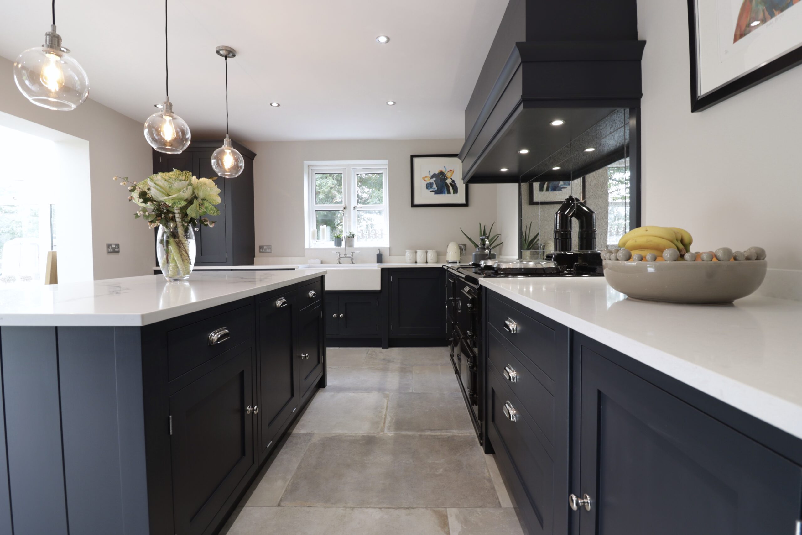 Located on the English Welsh border near Chester, this bespoke handcrafted kitchen with striking, made to measure hand-painted cabinetry and nickel handles brings a contemporary flair to a traditional inframe shaker style kitchen design.