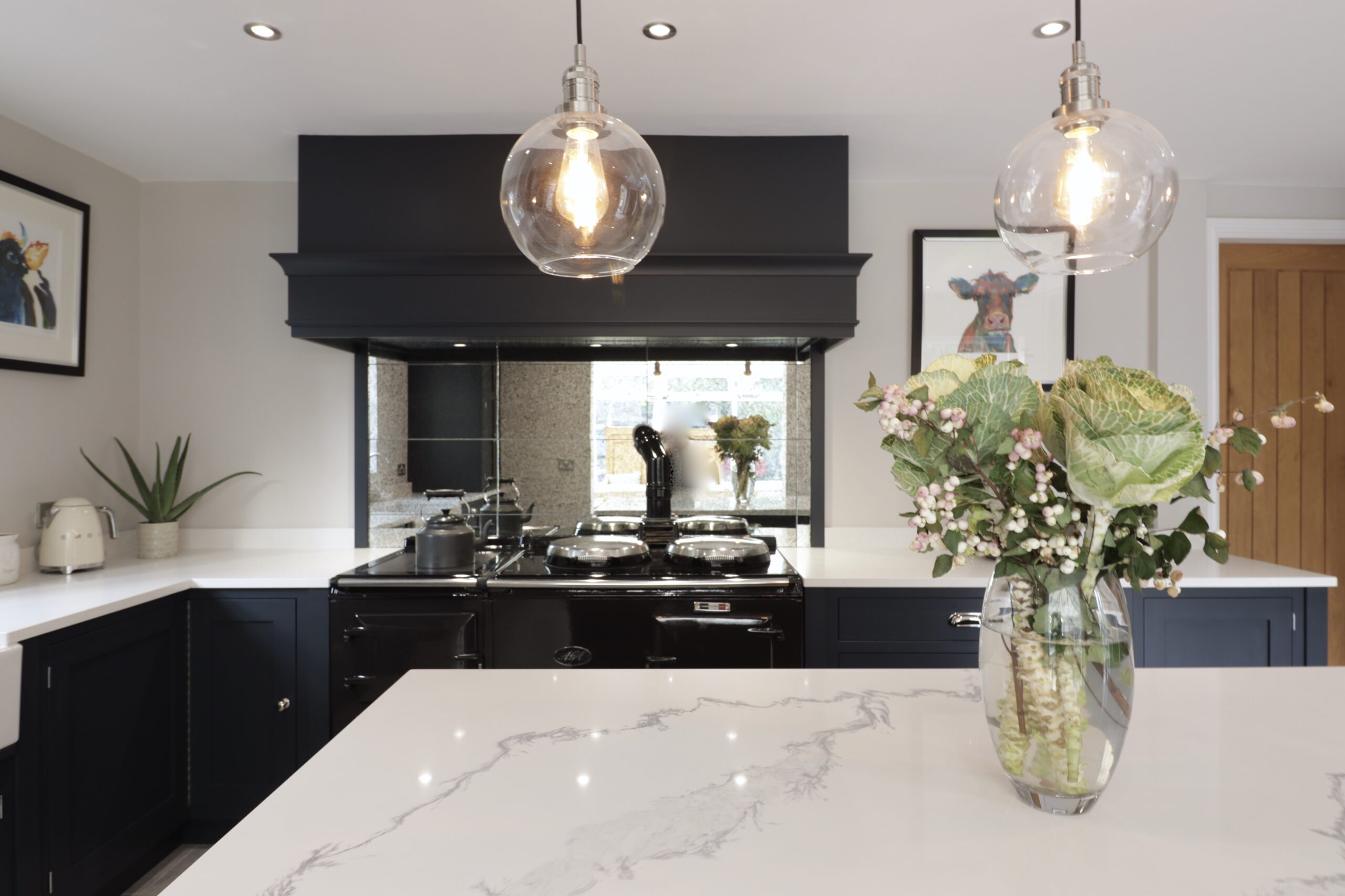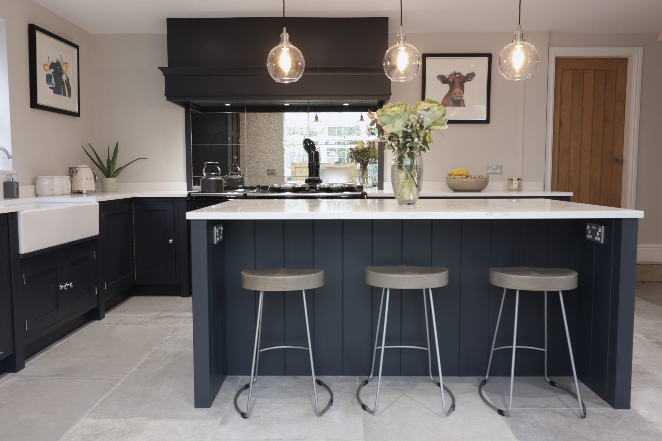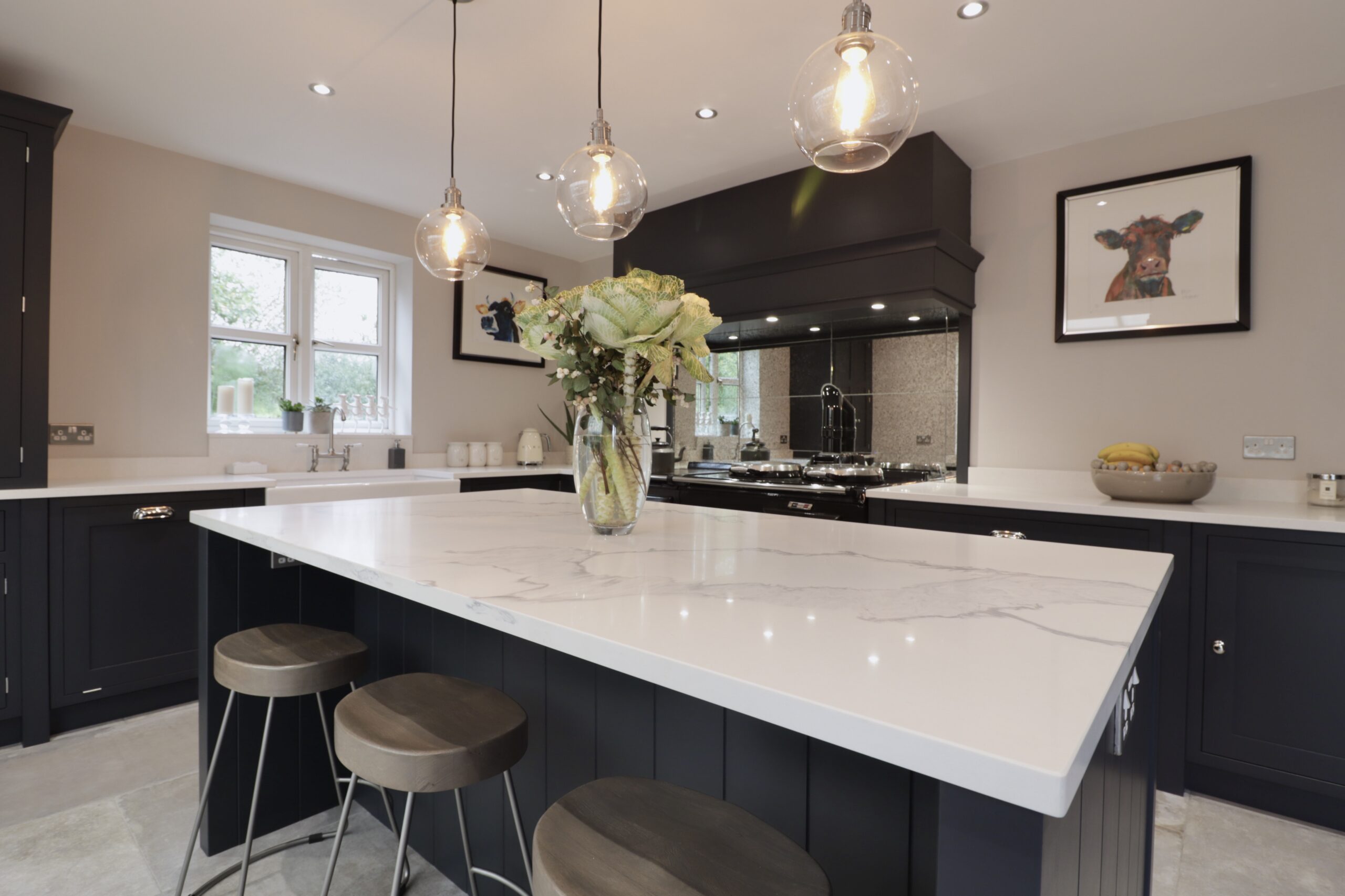 Located on the English Welsh border near Chester, this bespoke handcrafted kitchen with striking, made to measure hand-painted cabinetry and nickel handles brings a contemporary flair to a traditional inframe shaker style kitchen design.