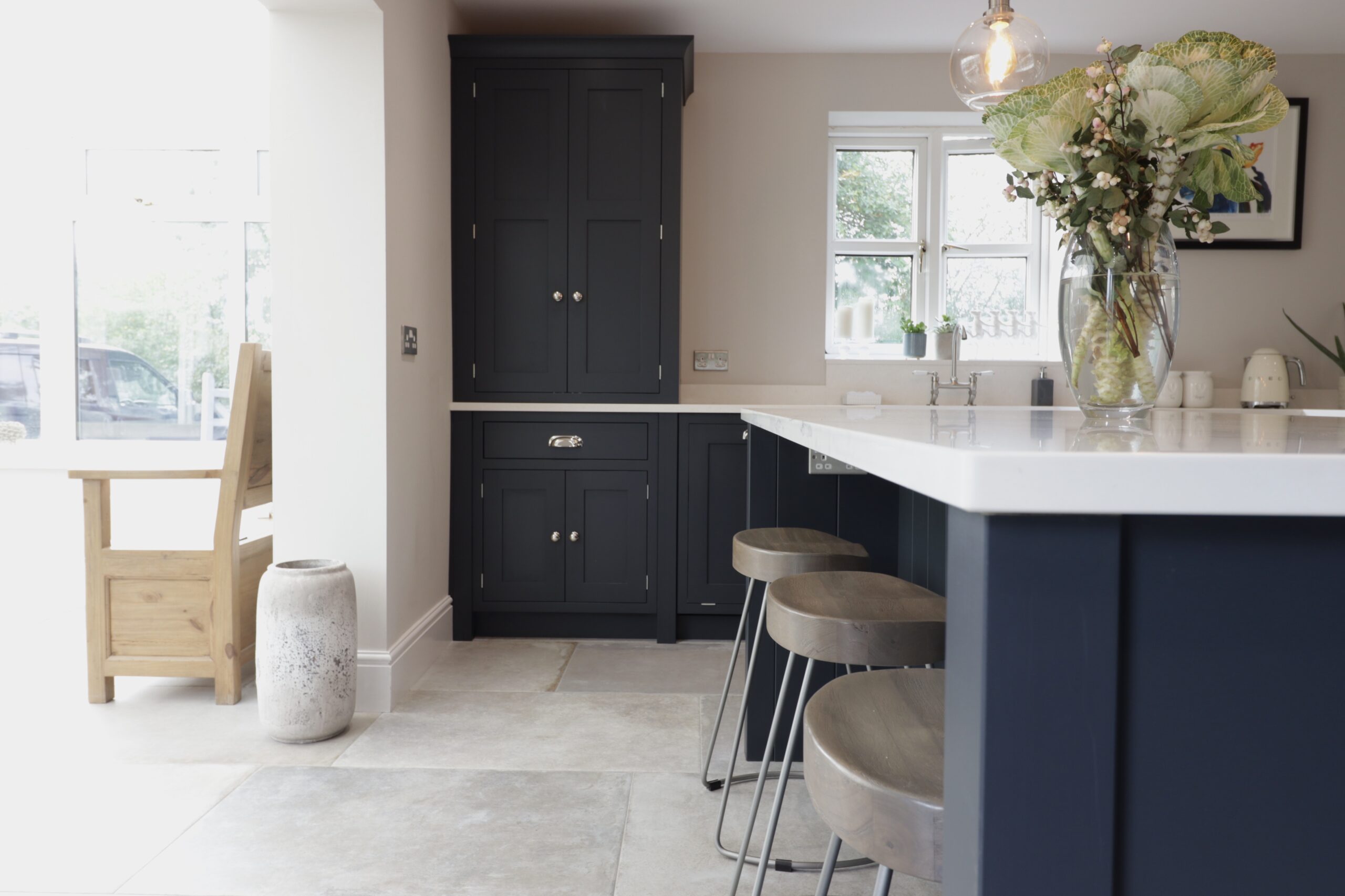The open plan, bespoke shaker kitchen – hand painted in dark ink blue – revolves around a beautiful handmade island. The light-coloured Caesarstone and CLR quartz worktops contrast fabulously with the made to measure cabinetry in this beautifully light and airy room. And then there’s the nickel handles, adding a modern touch to this timeless shaker style kitchen design. This is a bespoke inframe kitchen which is the perfect family space for cooking, socialising and more.