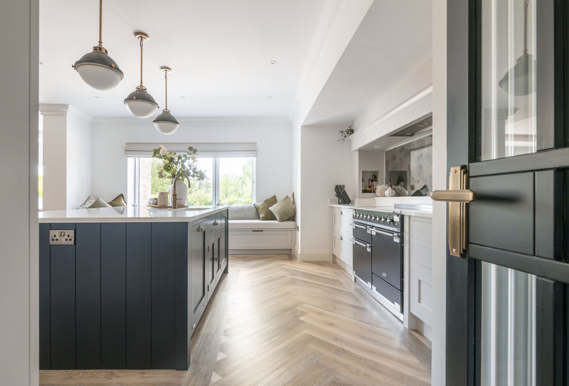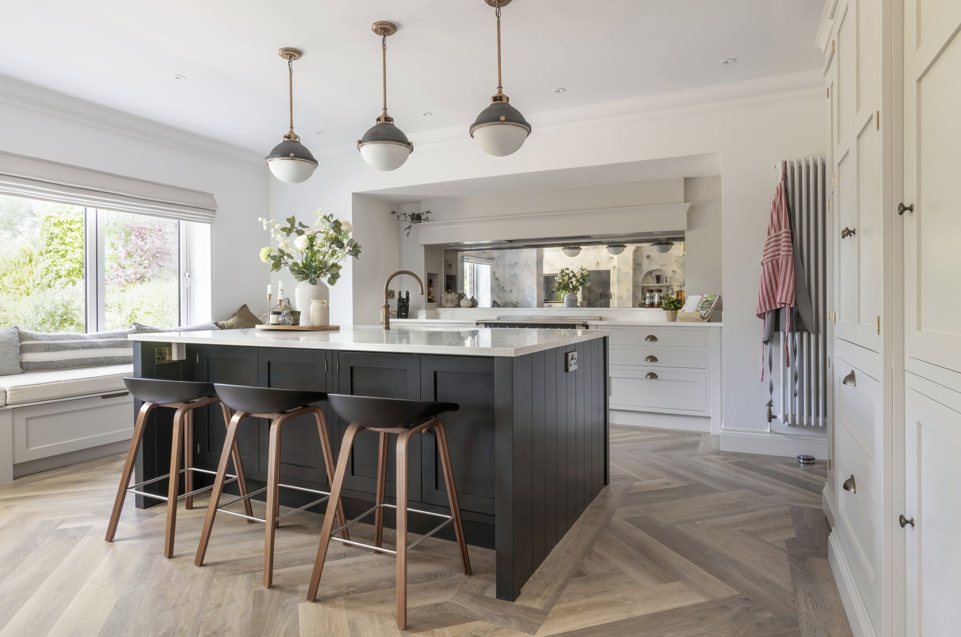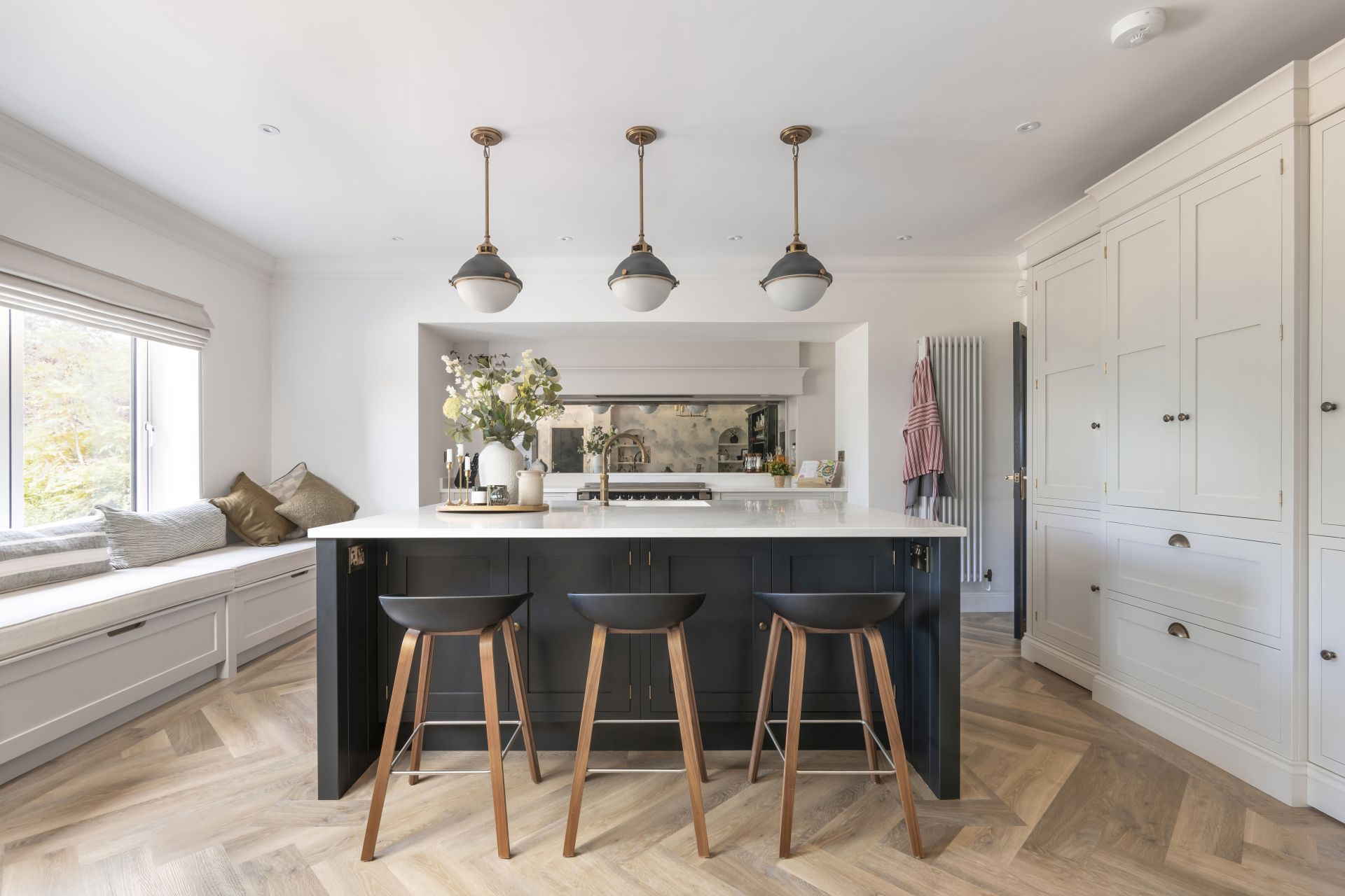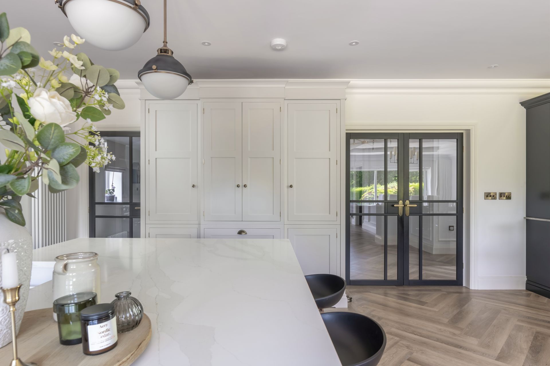 In this bespoke handcrafted kitchen, the bold, contrasting handcrafted kitchen island is a modern twist on the timeless and ever-popular kitchen design. The Shaker kitchen work surfaces are crowned in quartz for an effect that’s both stylishly utilitarian and joyfully modern.