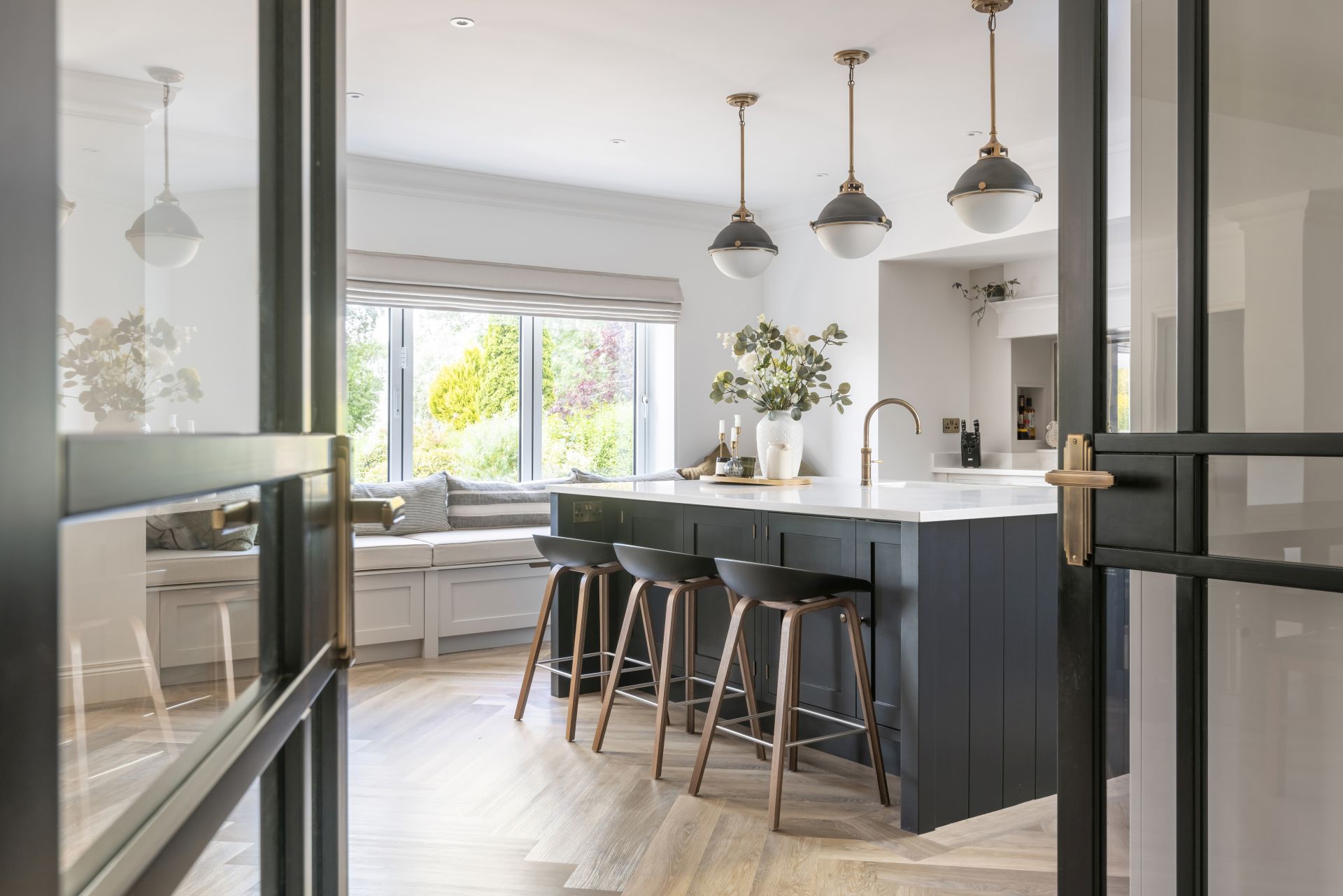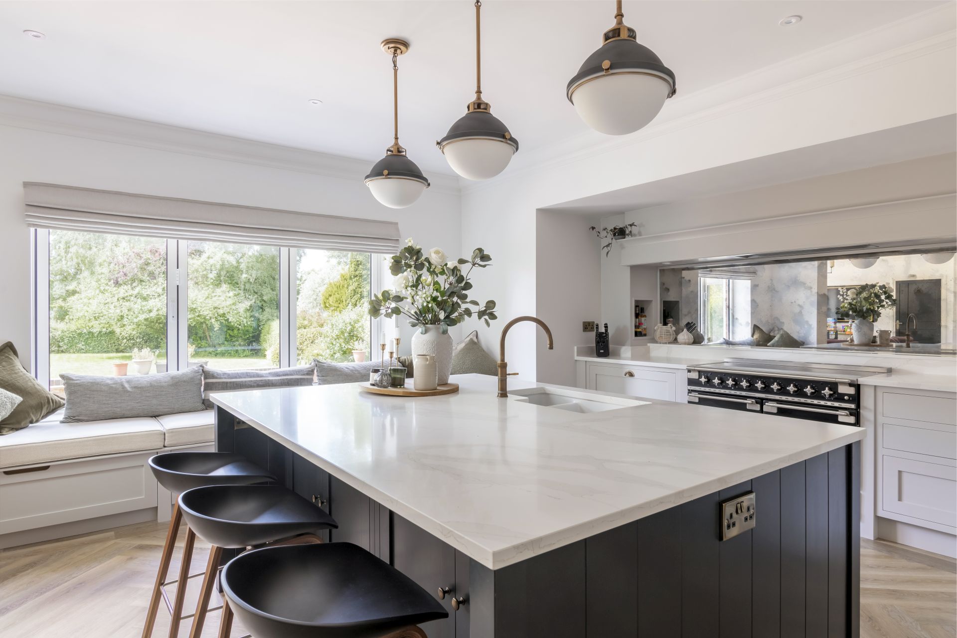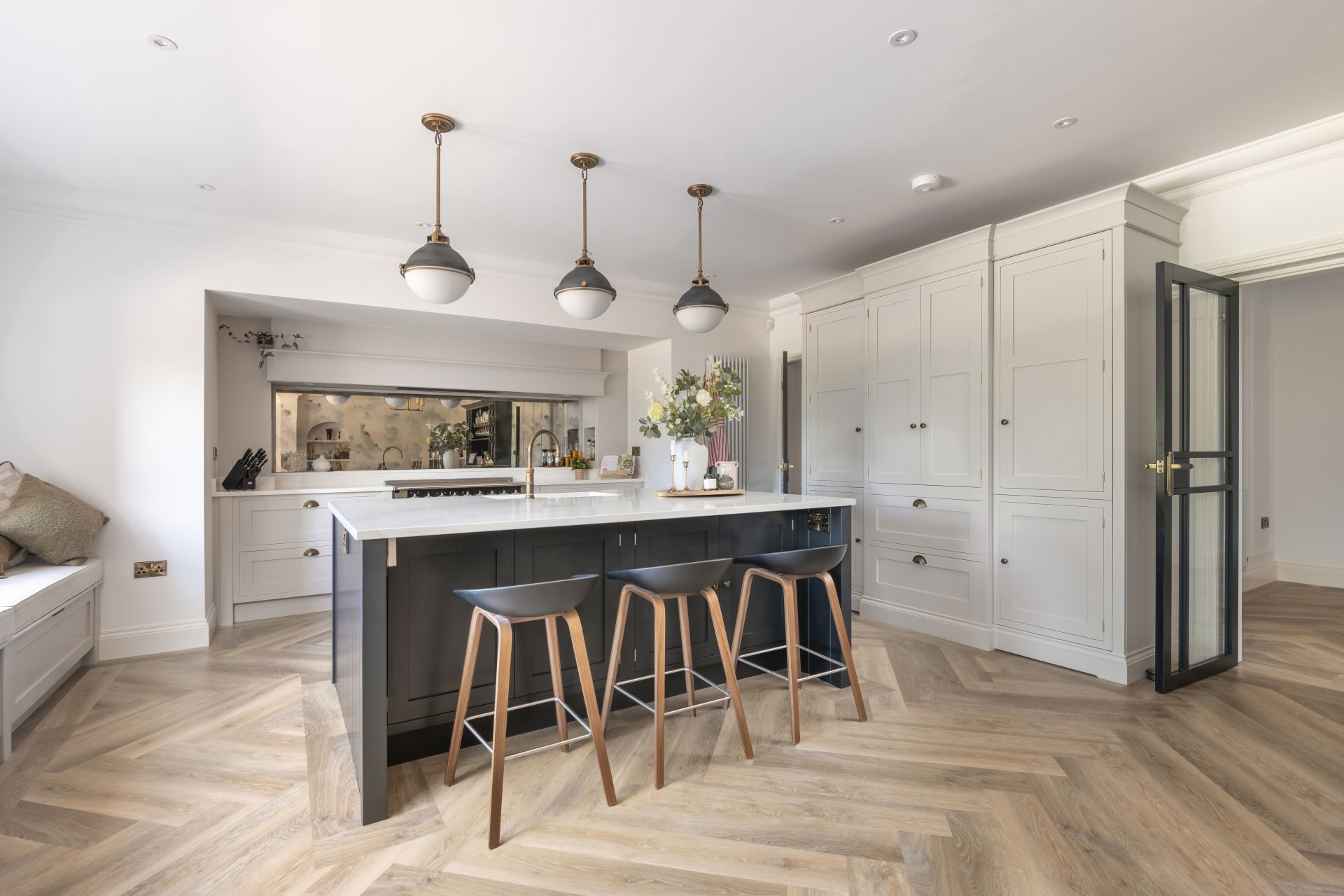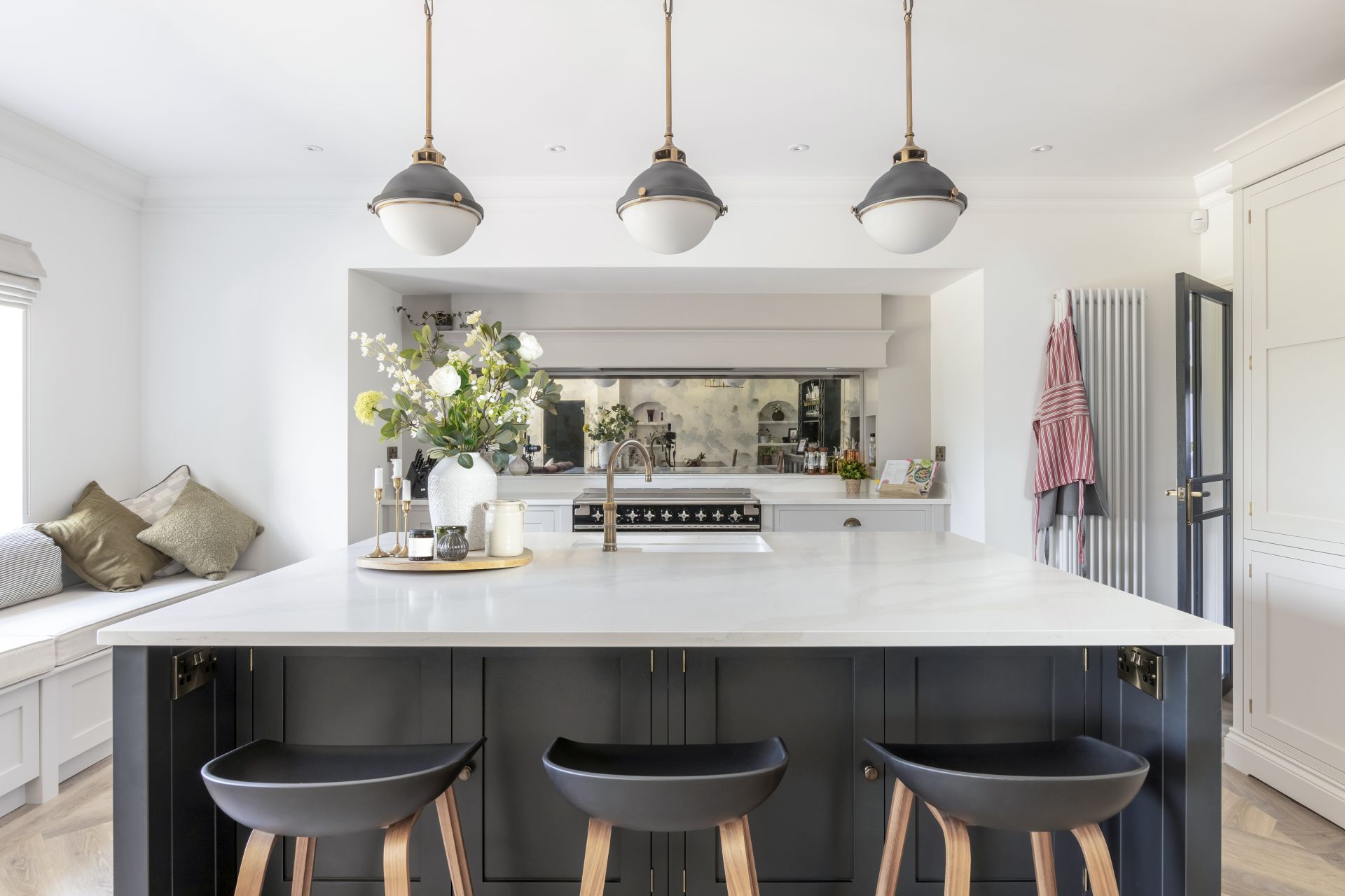 In this bespoke handcrafted kitchen, the bold, contrasting handcrafted kitchen island is a modern twist on the timeless and ever-popular kitchen design. The Shaker kitchen work surfaces are crowned in quartz for an effect that’s both stylishly utilitarian and joyfully modern.