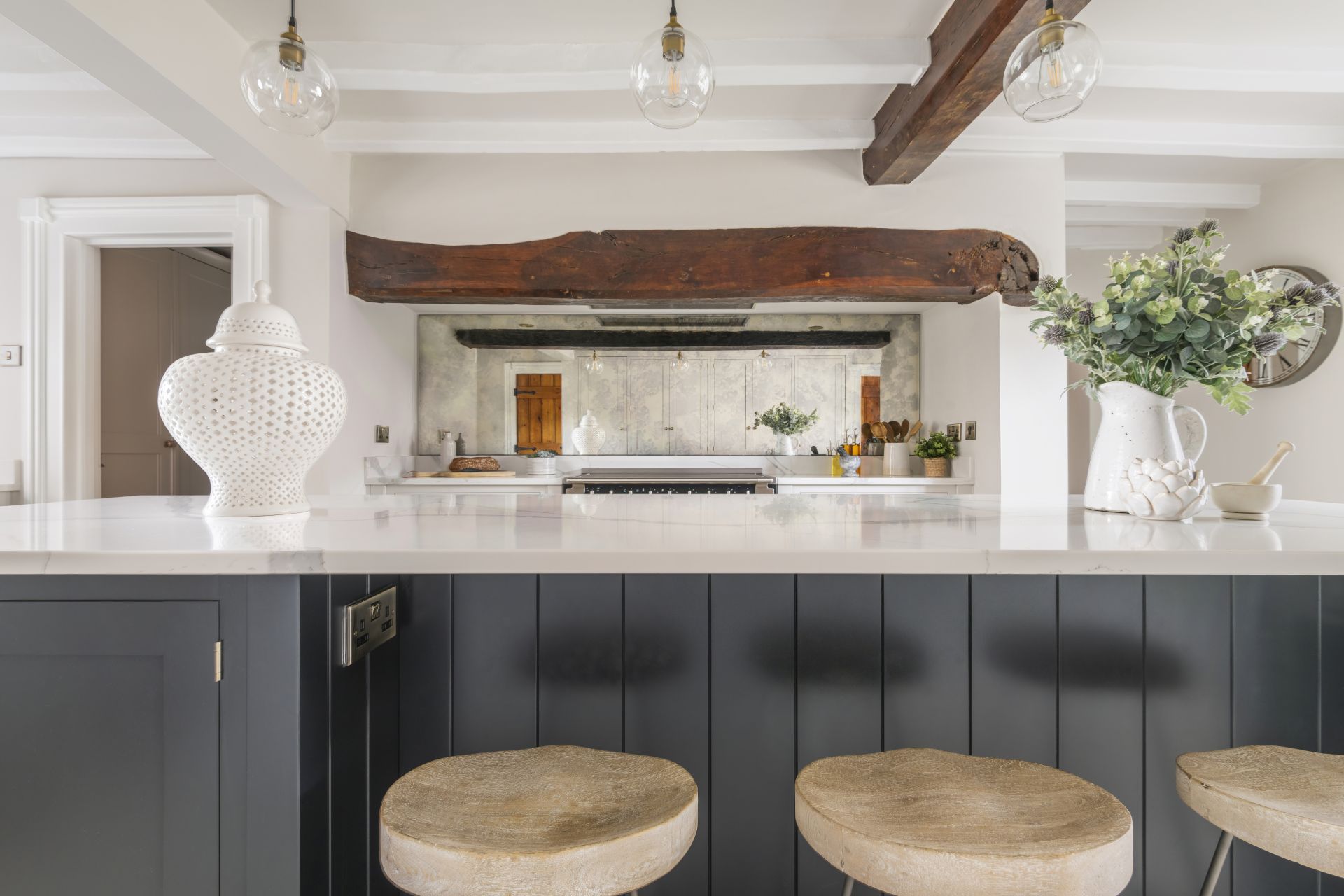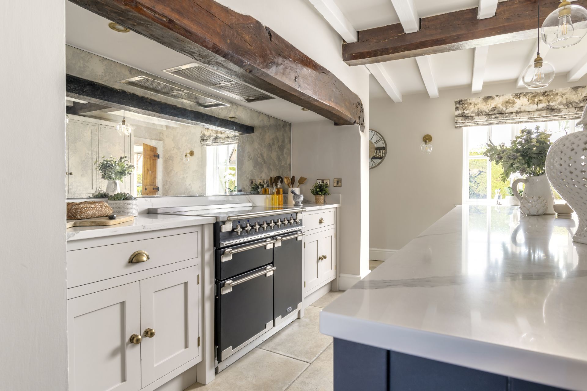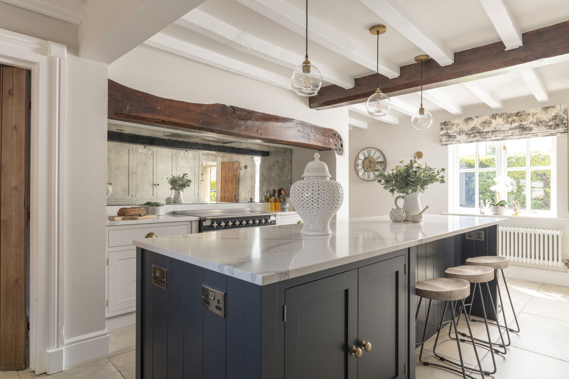 The in-frame cabinetry combines classic detailing with a striking contrast of colours. The bold dark ink blue island is crowned with a stunning quartz worktop that is hard-wearing and a dream to keep clean. With a wealth of integrated storage, this kitchen perfectly blends function and form.