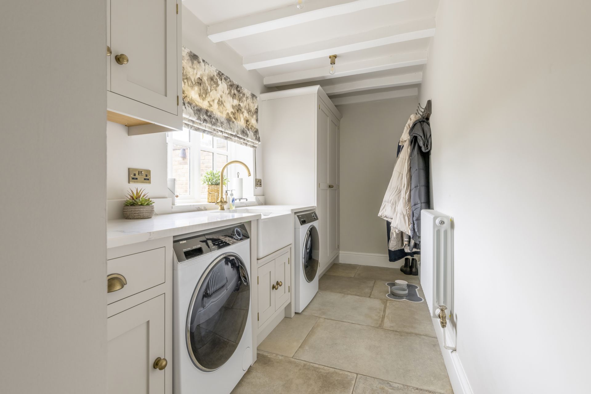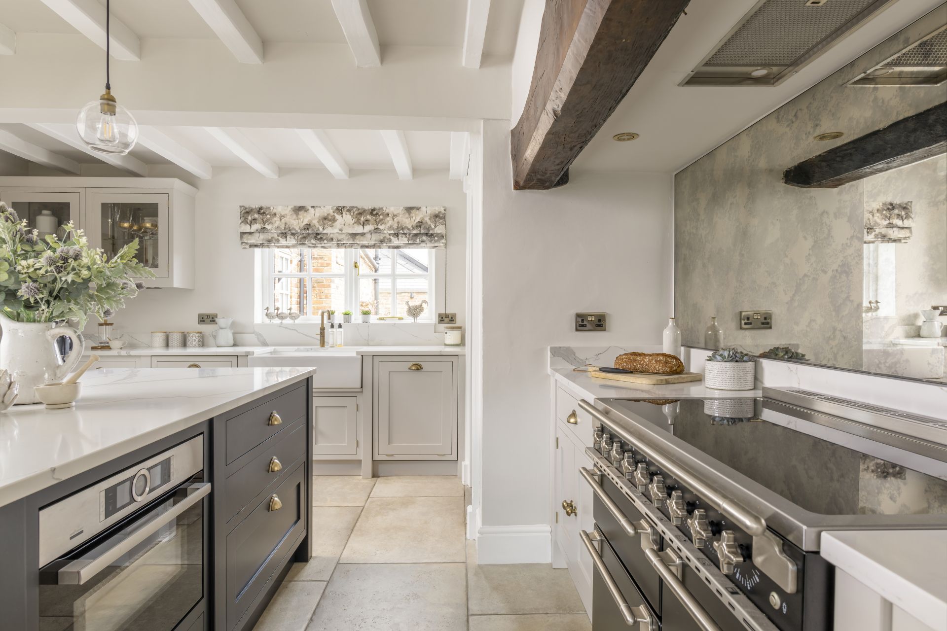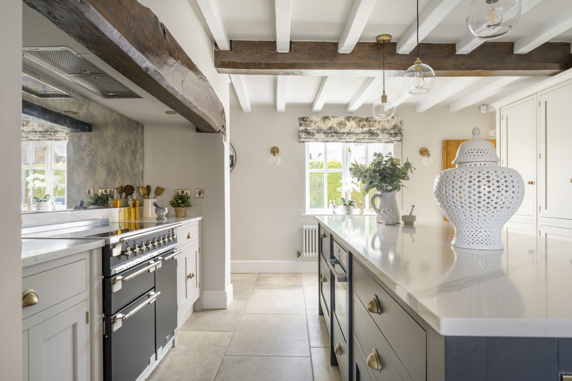 The in-frame cabinetry combines classic detailing with a striking contrast of colours. The bold dark ink blue island is crowned with a stunning quartz worktop that is hard-wearing and a dream to keep clean. With a wealth of integrated storage, this kitchen perfectly blends function and form.