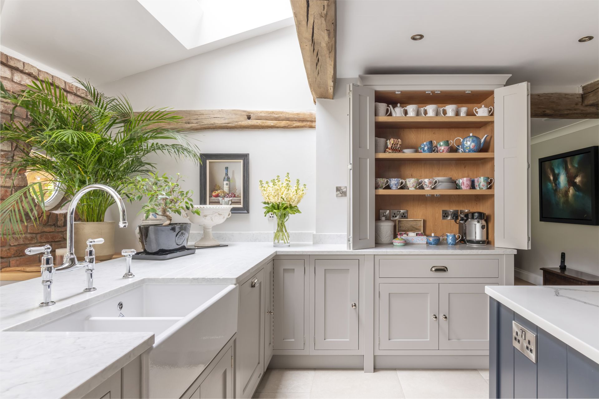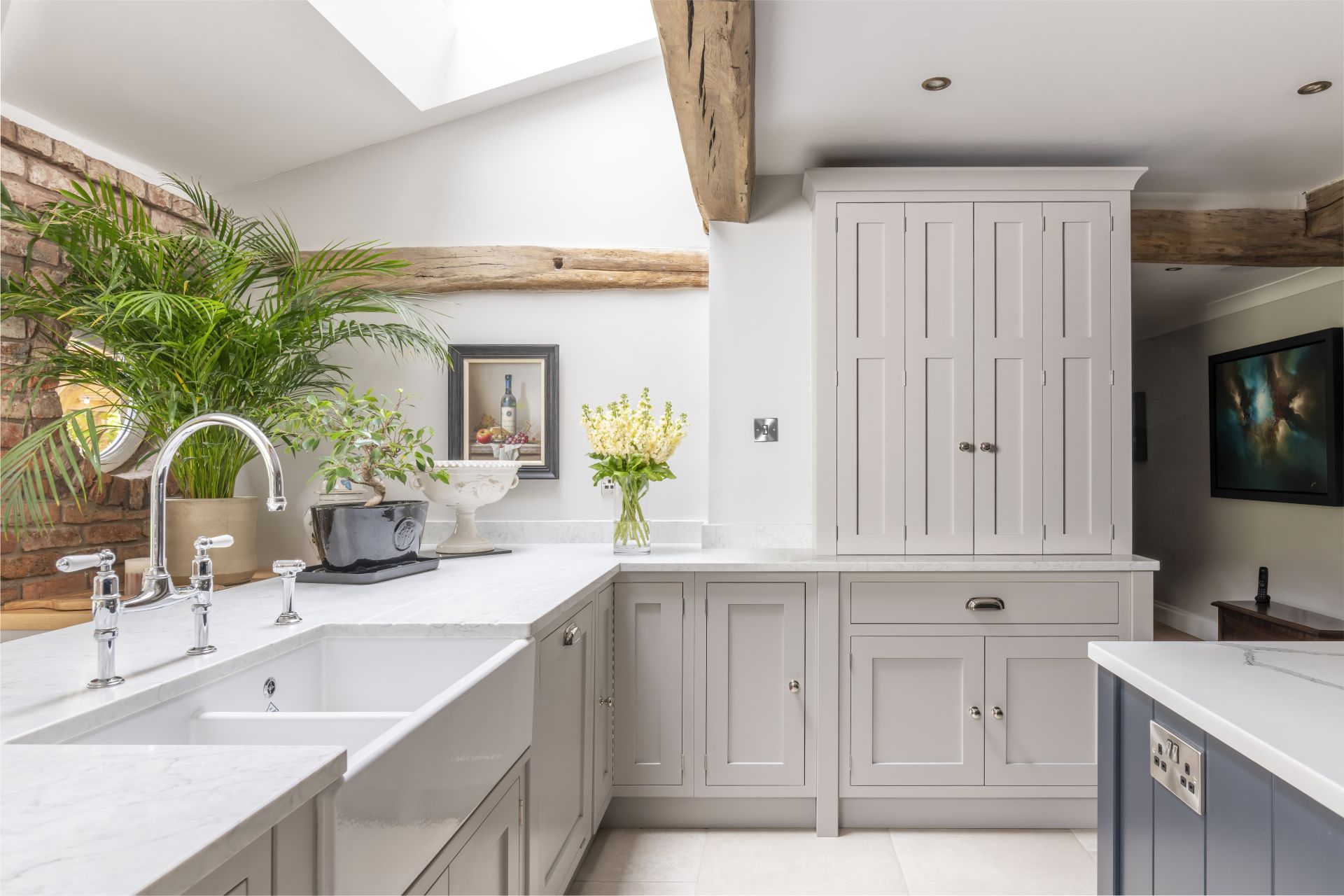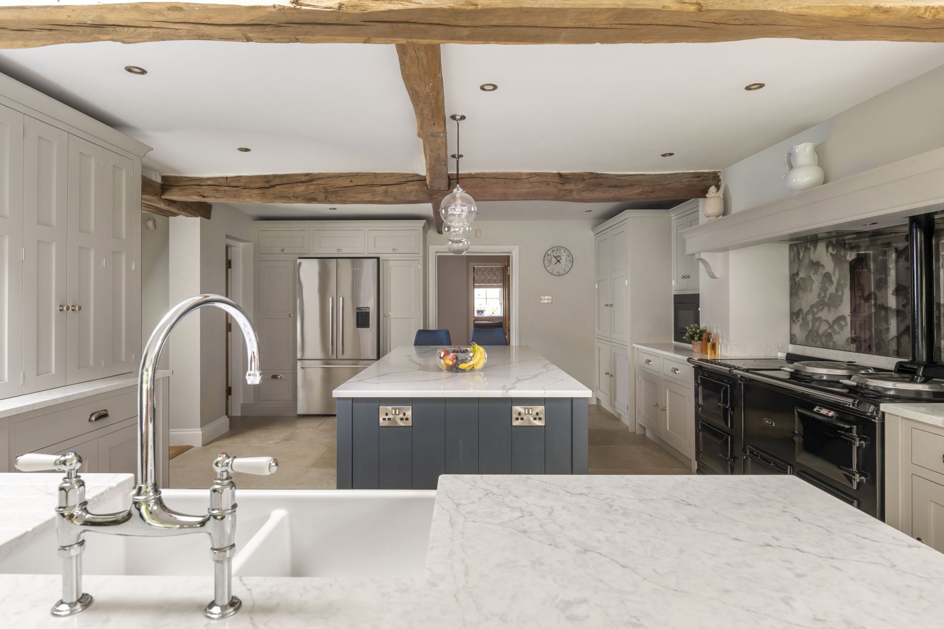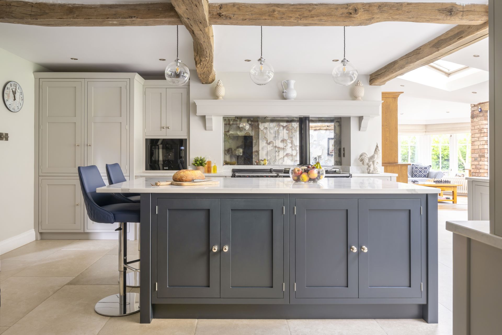 Taking its aesthetic from a timeless Shaker style, the bespoke in-frame kitchen is made to measure with the room’s exact dimensions. The larder cupboards, drawers, and hidden integrated appliances are all key parts of this bespoke handmade design, with each ideally placed to maximise space and ensure everything is easy to reach. To finish, the antiqued mirror splashback and handmade Shaker cabinetry combine to give this characterful room a delightful style and attractive look.