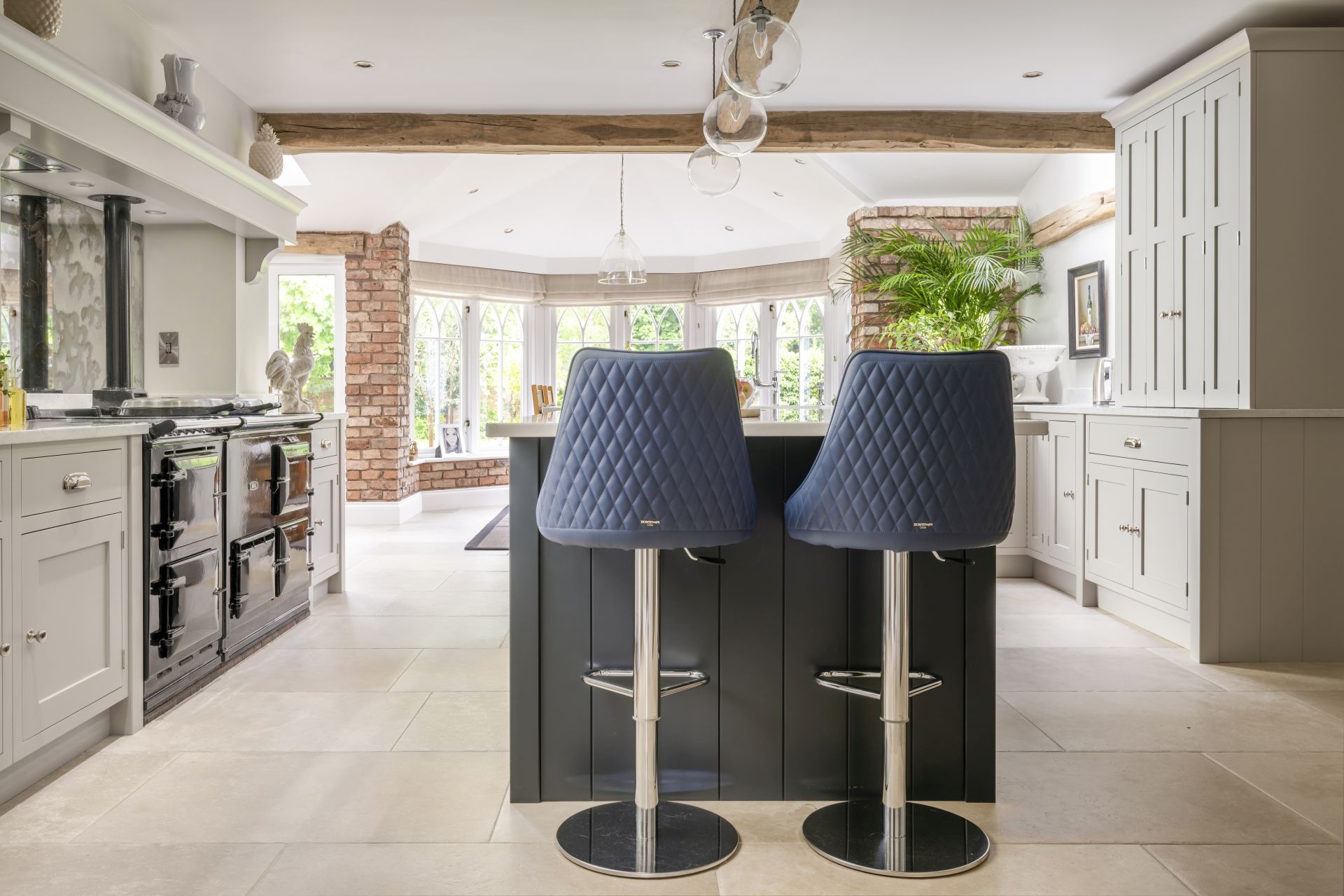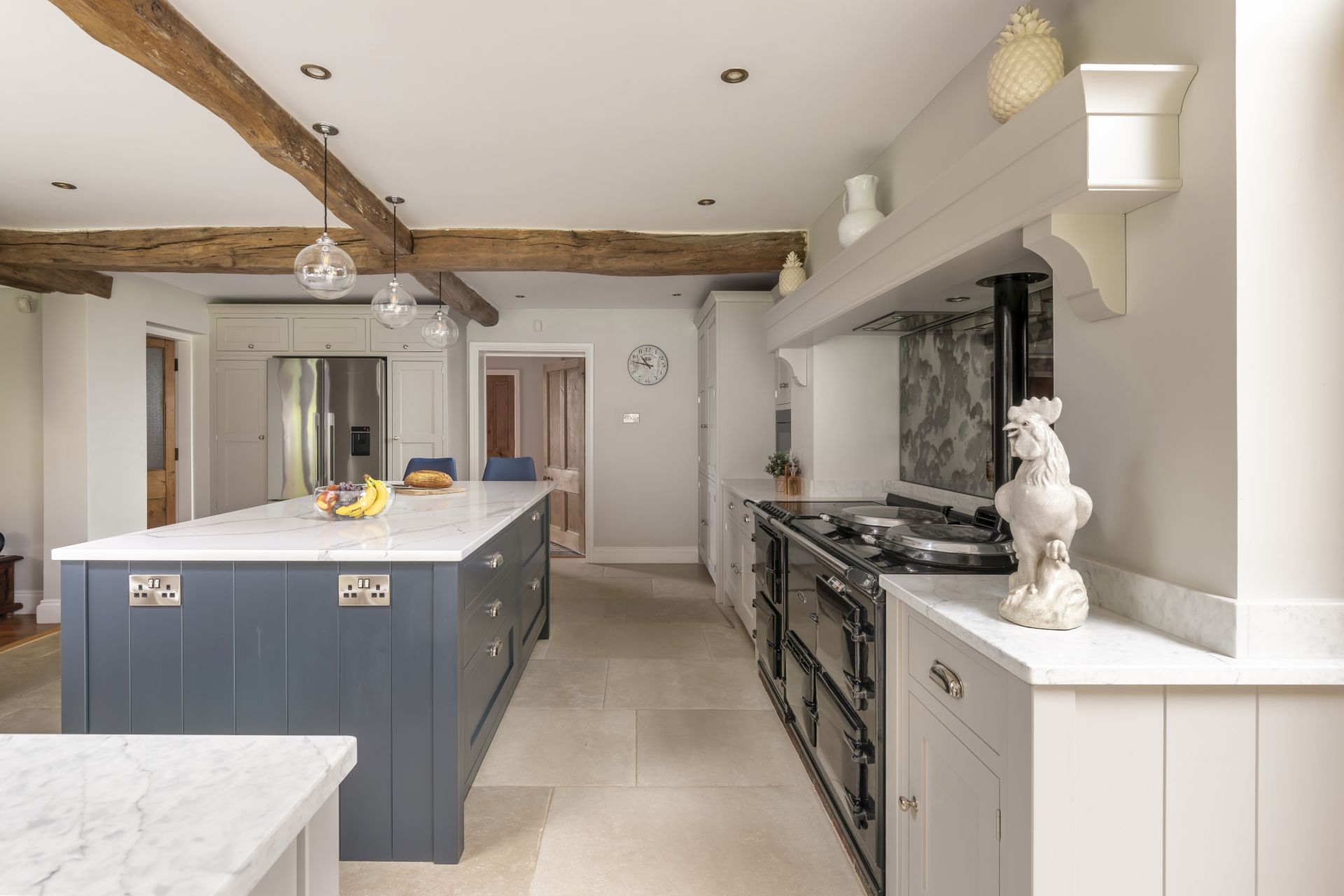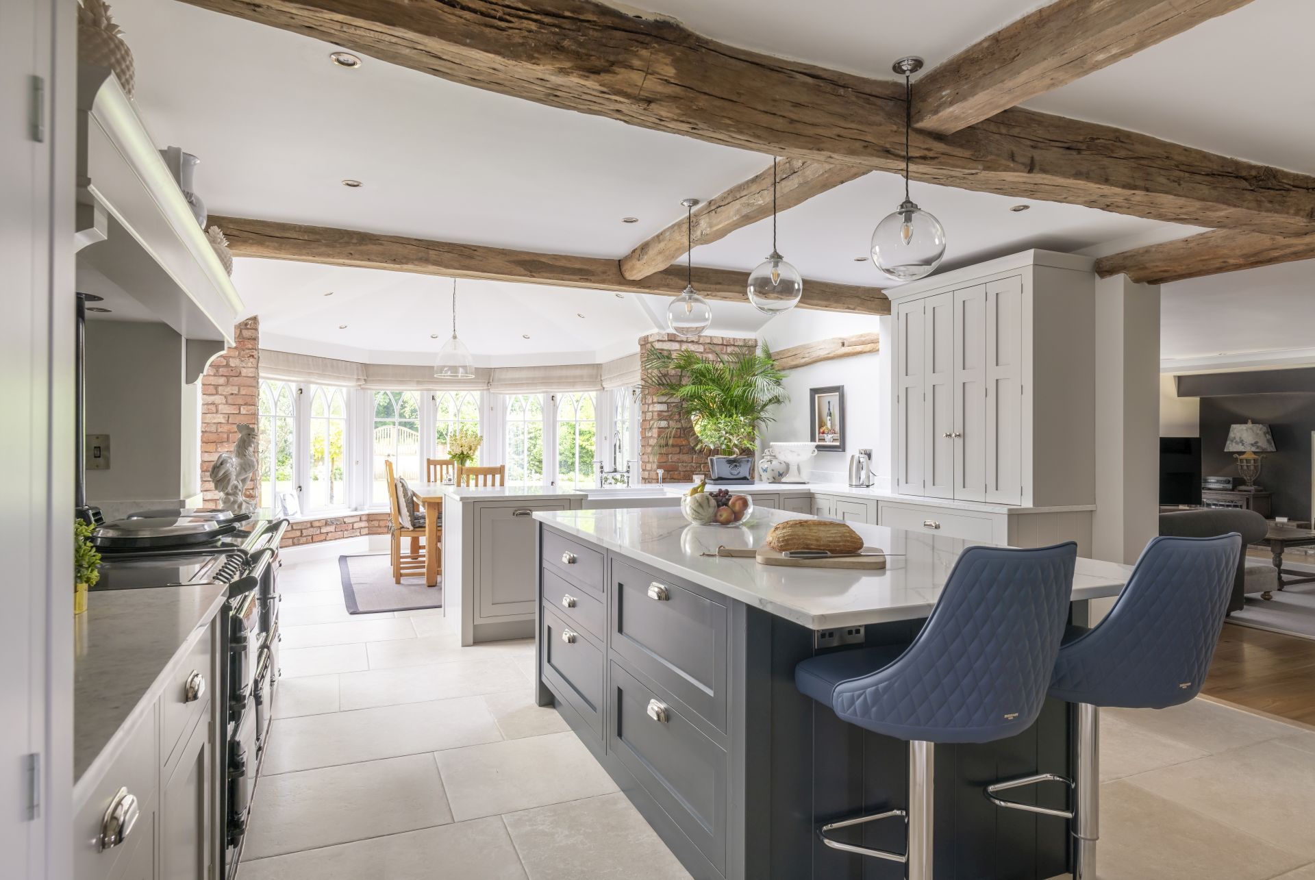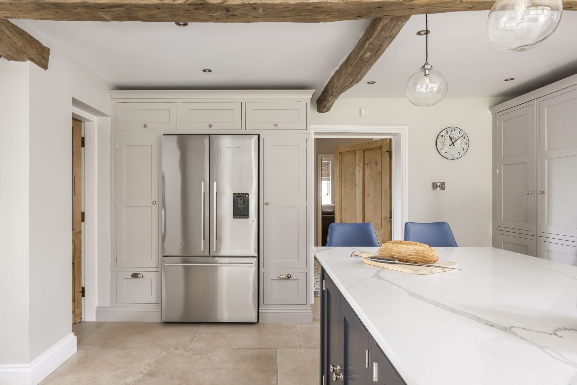 Taking its aesthetic from a timeless Shaker style, the bespoke in-frame kitchen is made to measure with the room’s exact dimensions. The larder cupboards, drawers, and hidden integrated appliances are all key parts of this bespoke handmade design, with each ideally placed to maximise space and ensure everything is easy to reach. To finish, the antiqued mirror splashback and handmade Shaker cabinetry combine to give this characterful room a delightful style and attractive look.
