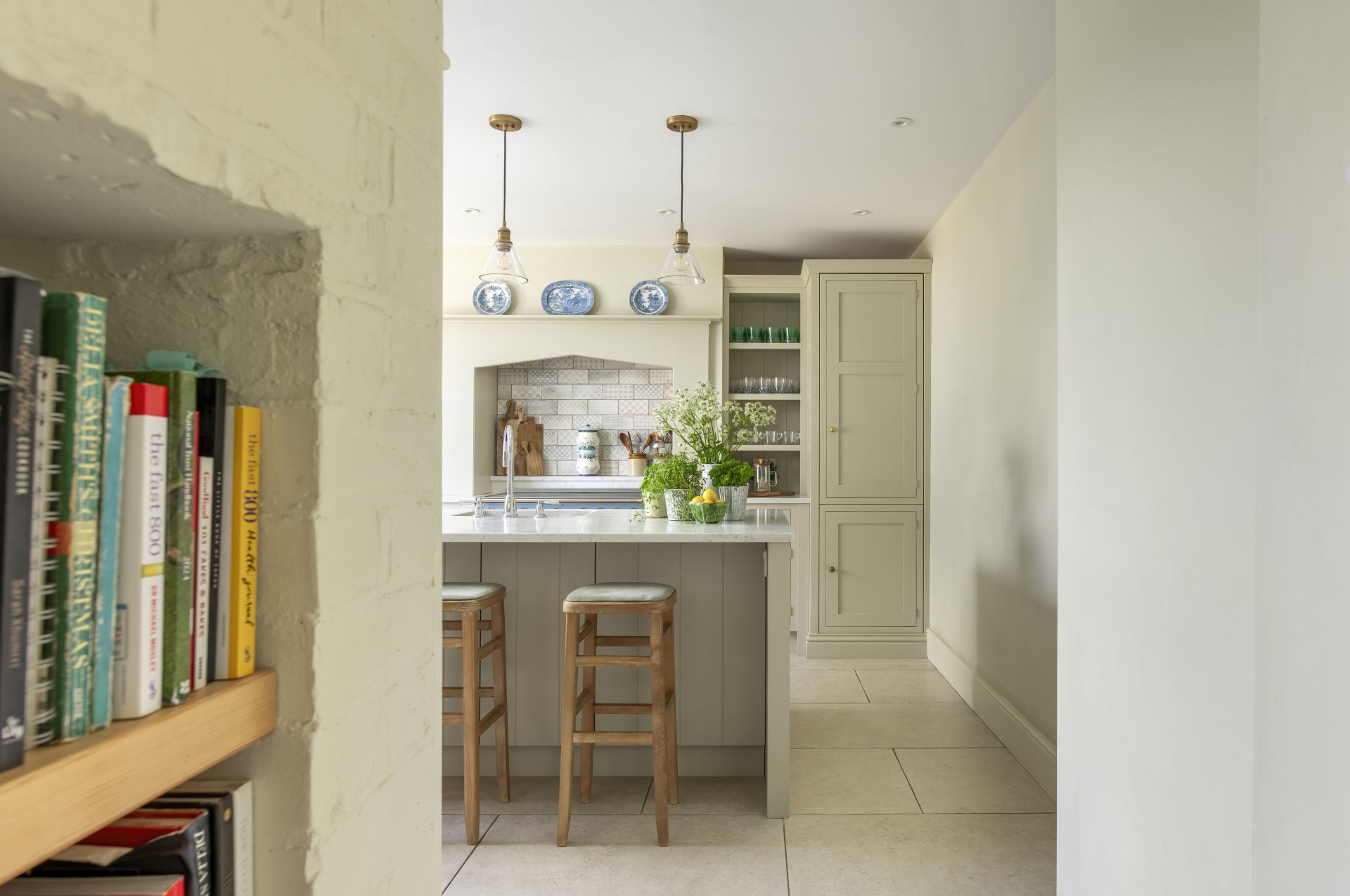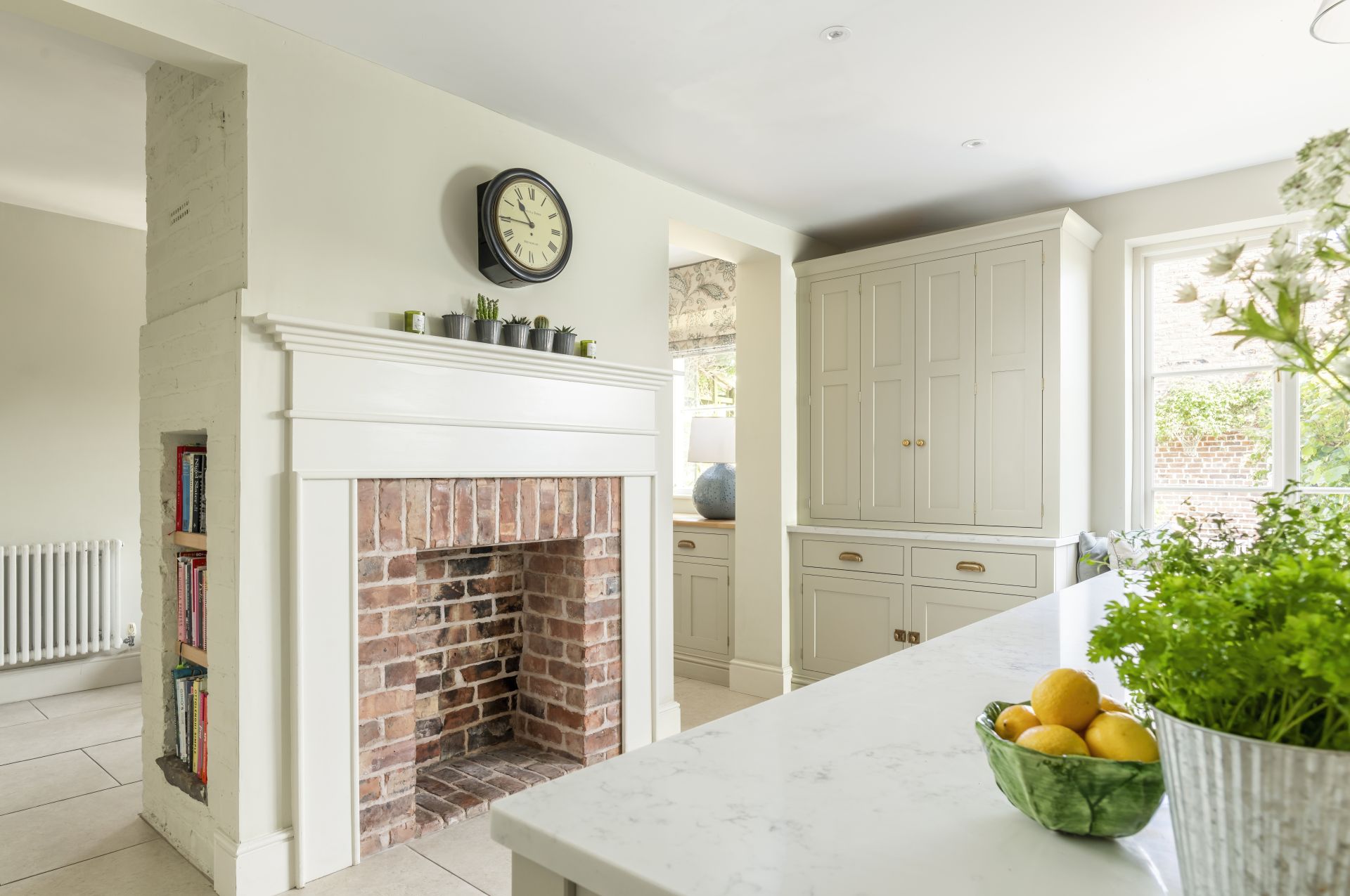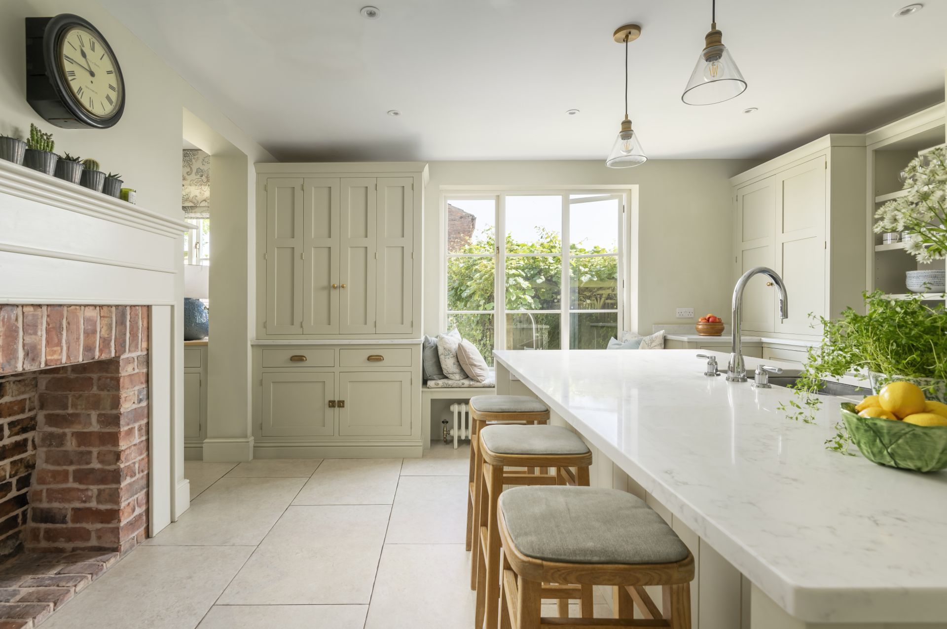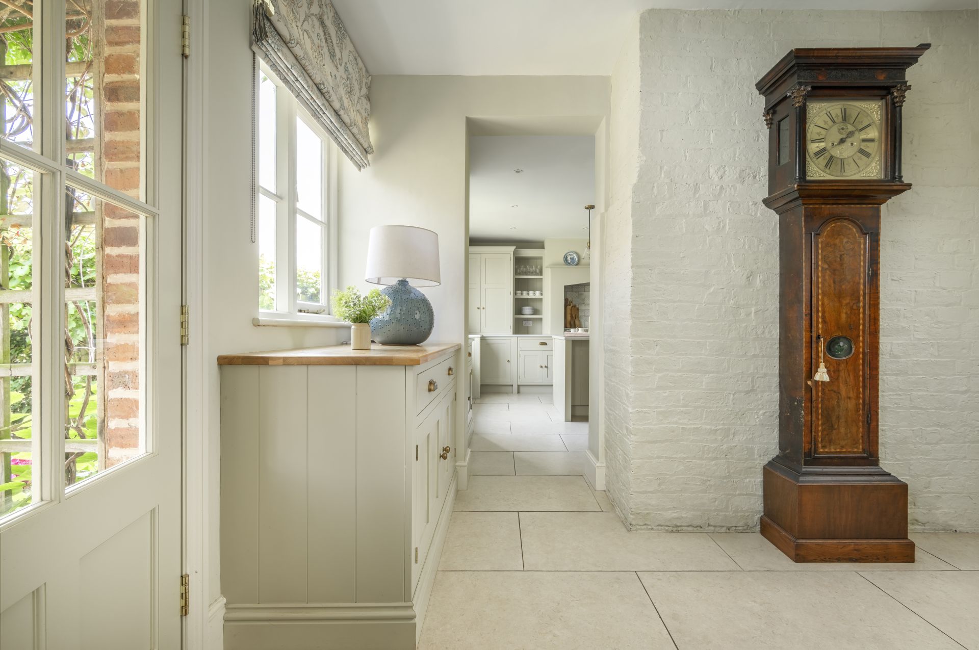 The overall design blends seamlessly with the period features and antique furnishings of the home. Despite its traditional aesthetic, the kitchen is perfectly suited to modern living, featuring hidden integrated appliances and a centrepiece island.