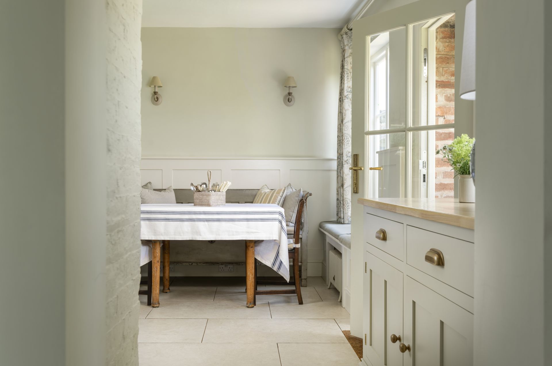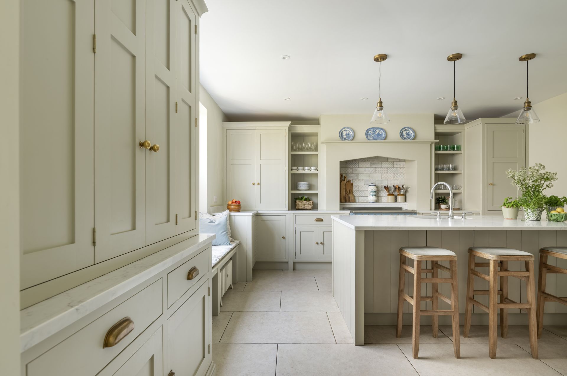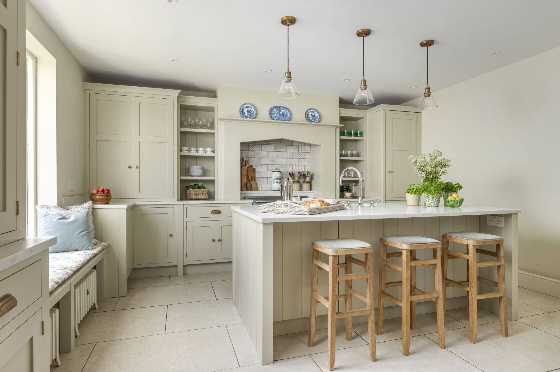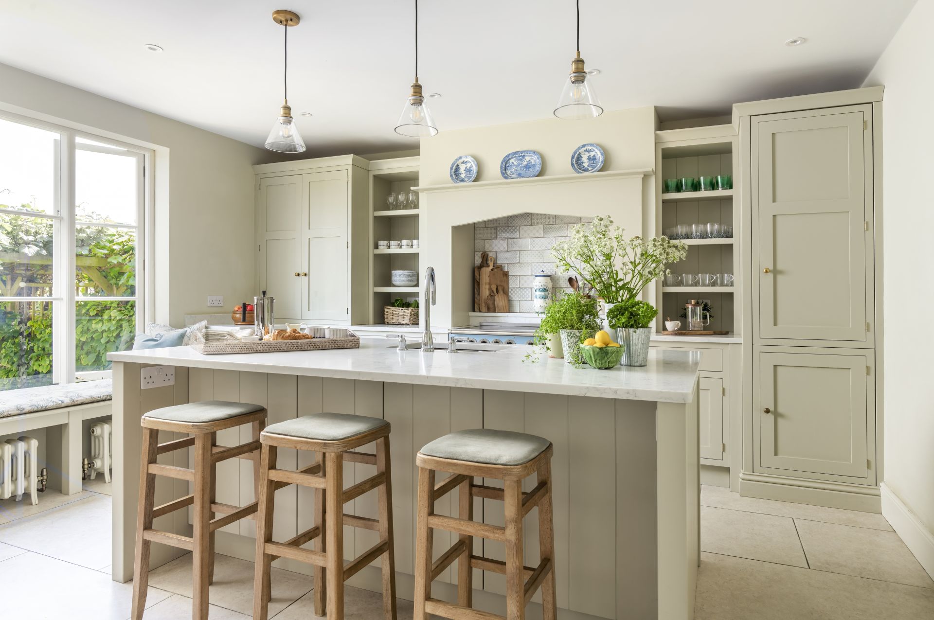 The overall design blends seamlessly with the period features and antique furnishings of the home. Despite its traditional aesthetic, the kitchen is perfectly suited to modern living, featuring hidden integrated appliances and a centrepiece island.