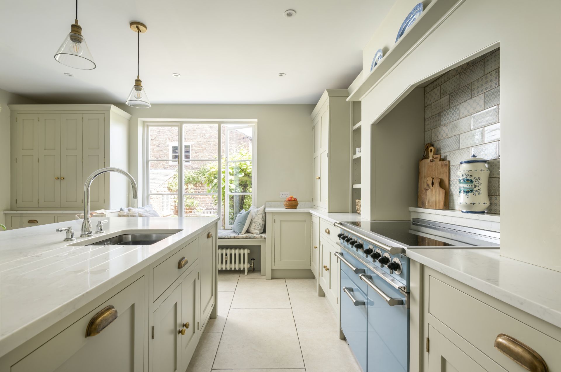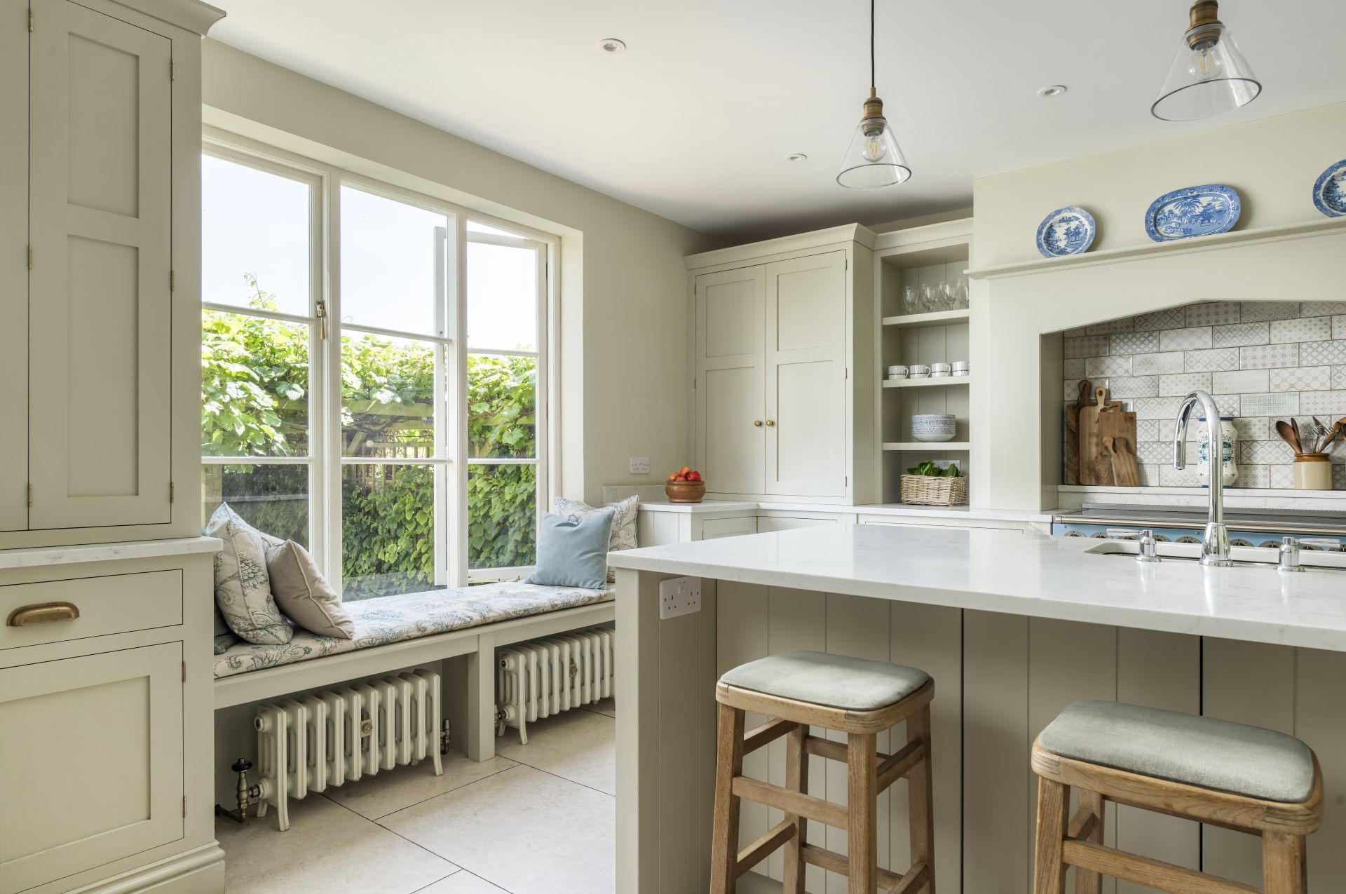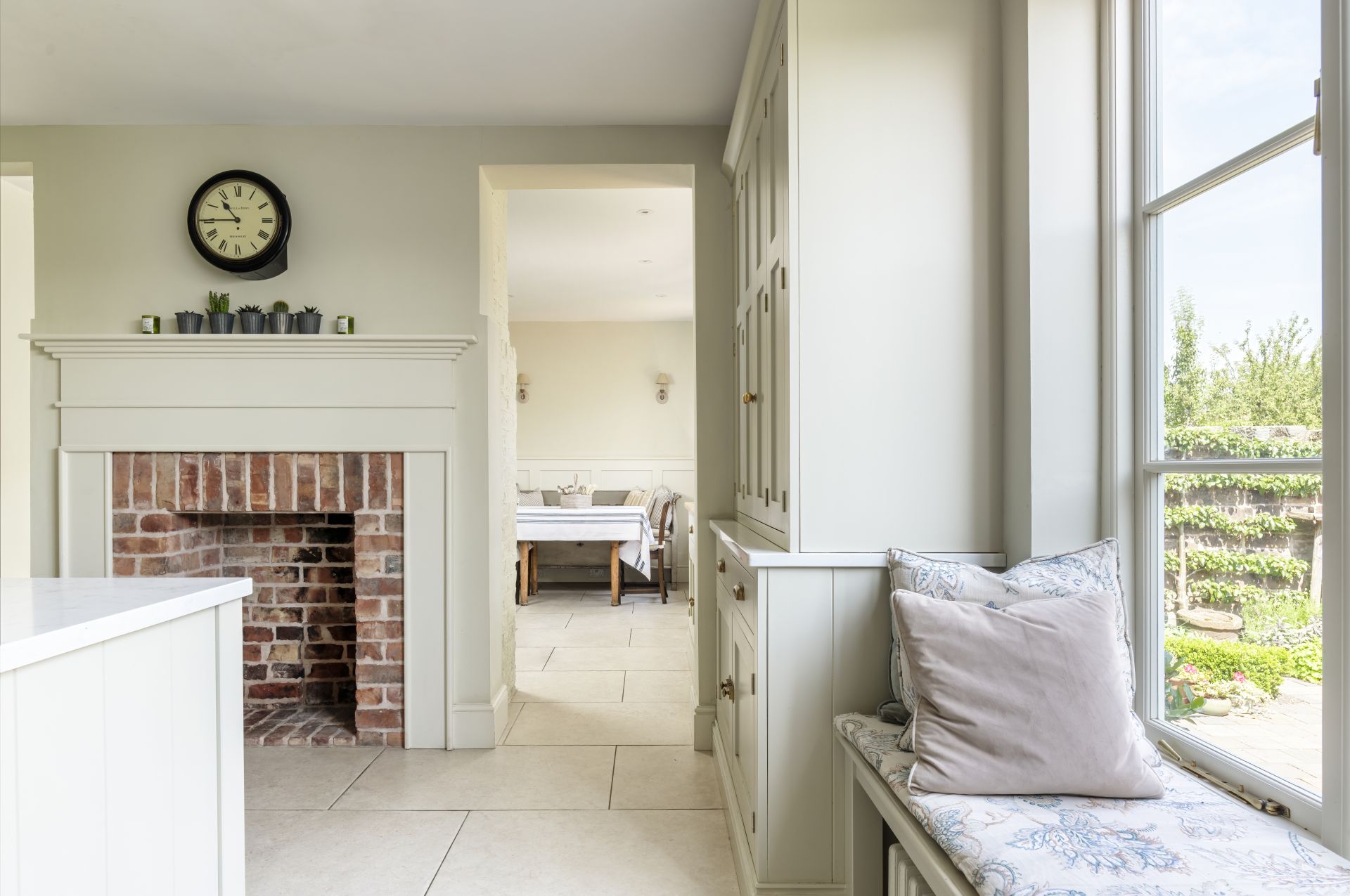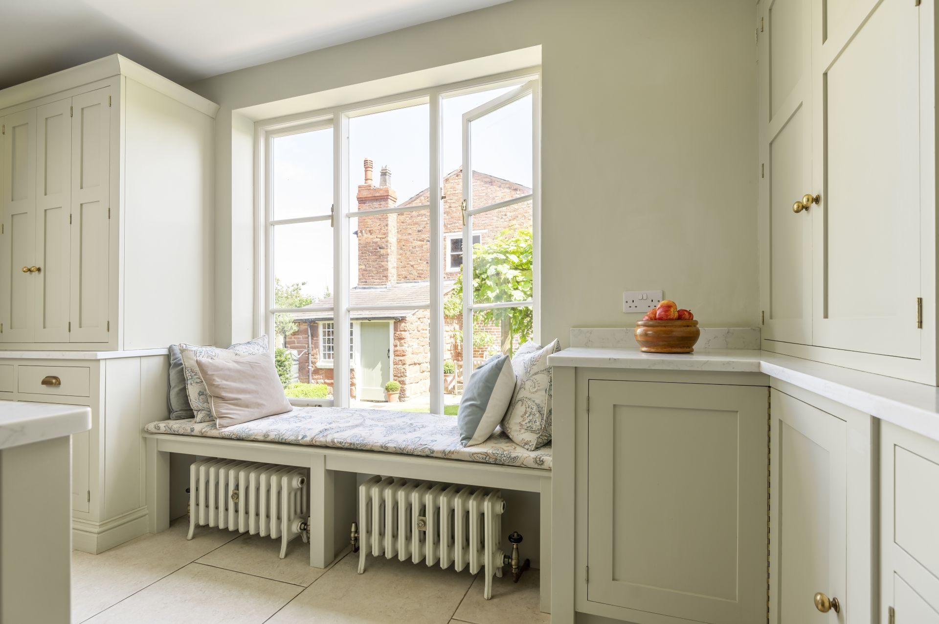 Located in Handbridge, Chester, this classically proportioned and elegantly styled traditional Shaker kitchen embodies timeless appeal. The in-frame cabinets have been hand-painted in a soft, light colour scheme, enhancing the natural movement of light throughout the room. Exquisite details such as the chimney breast mantel and a window seat housing two cast iron radiators add unique charm to the space.