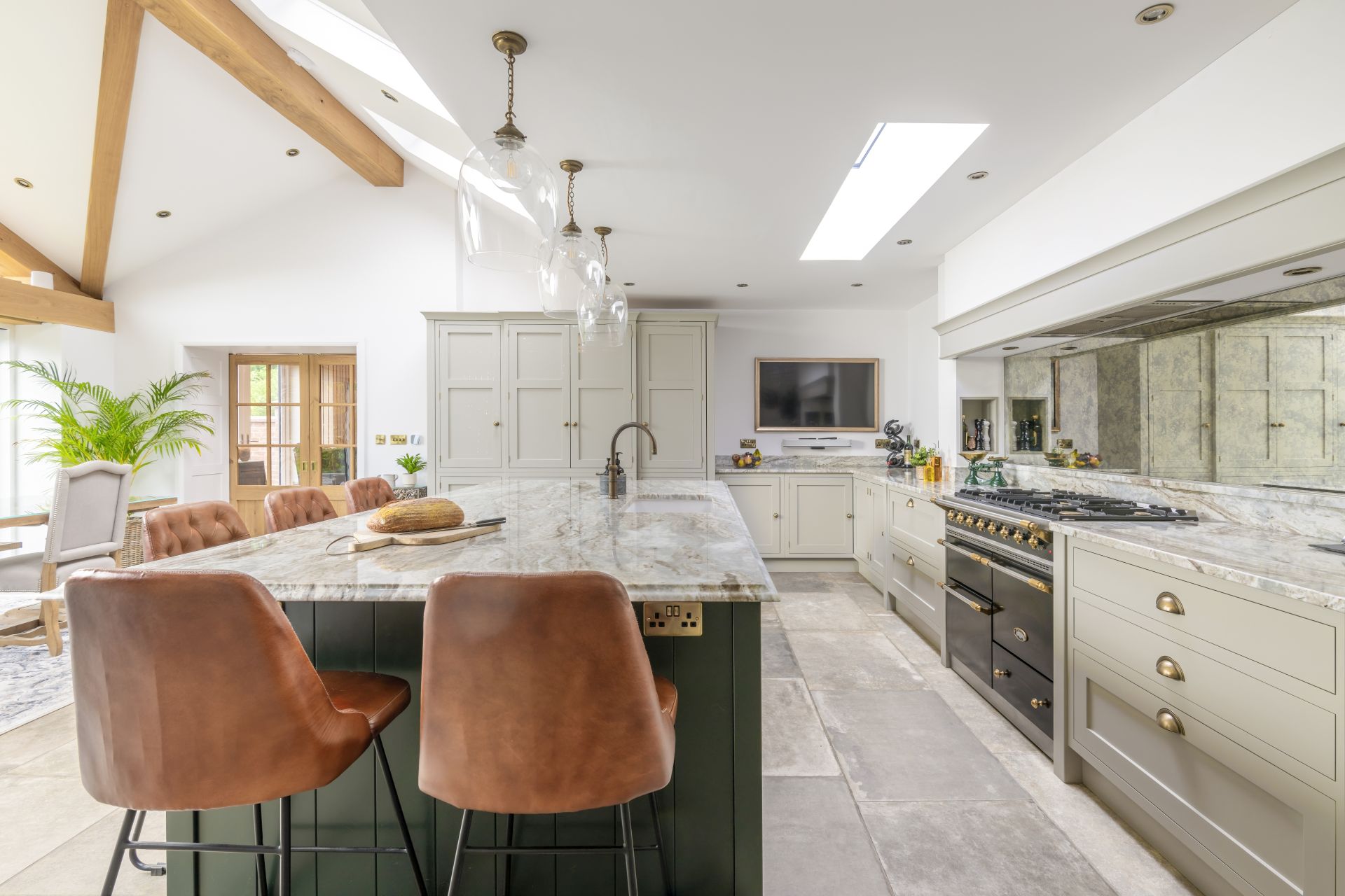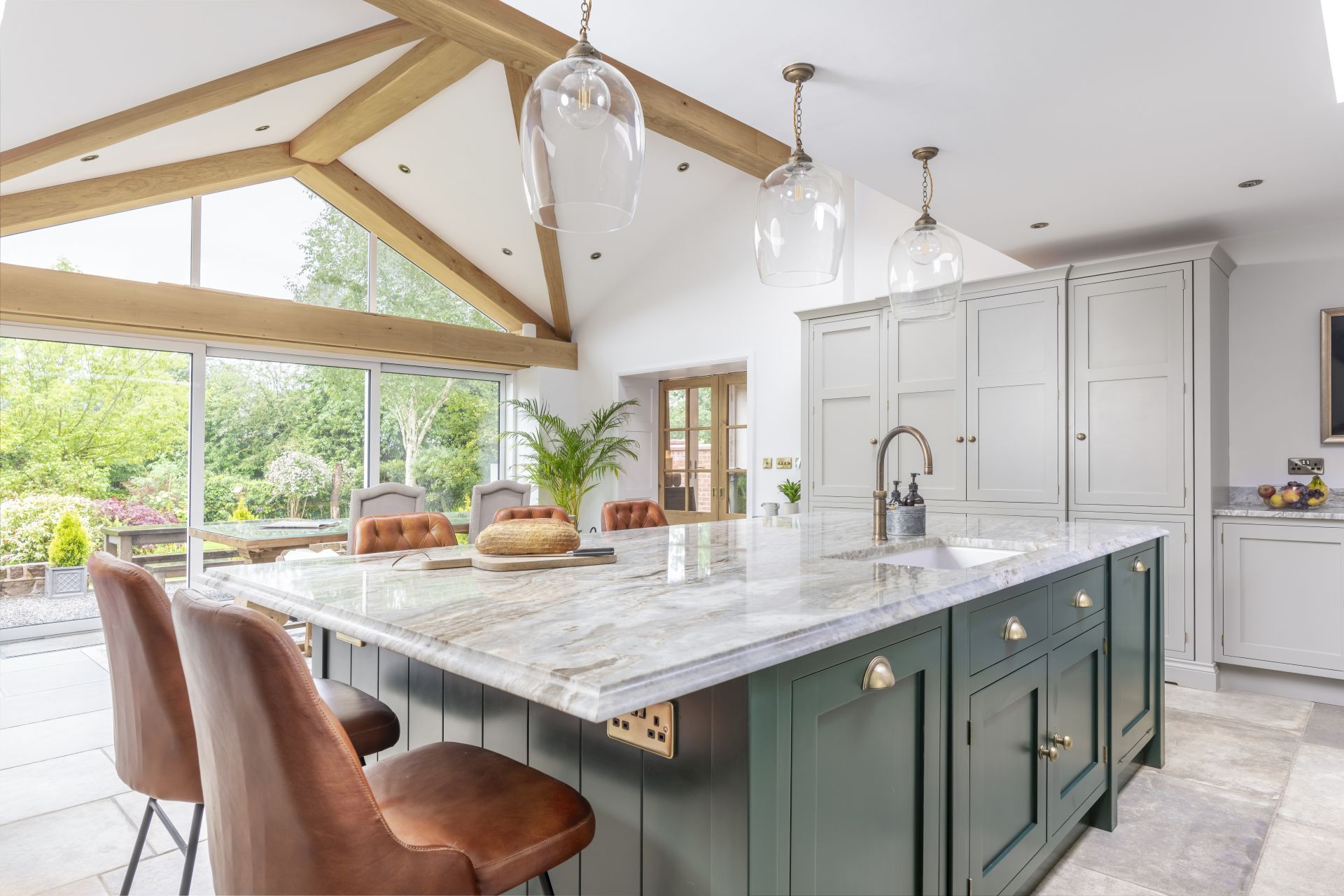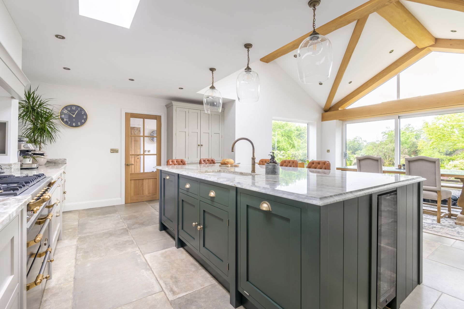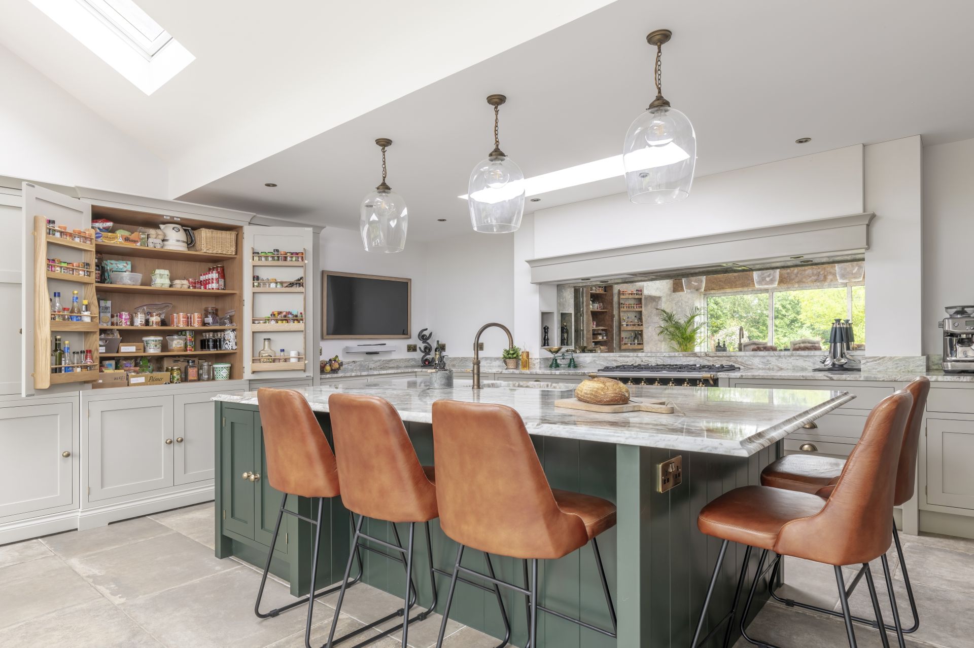 Situated in Tarporley, Cheshire, this Shaker-style bespoke kitchen combines traditional styling with practical features to create a cooking and entertaining space. Storage solutions like the larder and bi-fold drinks cabinet offer stylish and easy-access storage. The large kitchen island allows guests to relax and socialise, while the host serves up delicious food. The vaulted ceiling provides a dramatic effect, while the large glass patio doors afford views of the garden and flood the room with natural light.