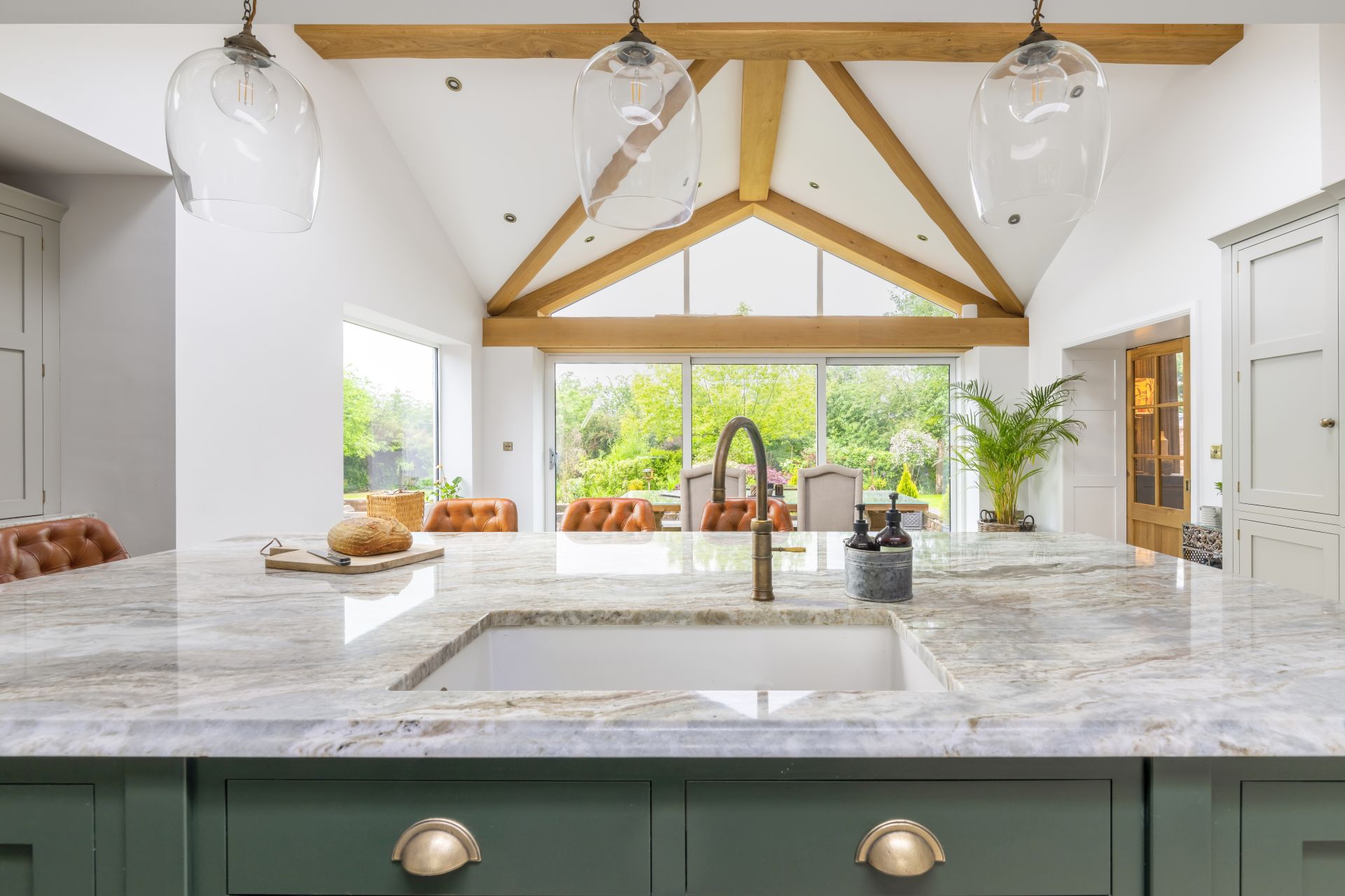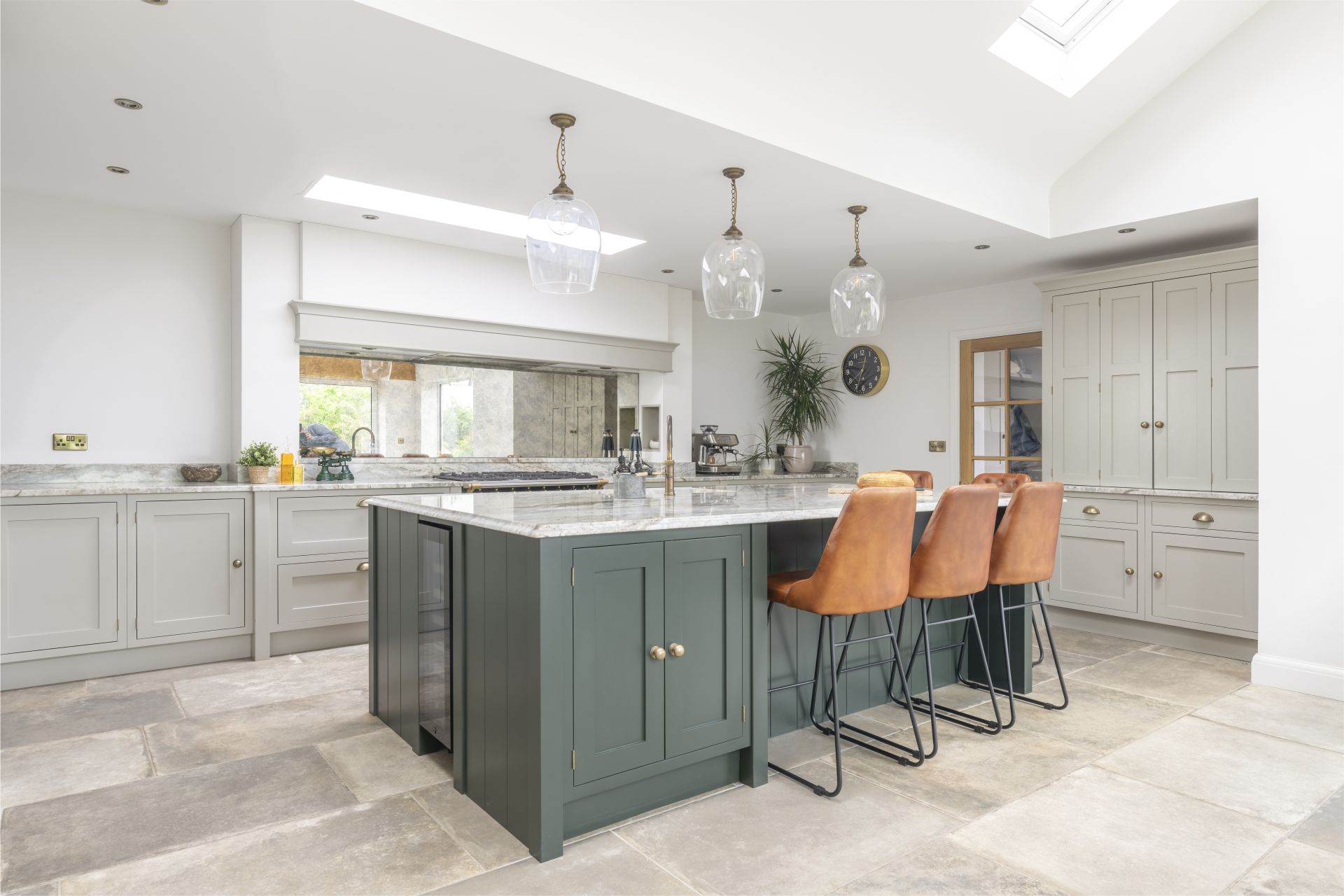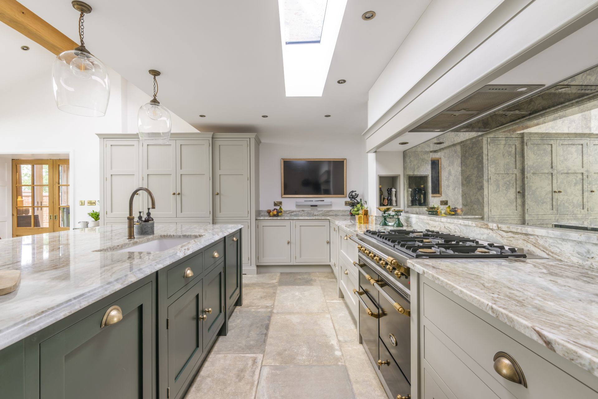 Situated in Tarporley, Cheshire, this Shaker-style bespoke kitchen combines traditional styling with practical features to create a cooking and entertaining space. Storage solutions like the larder and bi-fold drinks cabinet offer stylish and easy-access storage. The large kitchen island allows guests to relax and socialise, while the host serves up delicious food. The vaulted ceiling provides a dramatic effect, while the large glass patio doors afford views of the garden and flood the room with natural light.