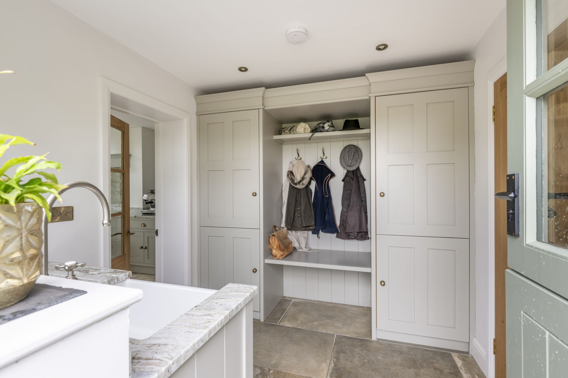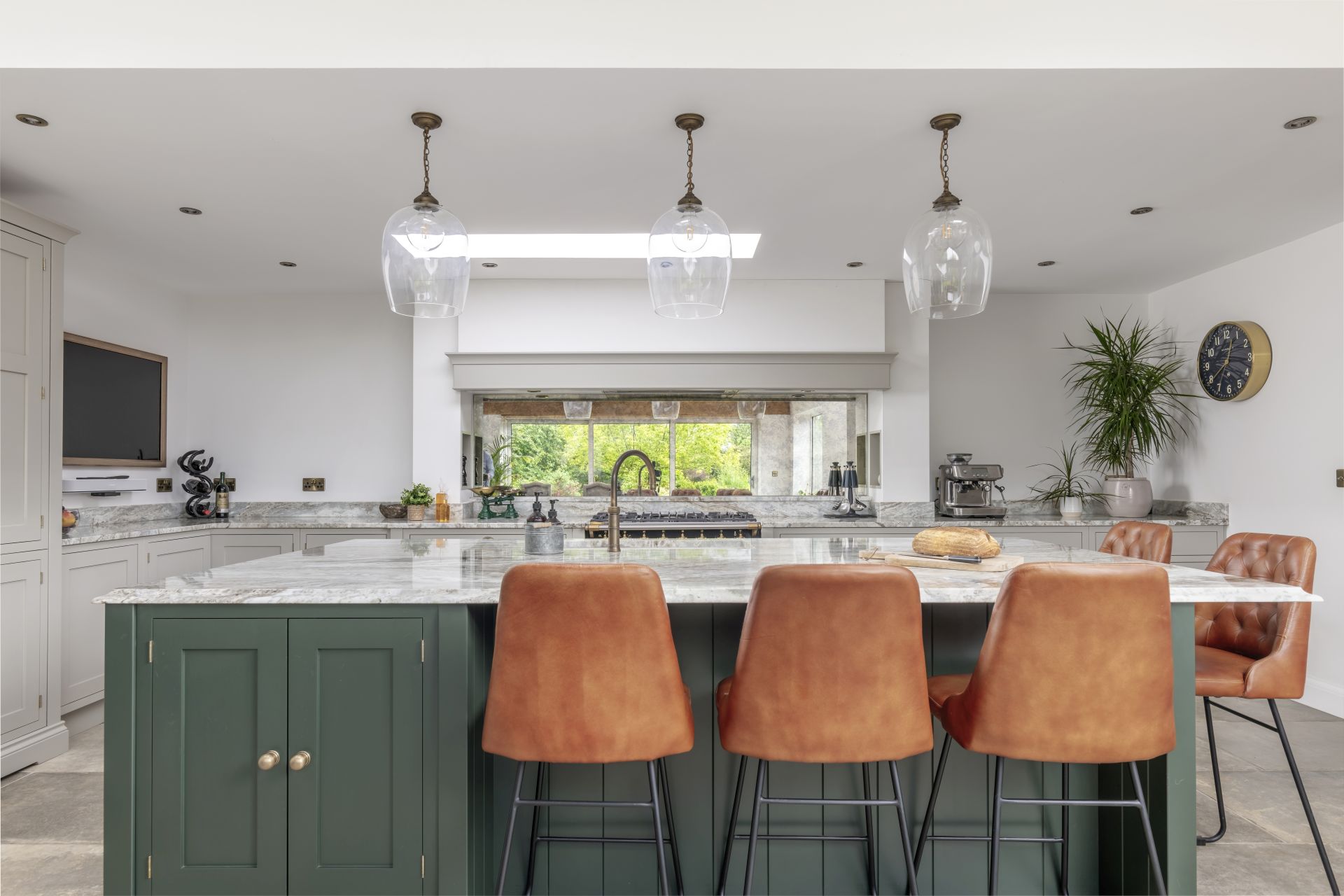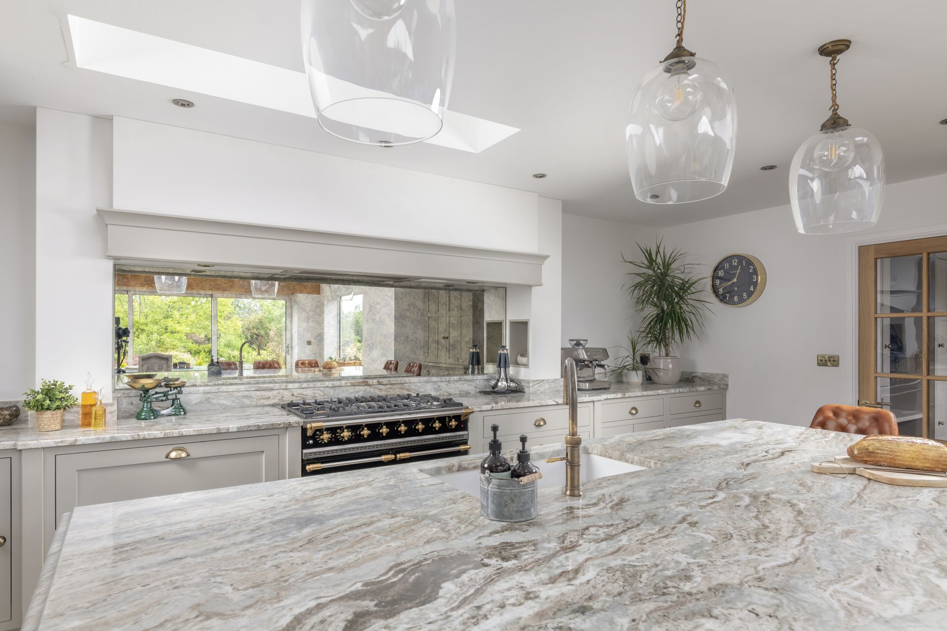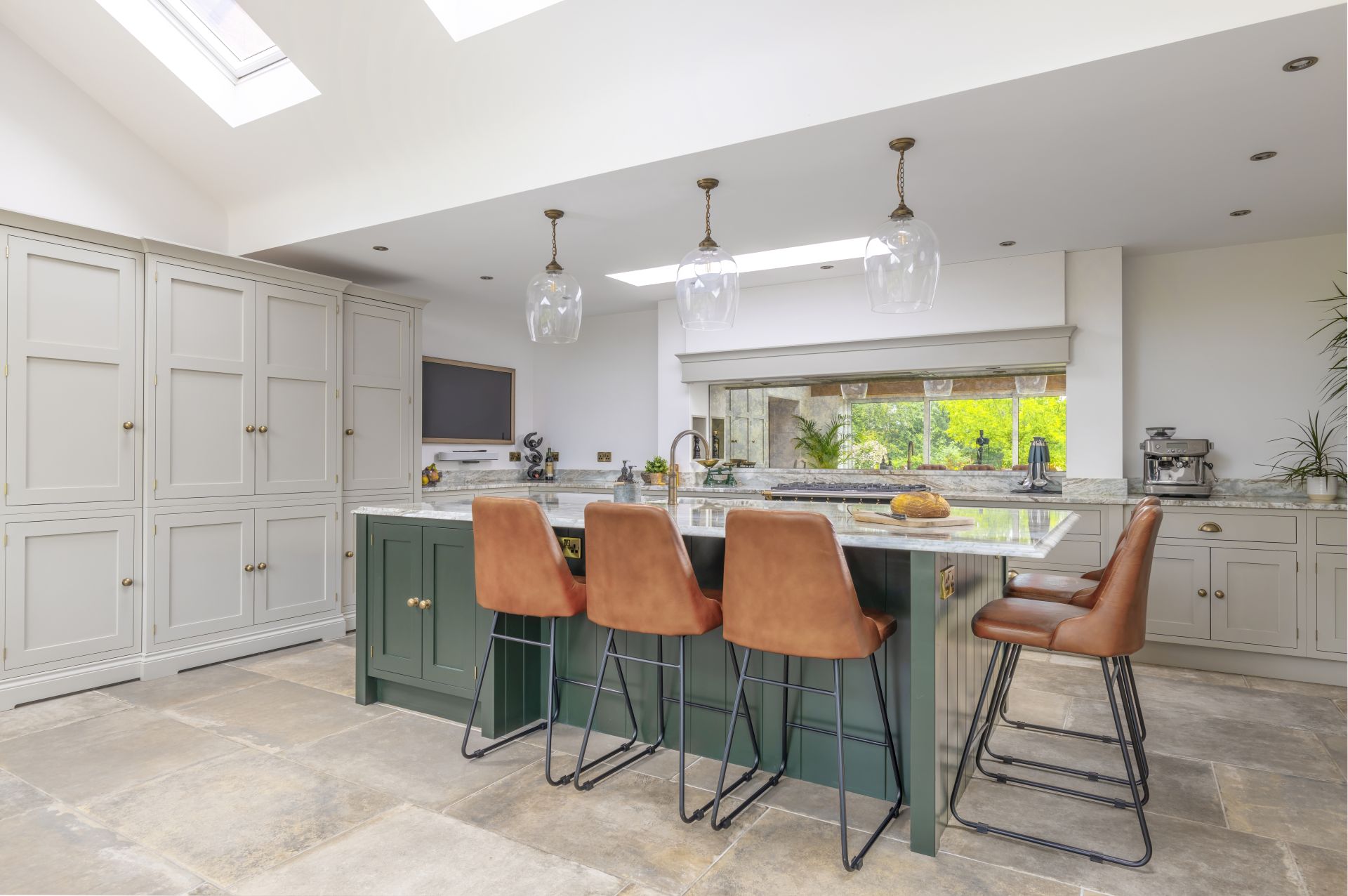 Situated in Tarporley, Cheshire, this Shaker-style bespoke kitchen combines traditional styling with practical features to create a cooking and entertaining space. Storage solutions like the larder and bi-fold drinks cabinet offer stylish and easy-access storage. The large kitchen island allows guests to relax and socialise, while the host serves up delicious food. The vaulted ceiling provides a dramatic effect, while the large glass patio doors afford views of the garden and flood the room with natural light.