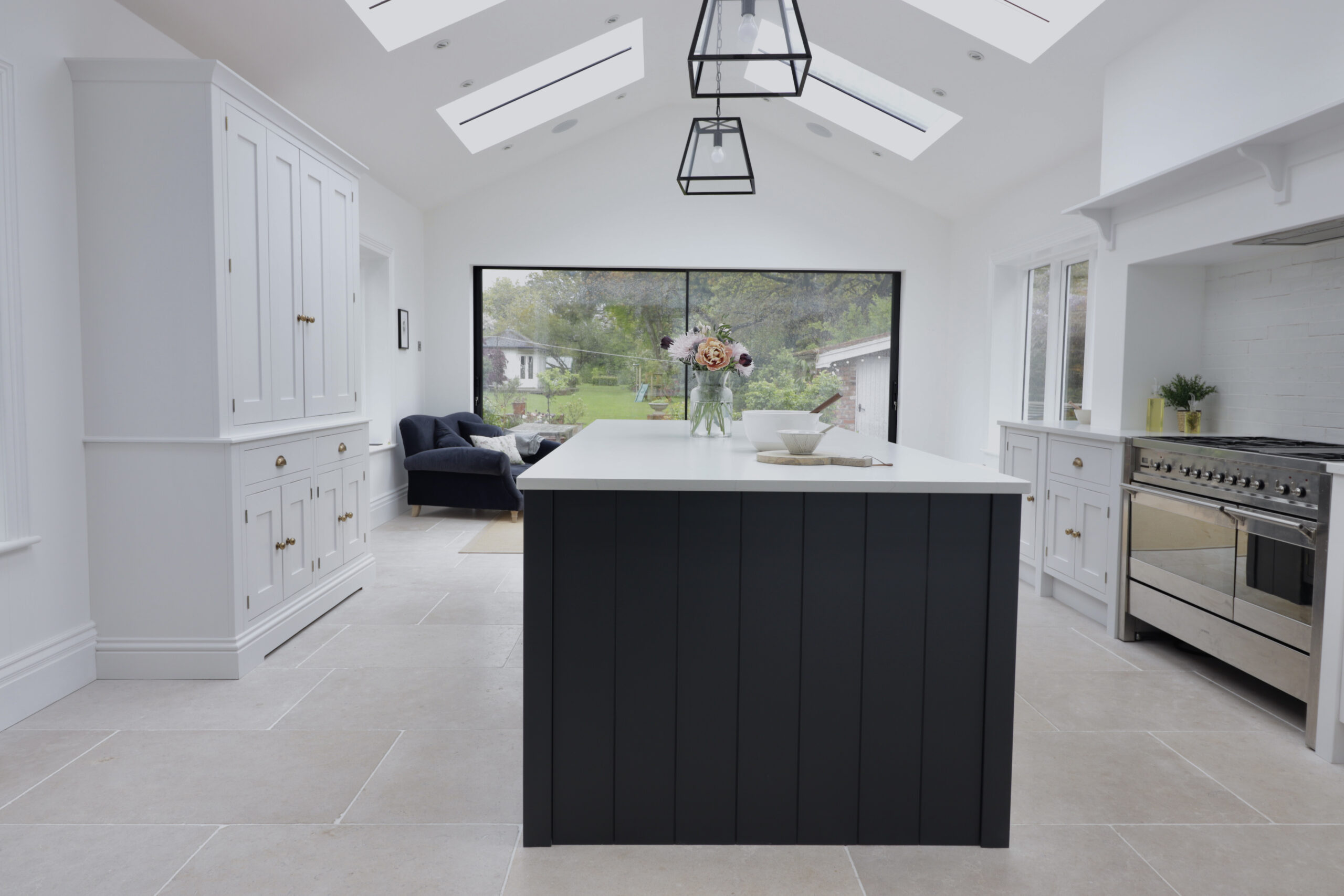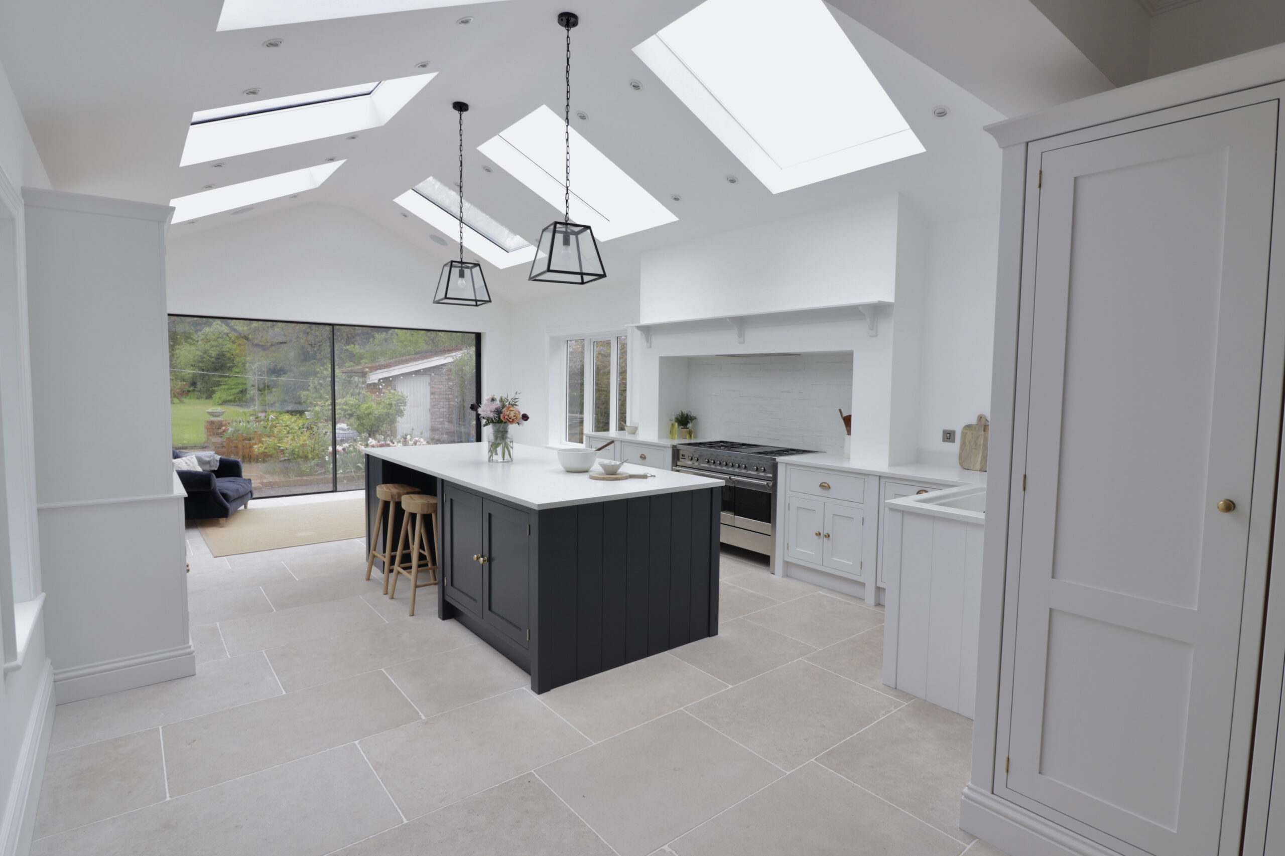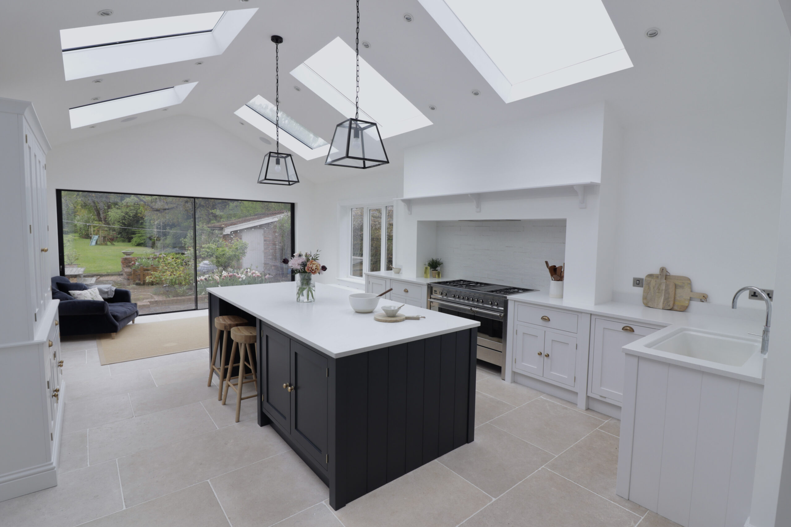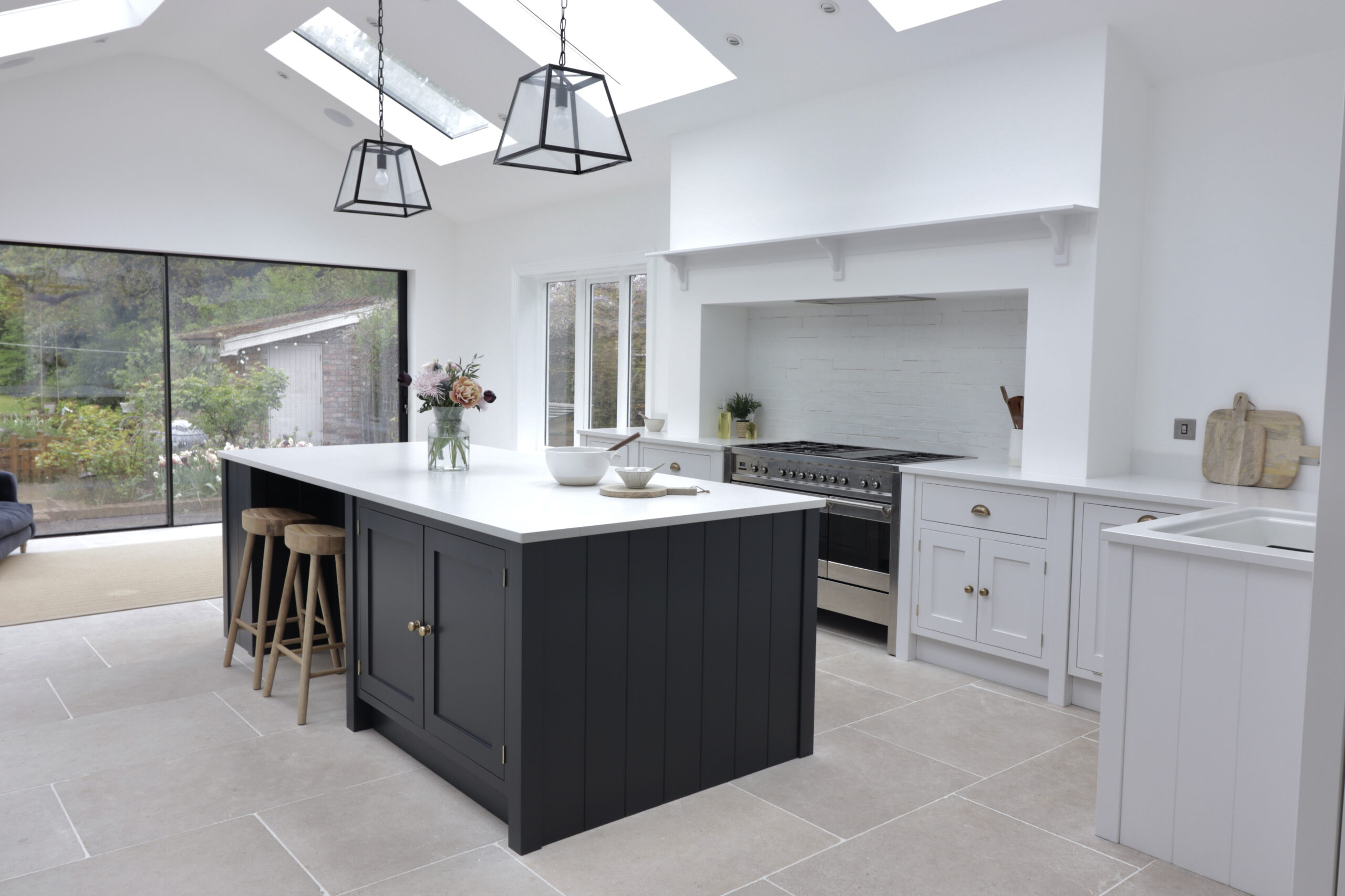 This bespoke inframe kitchen brings a traditional design into the modern age. Natural light streams in from the feature windows, doors and skylights, setting off the shaker kitchen’s bold and contrasting colours. The stone floor tiles and burnished brass handles add a subtle warmth to the overall design theme.