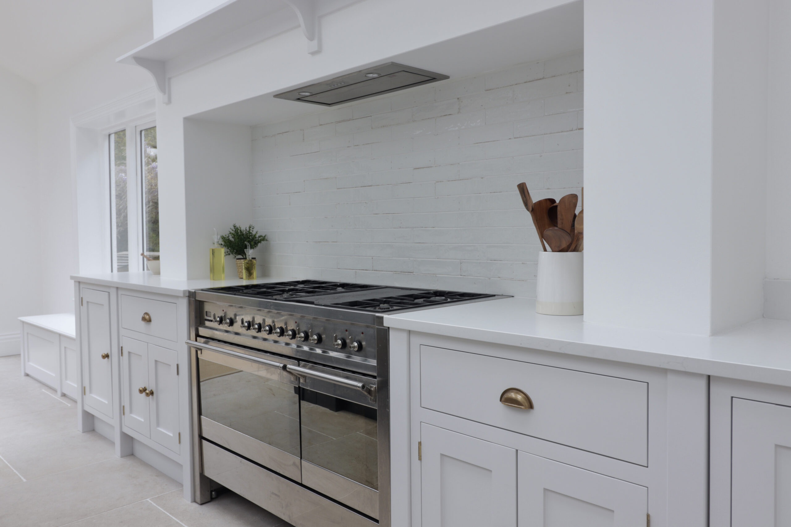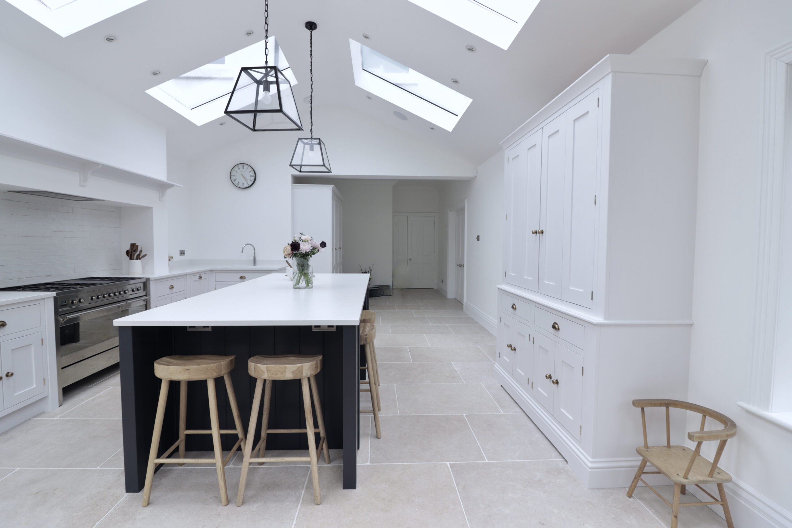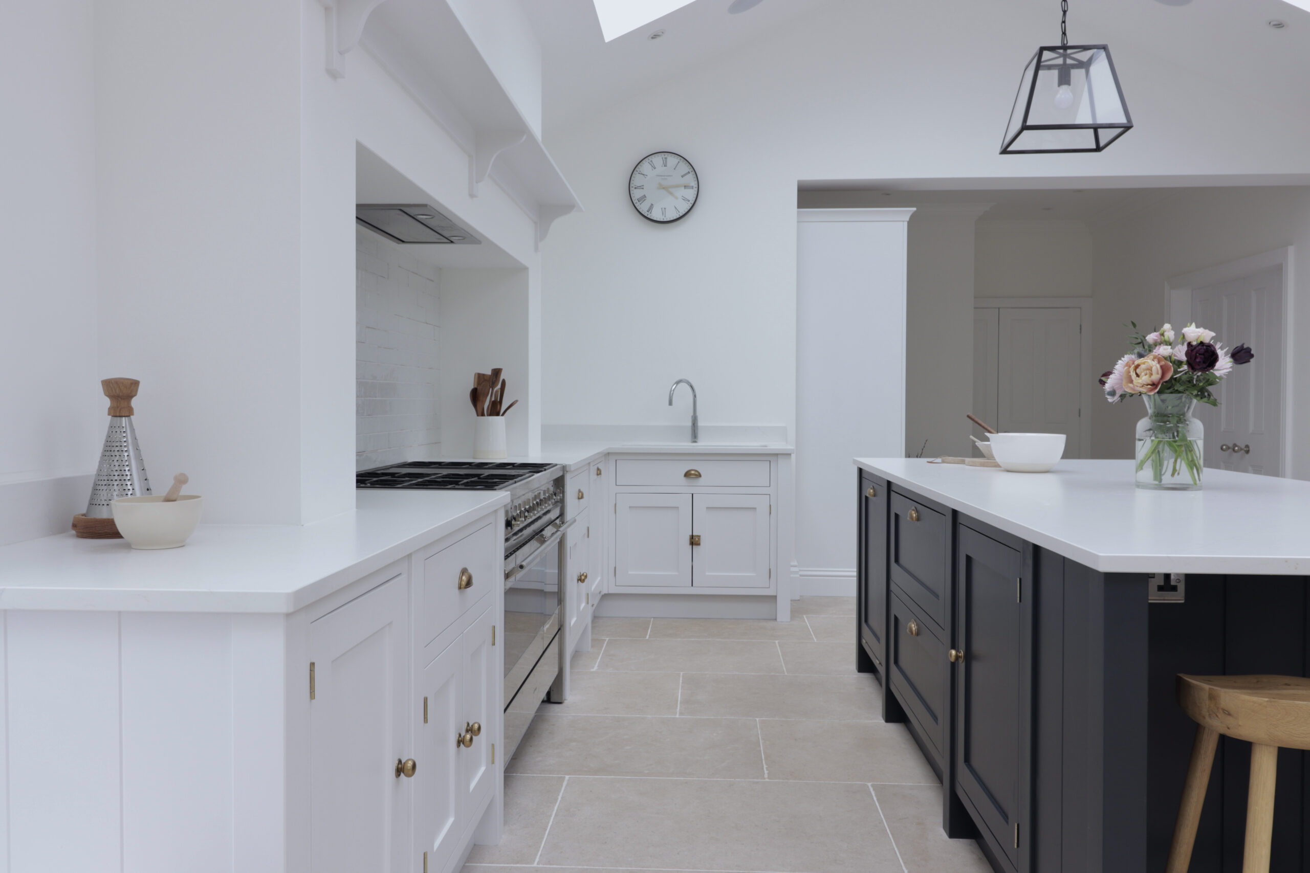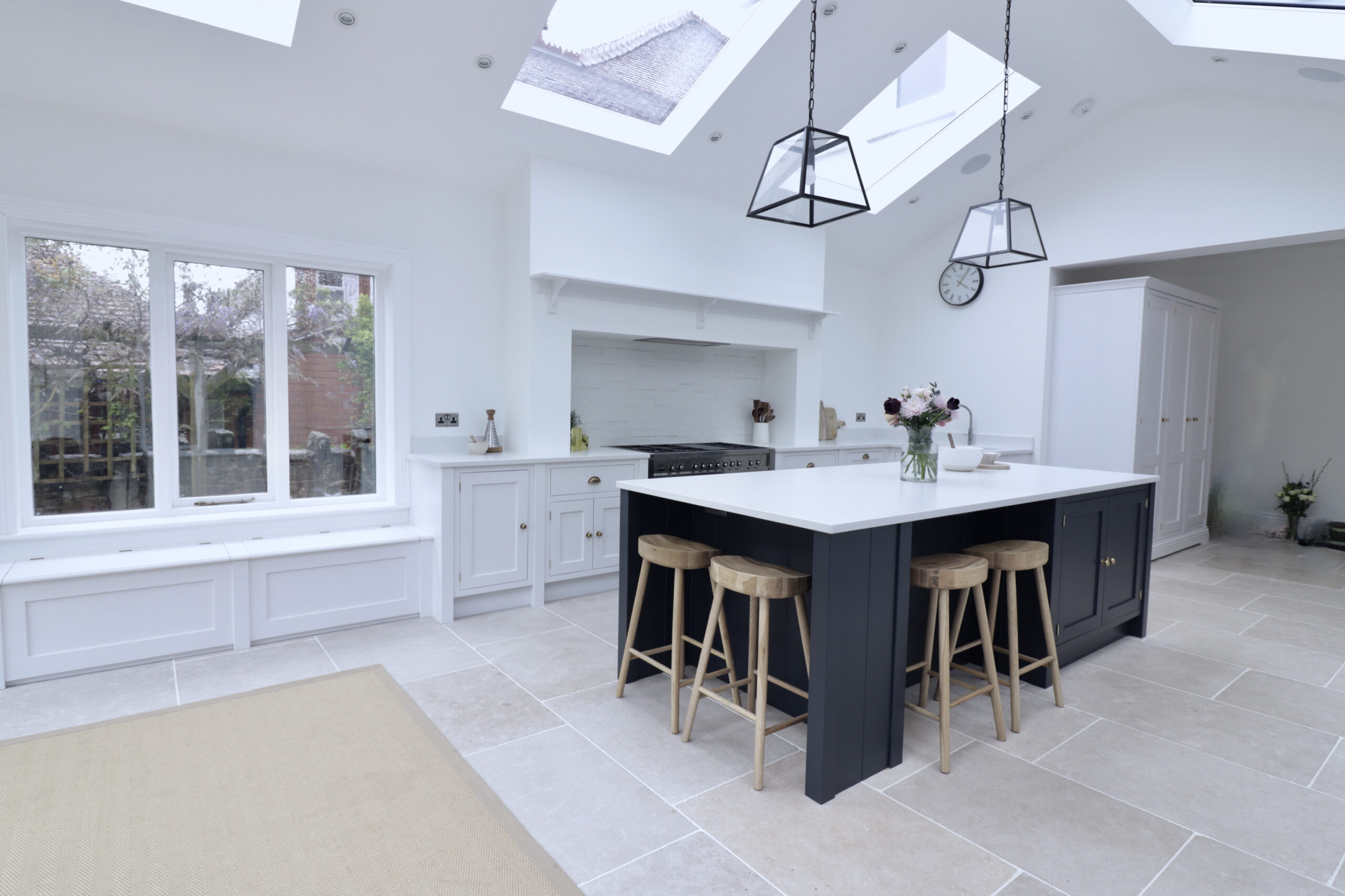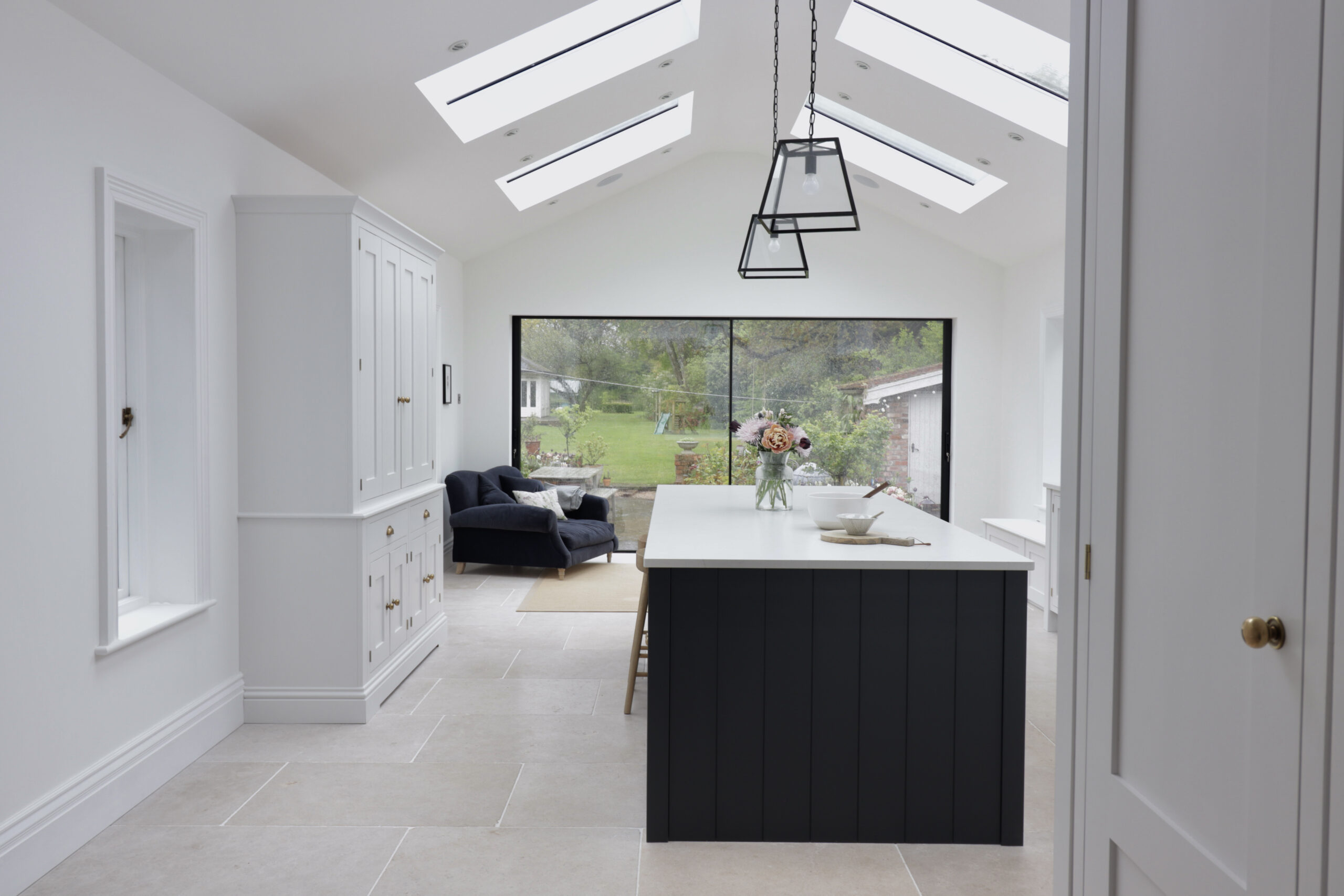This bespoke inframe kitchen brings a traditional design into the modern age. Natural light streams in from the feature windows, doors and skylights, setting off the shaker kitchen’s bold and contrasting colours. The stone floor tiles and burnished brass handles add a subtle warmth to the overall design theme.