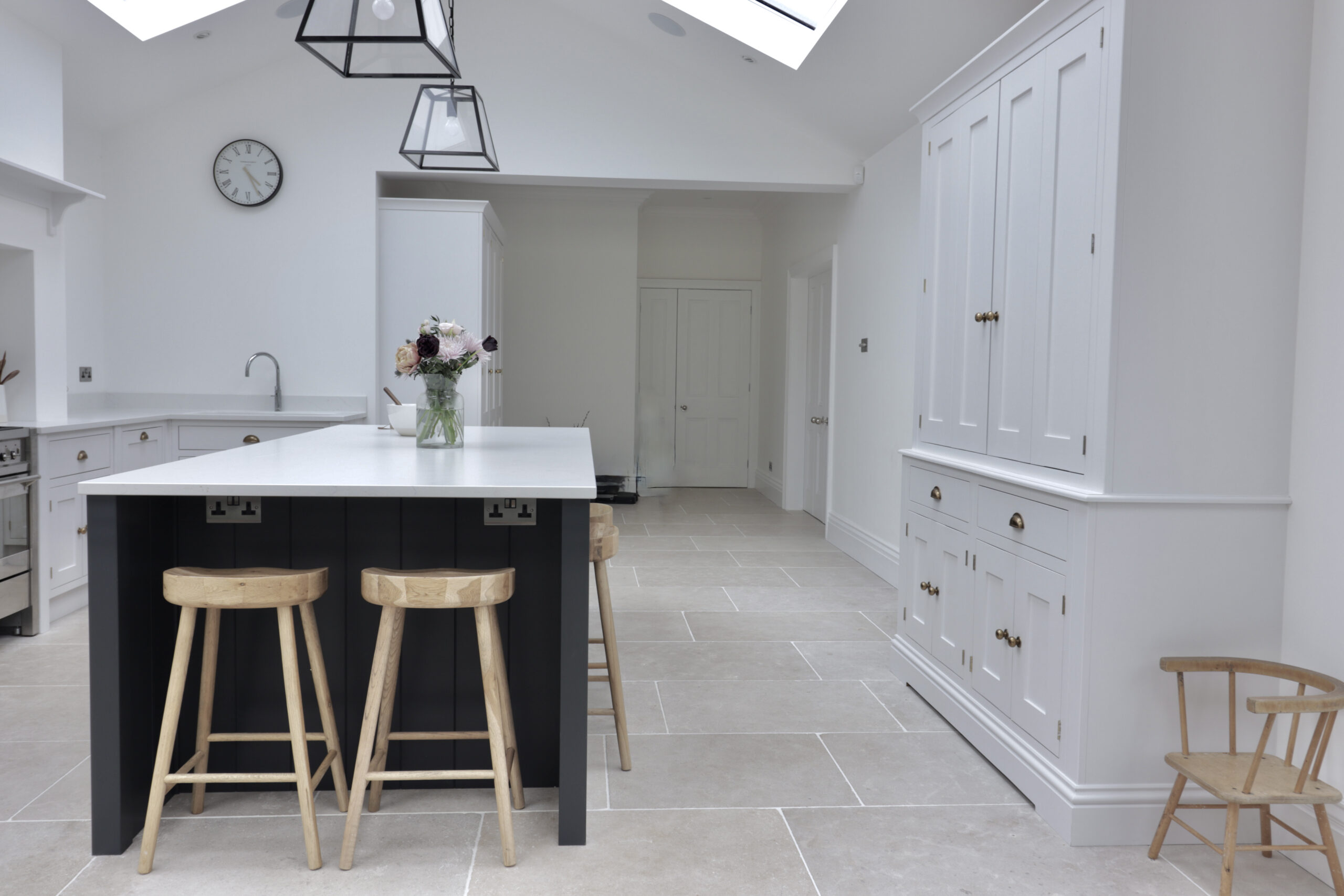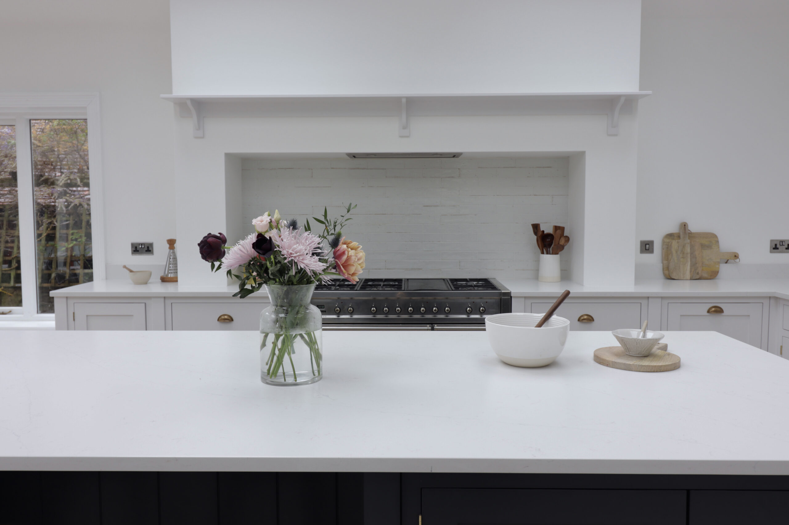 The dark inky blue hand-painted shaker kitchen island complements the quartz worktop’s light tones with aplomb. The result is a truly stunning handcrafted kitchen which is ideal for family life.