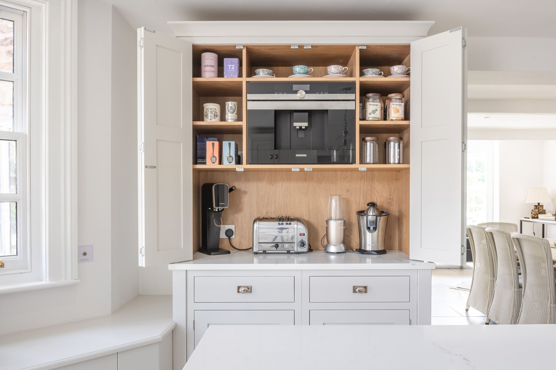 Situated in Rowton, Chester, this bespoke handmade kitchen with strong, clean lines is a beautiful example of the contemporary and timeless appeal of Shaker-style design.