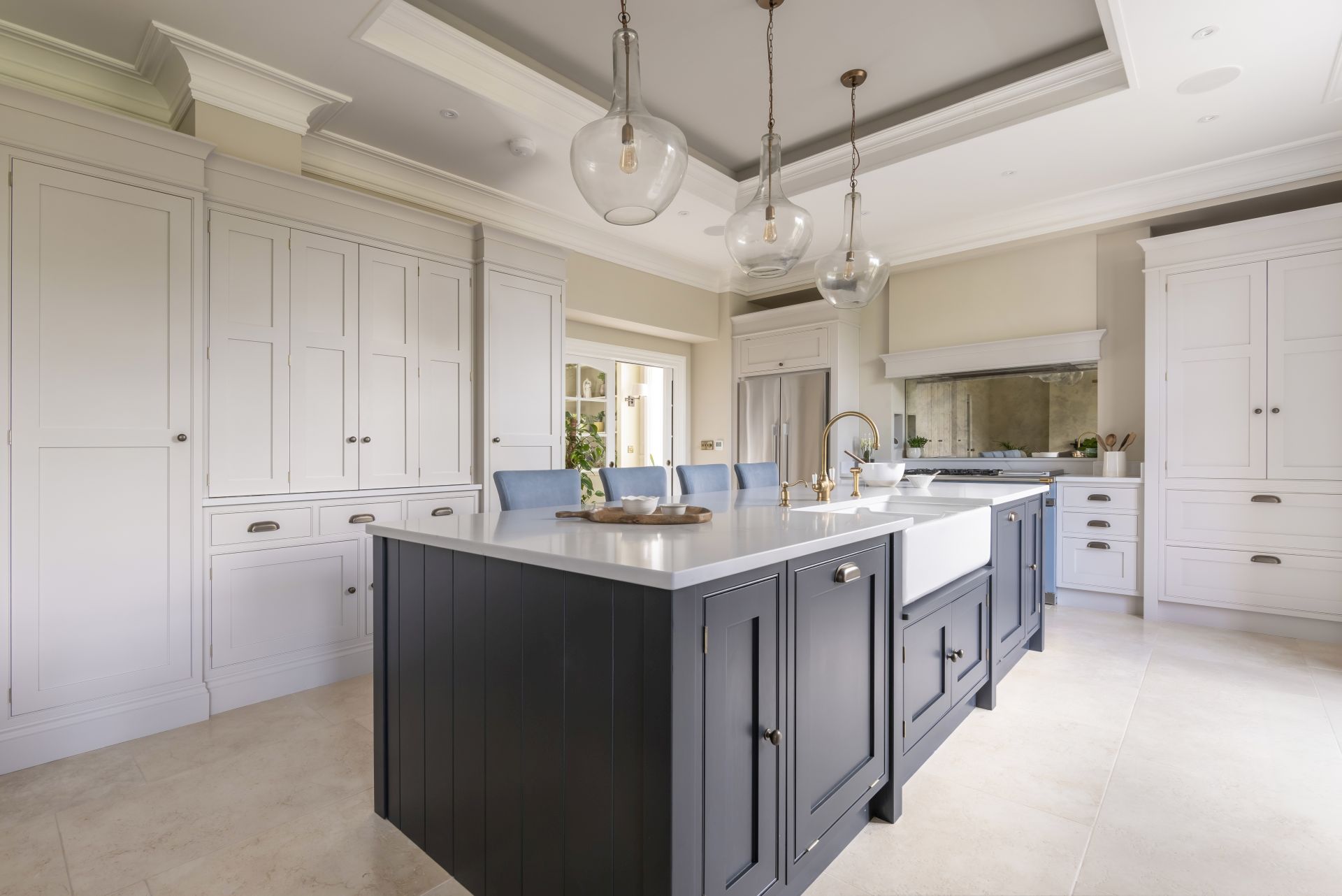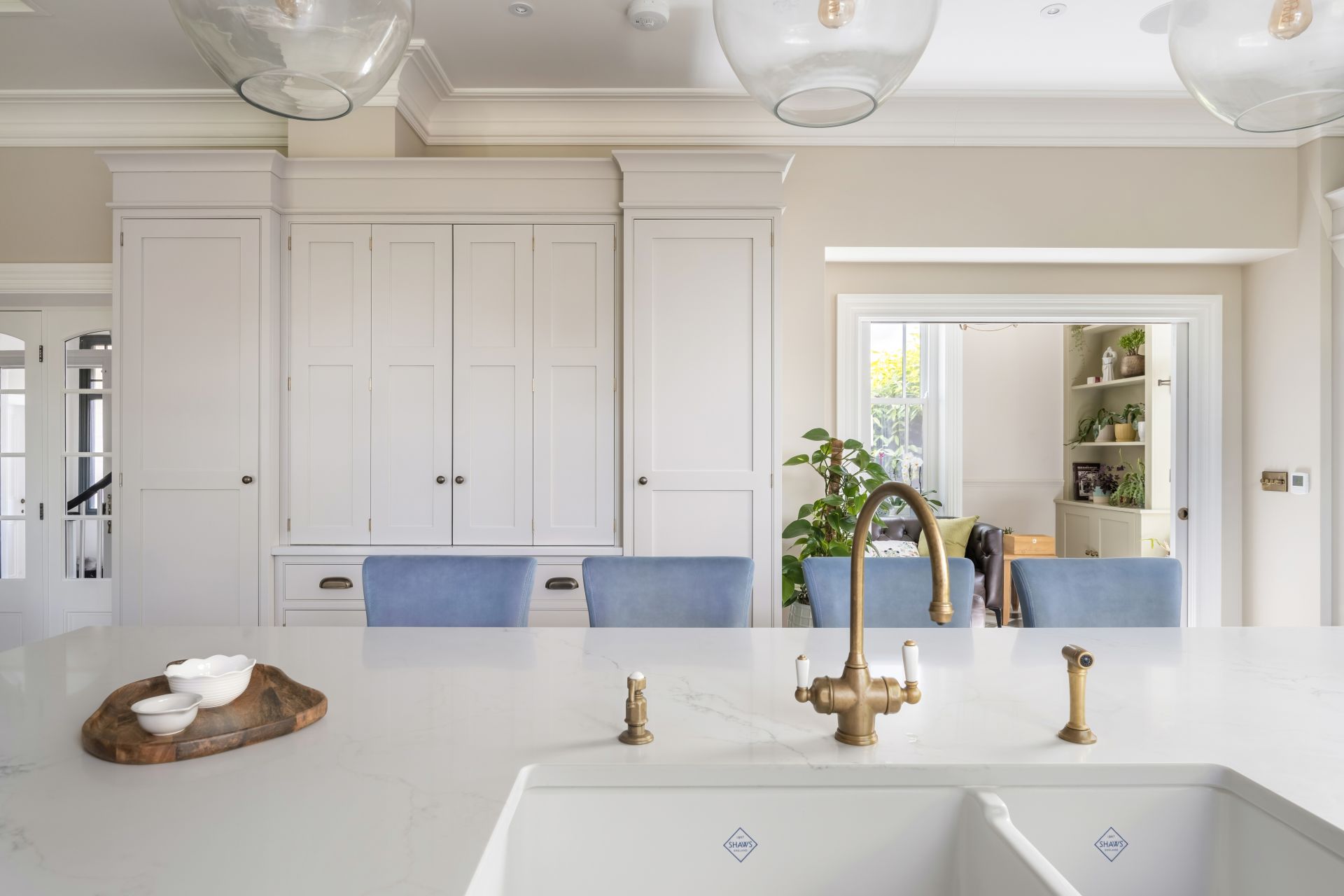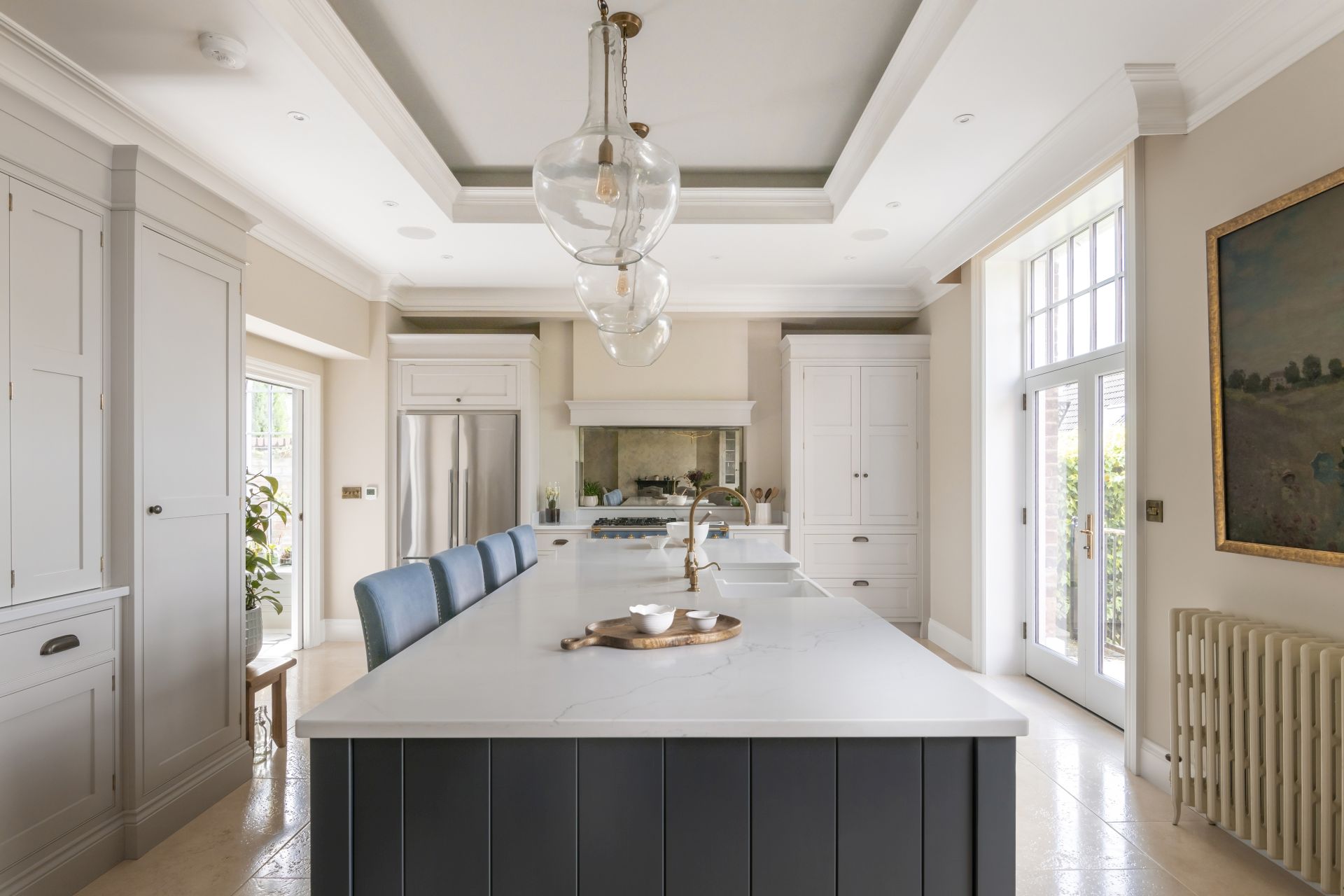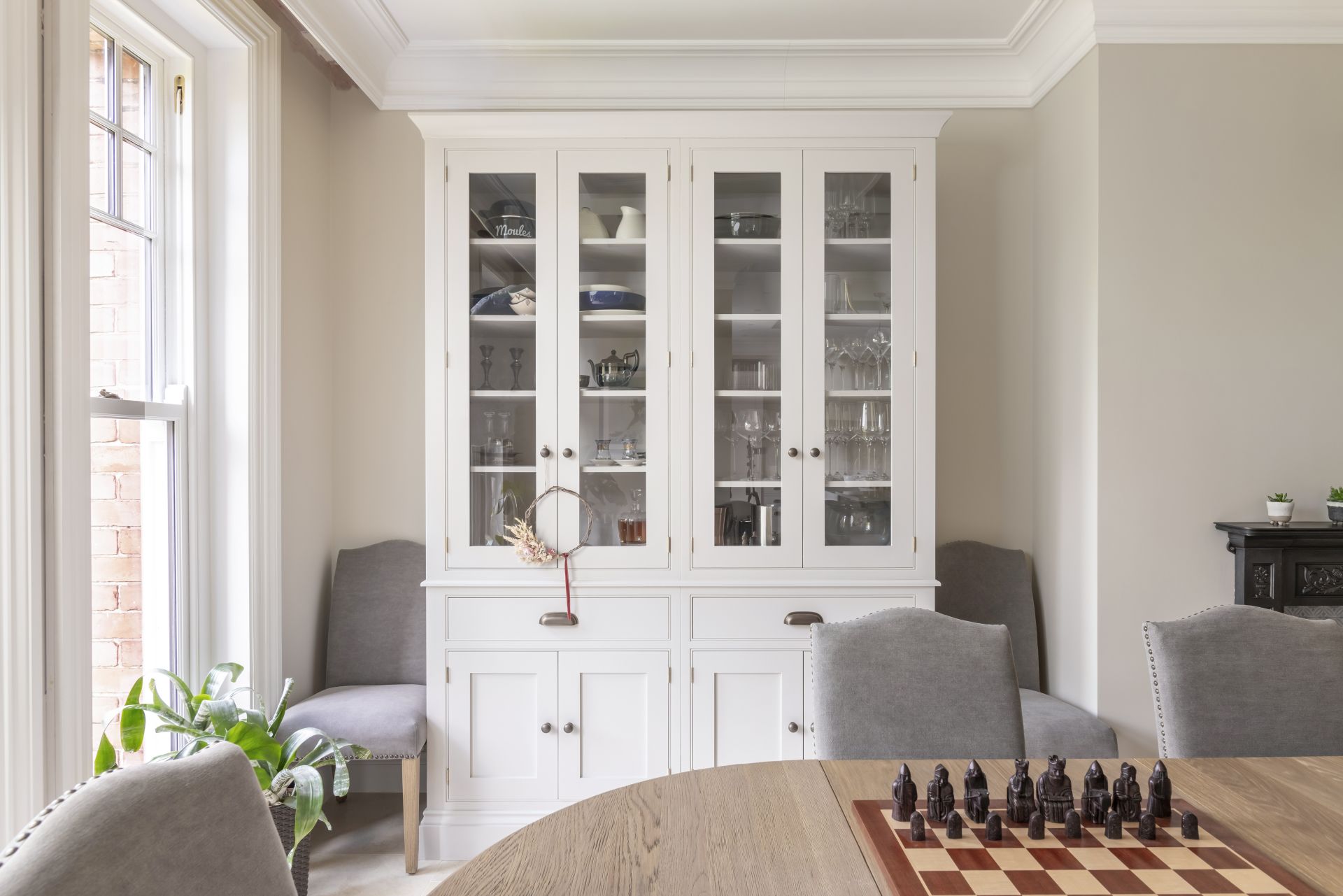 The bespoke Shaker-style kitchen brings traditional design into the modern age. The handcrafted kitchen has a wealth of storage solutions, including a freestanding larder and a freestanding glazed dresser/bookcase. The cabinetry is crowned with a two-tier cornice, which extends the cabinet heights to complement the beautifully detailed high ceilings.