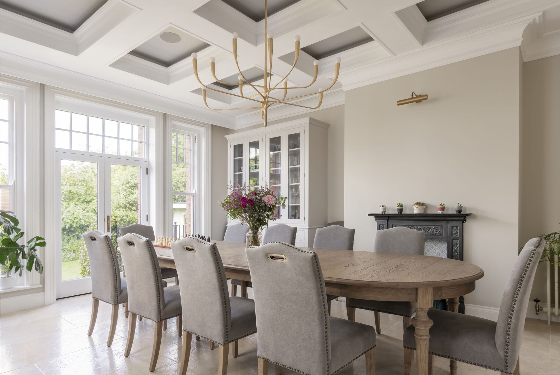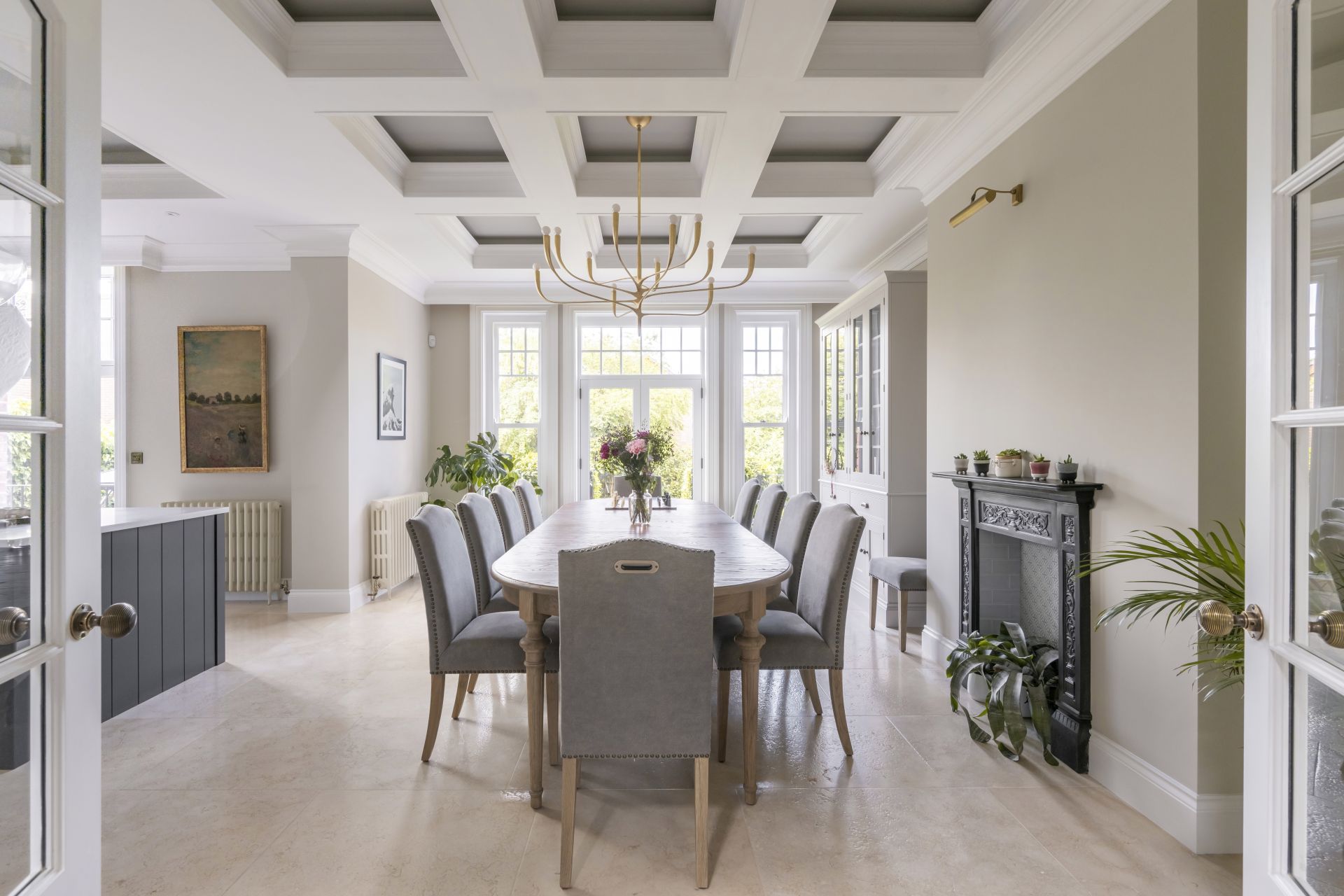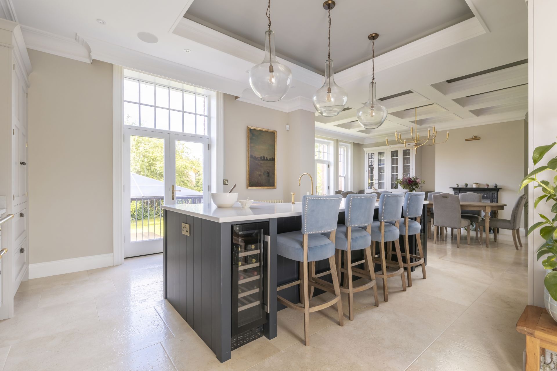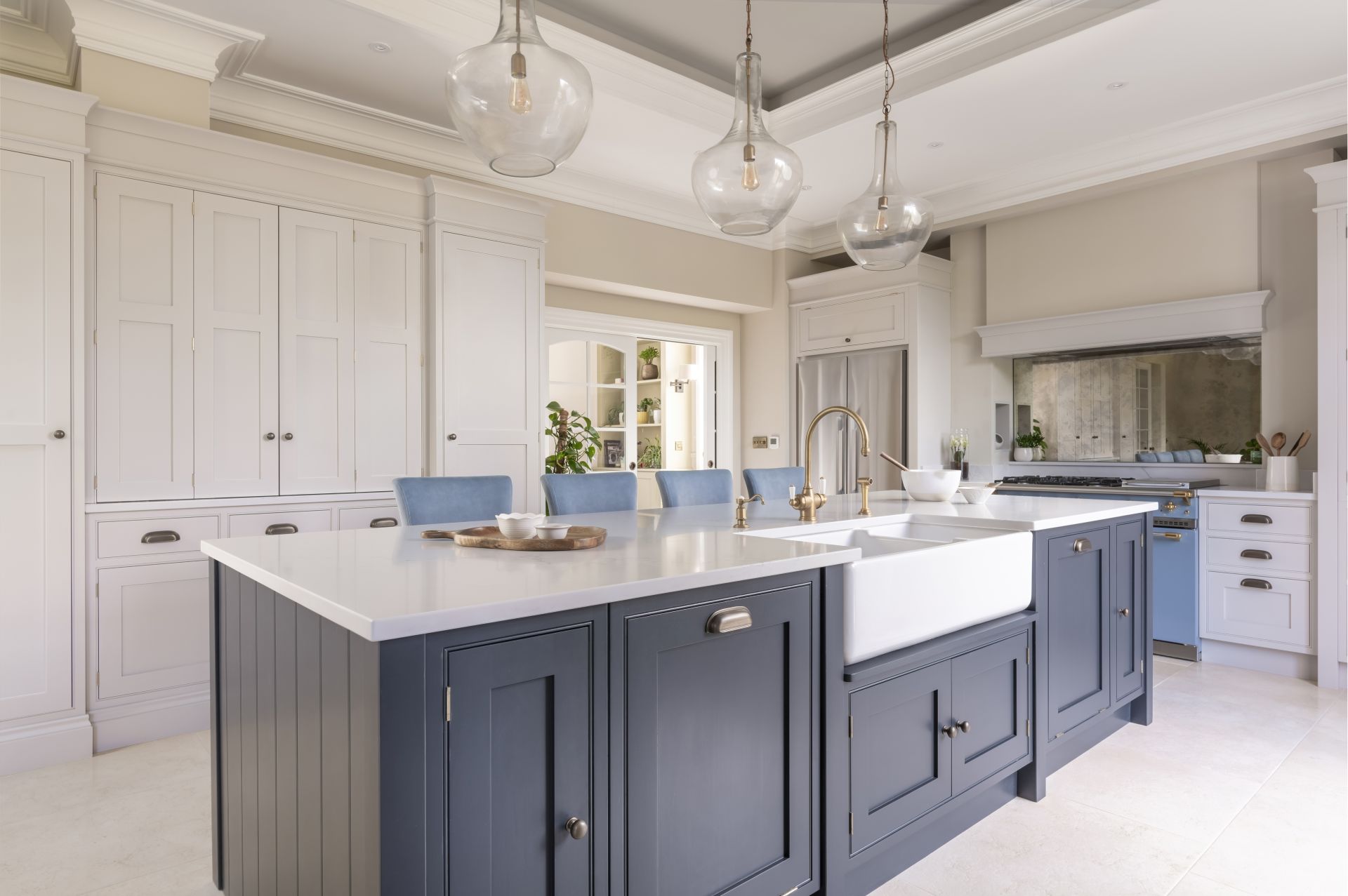 The bespoke Shaker-style kitchen brings traditional design into the modern age. The handcrafted kitchen has a wealth of storage solutions, including a freestanding larder and a freestanding glazed dresser/bookcase. The cabinetry is crowned with a two-tier cornice, which extends the cabinet heights to complement the beautifully detailed high ceilings.