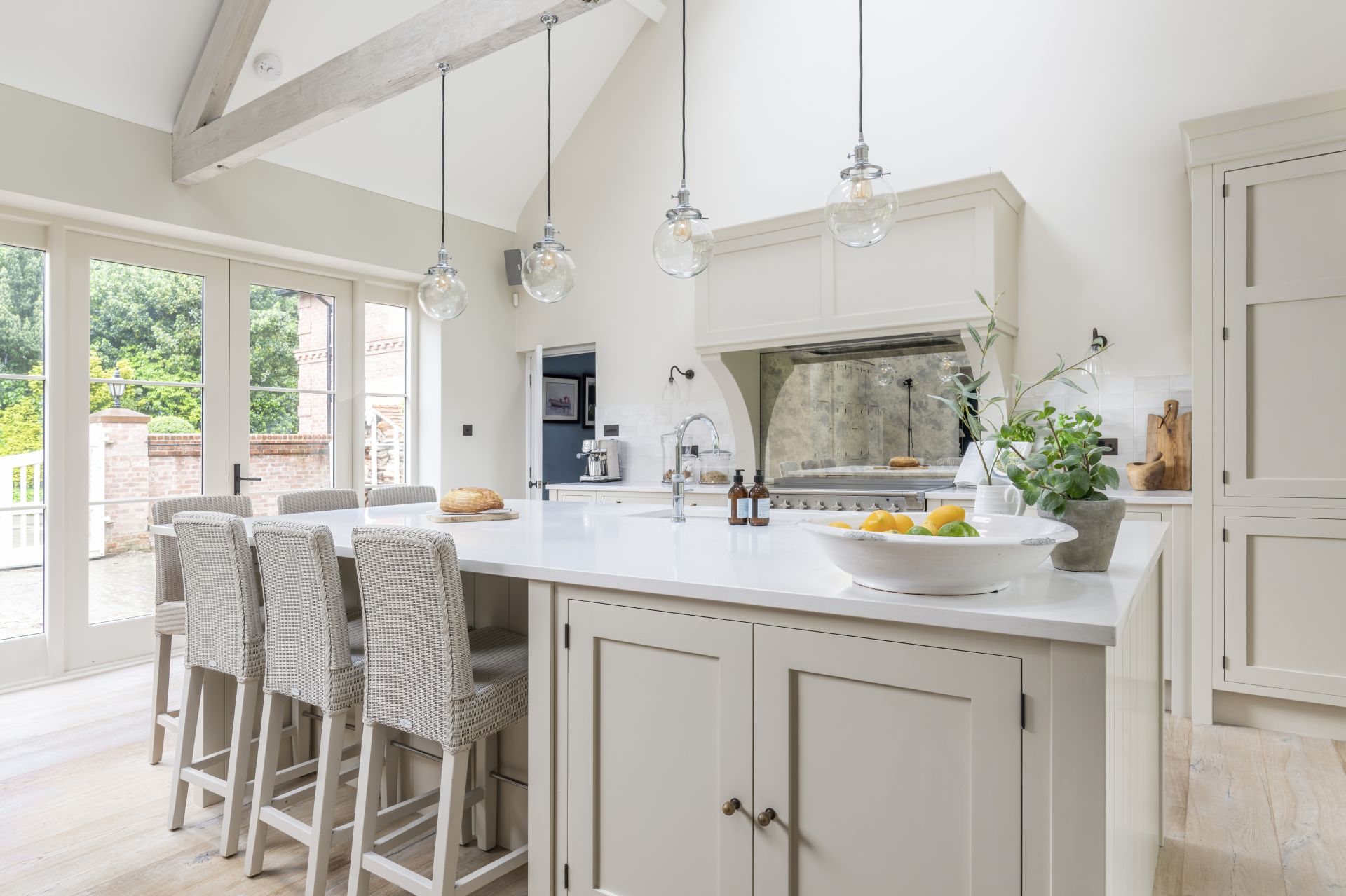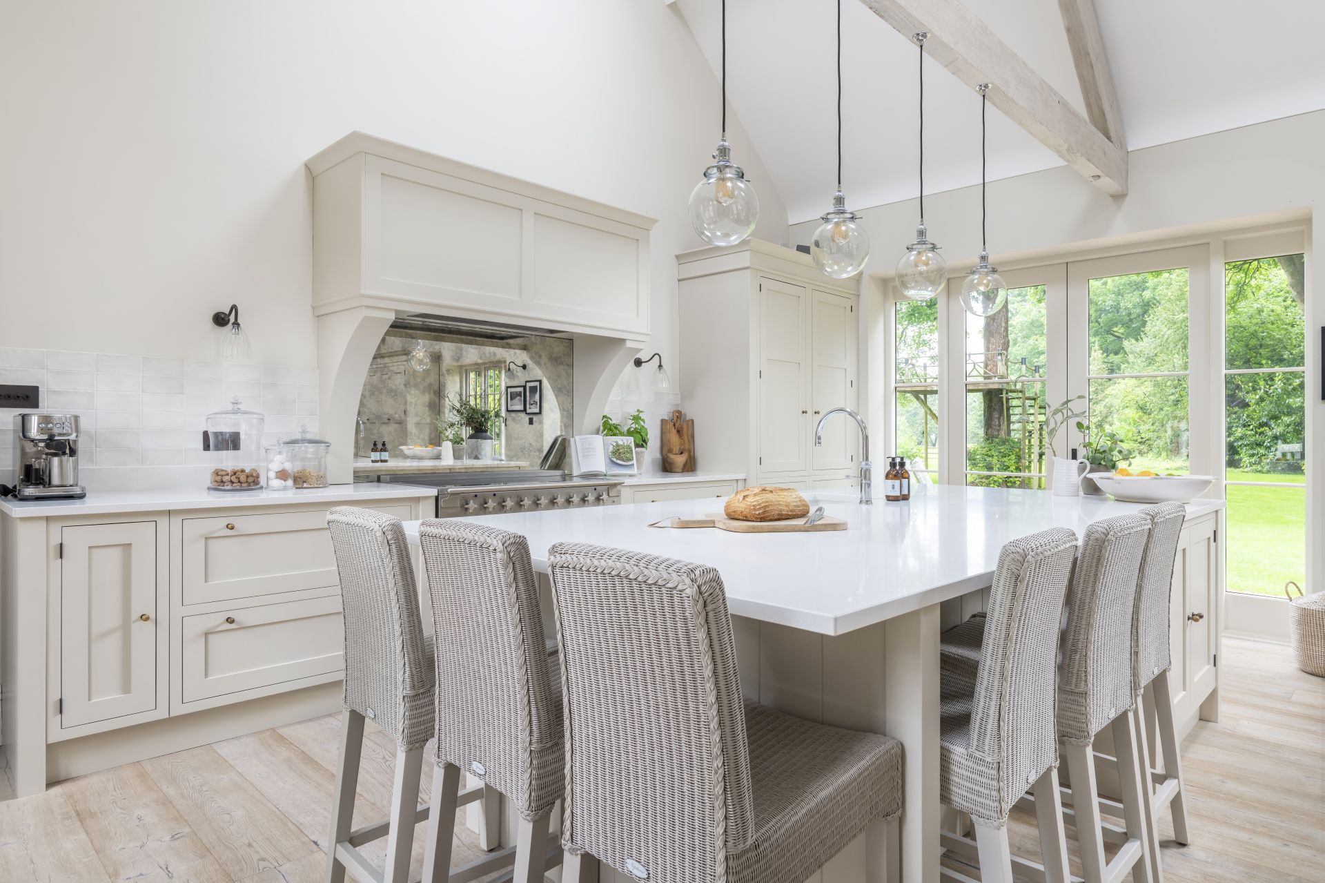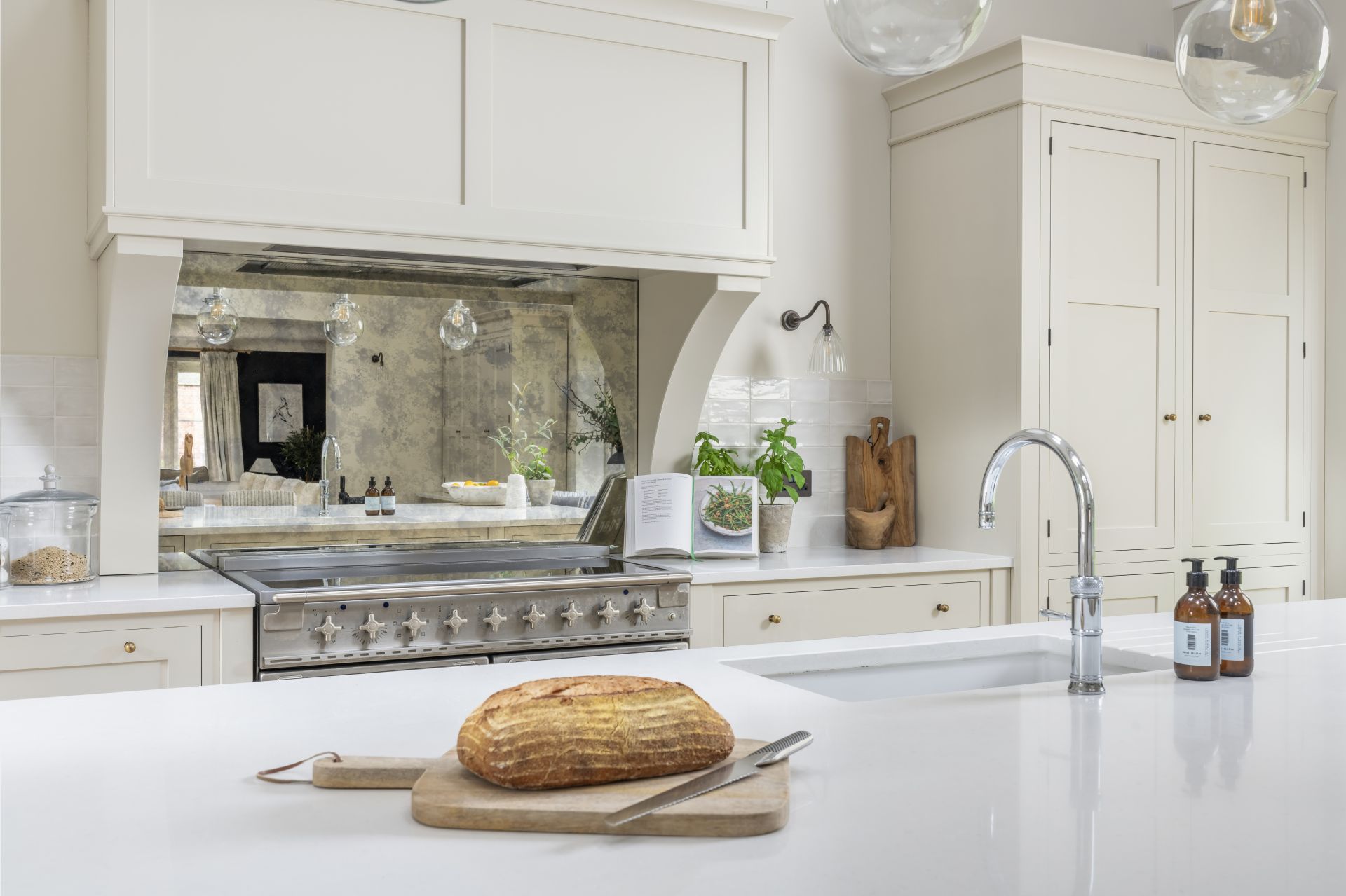 The light tones of this bespoke handcrafted kitchen make the Shaker-style design a relaxed environment for creating dishes and entertaining guests. The handmade island allows for effortless food preparation and space to move around, whether mixing ingredients or socialising with family and friends. The antiqued mirror splashback draws in light from the windows and doors, further enhancing the room’s atmosphere. This bespoke Shaker kitchen turns a house into a home.