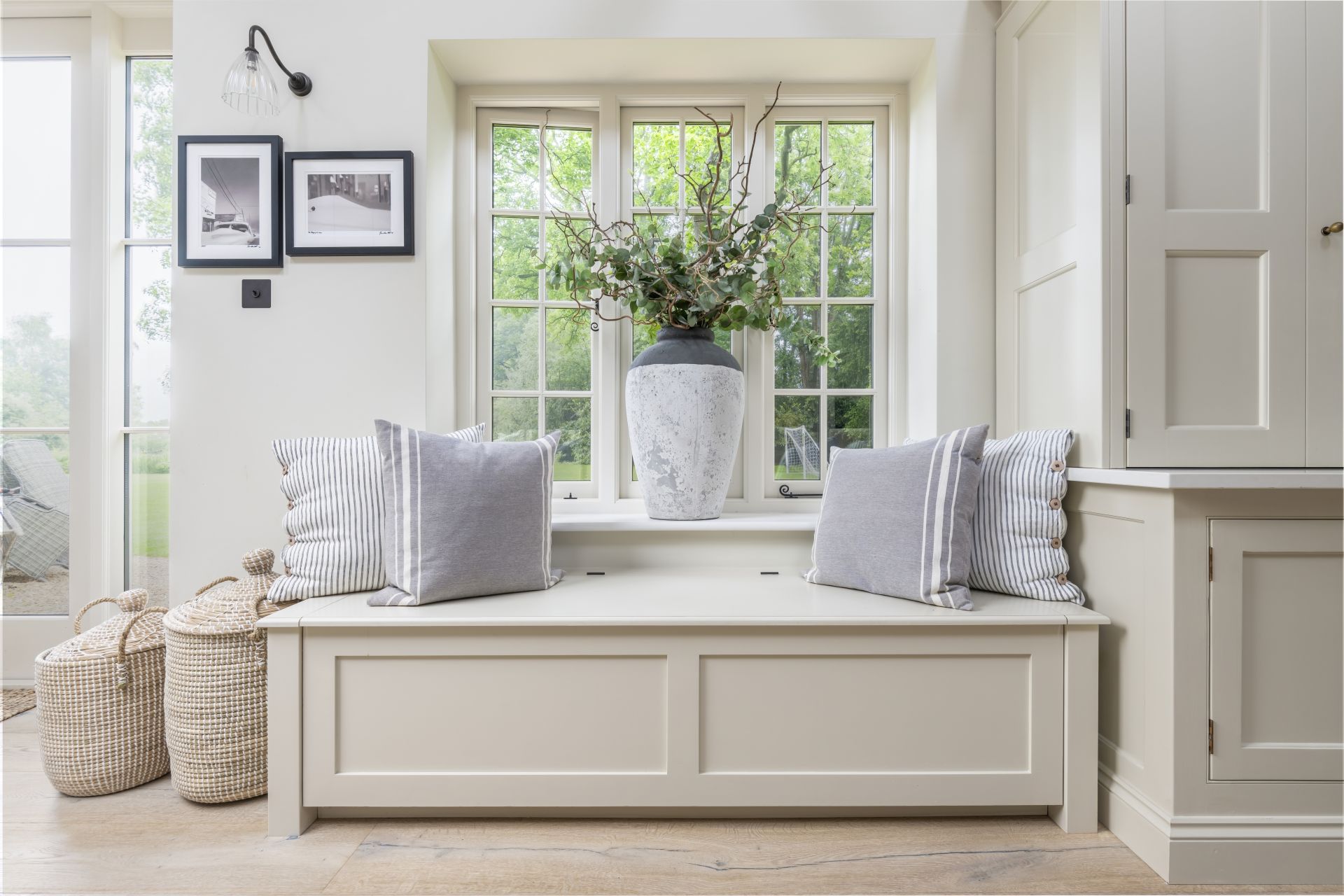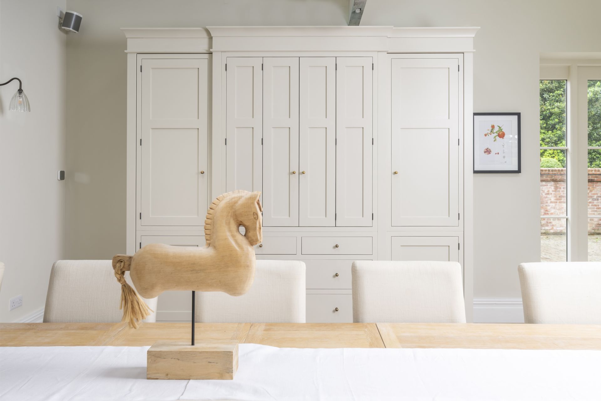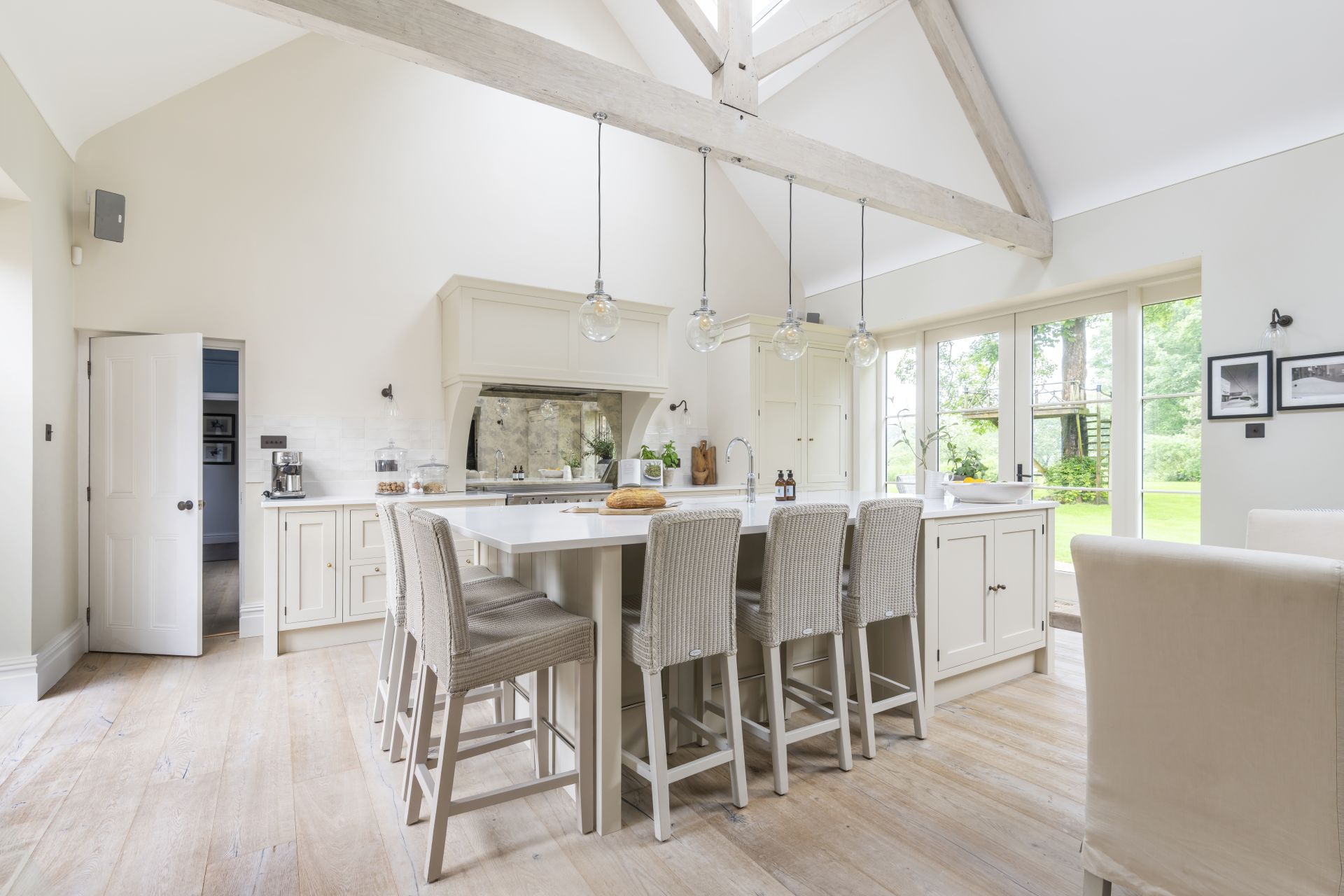 The light tones of this bespoke handcrafted kitchen make the Shaker-style design a relaxed environment for creating dishes and entertaining guests. The handmade island allows for effortless food preparation and space to move around, whether mixing ingredients or socialising with family and friends. The antiqued mirror splashback draws in light from the windows and doors, further enhancing the room’s atmosphere. This bespoke Shaker kitchen turns a house into a home.