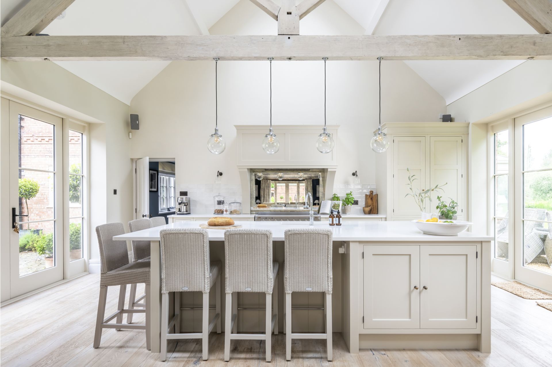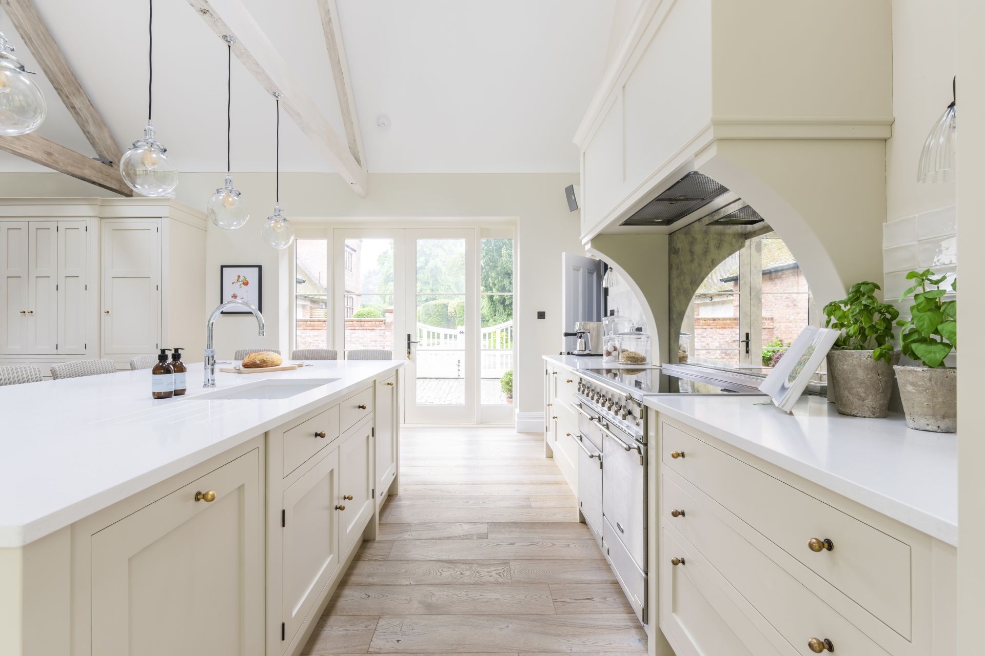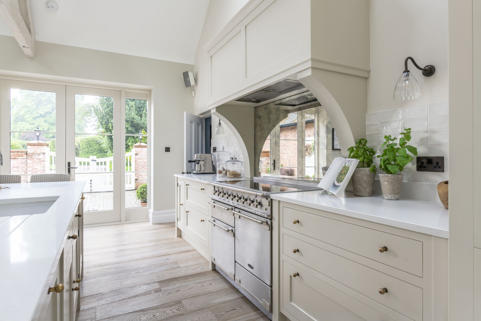 Located in Willaston, Cheshire, this bespoke Shaker kitchen offers a unique touch. The hand-painted kitchen features warm light tones and a classically proportioned kitchen island, creating an environment that’s ideal for modern living.