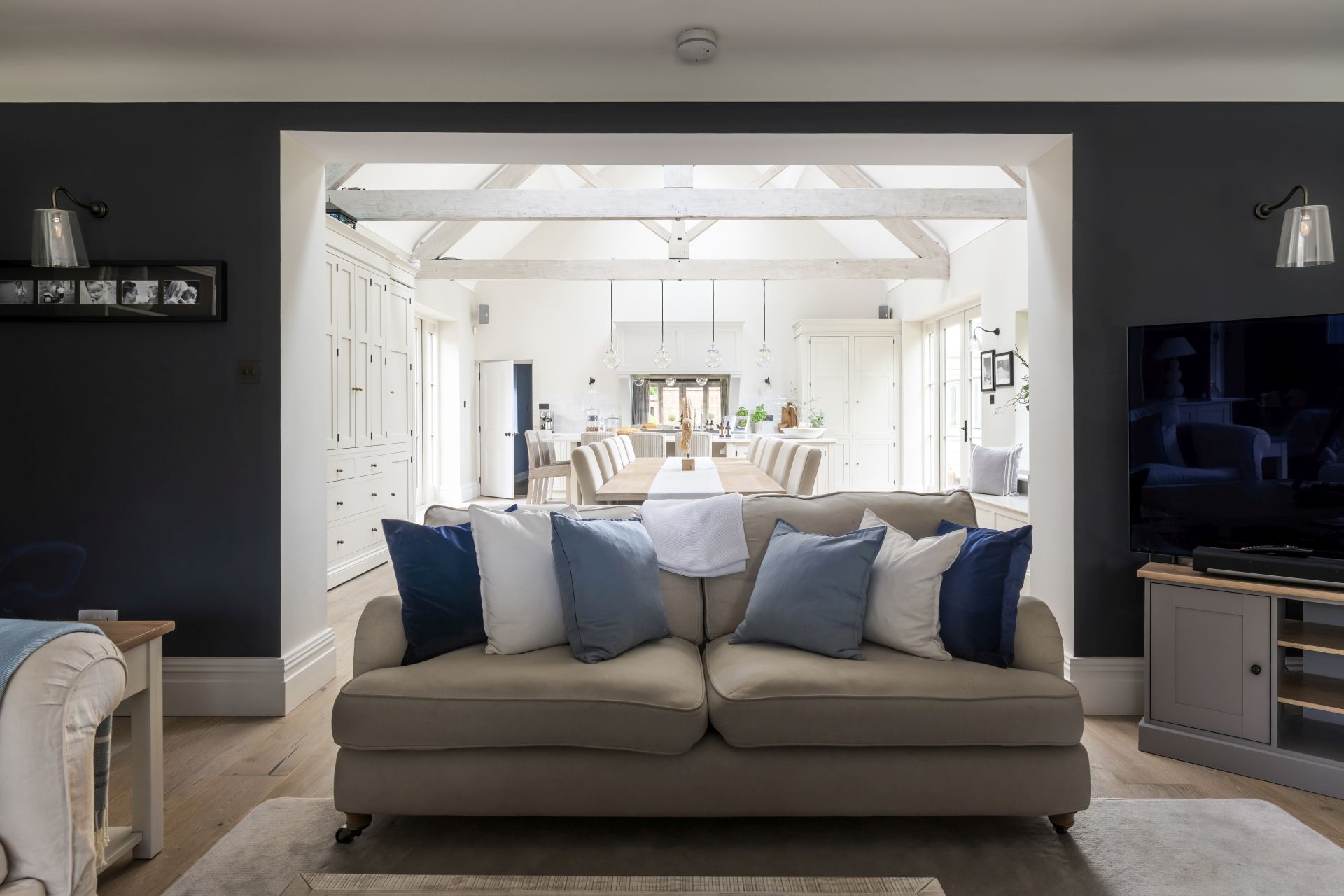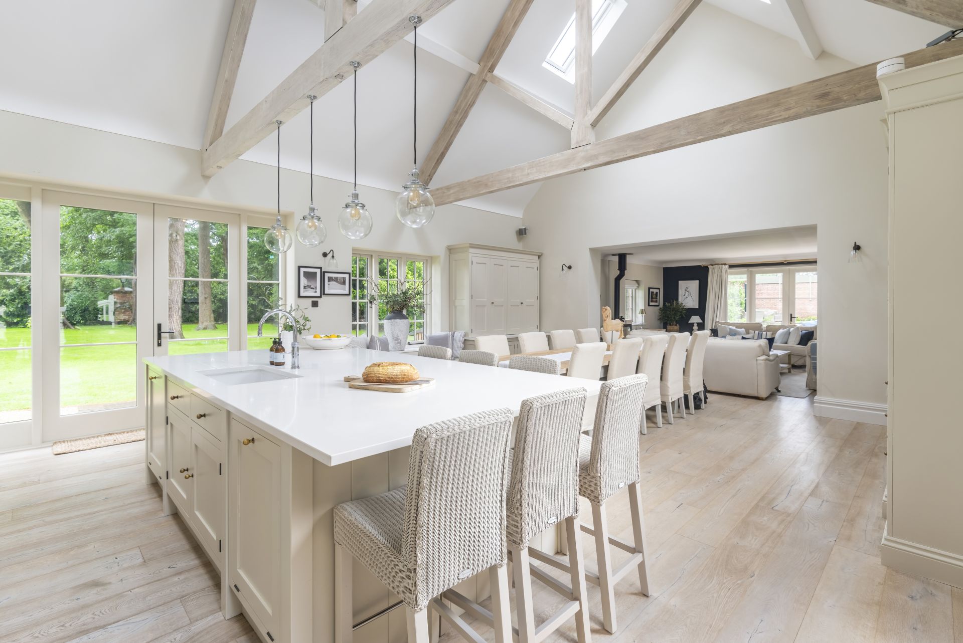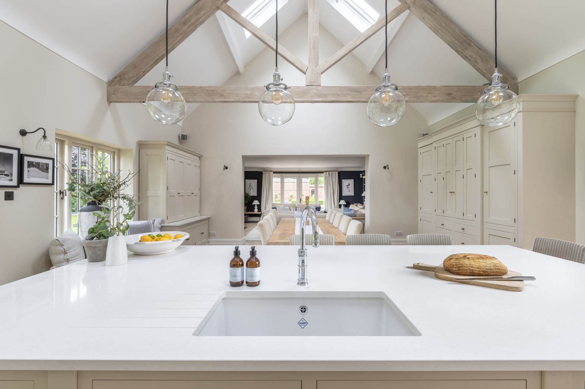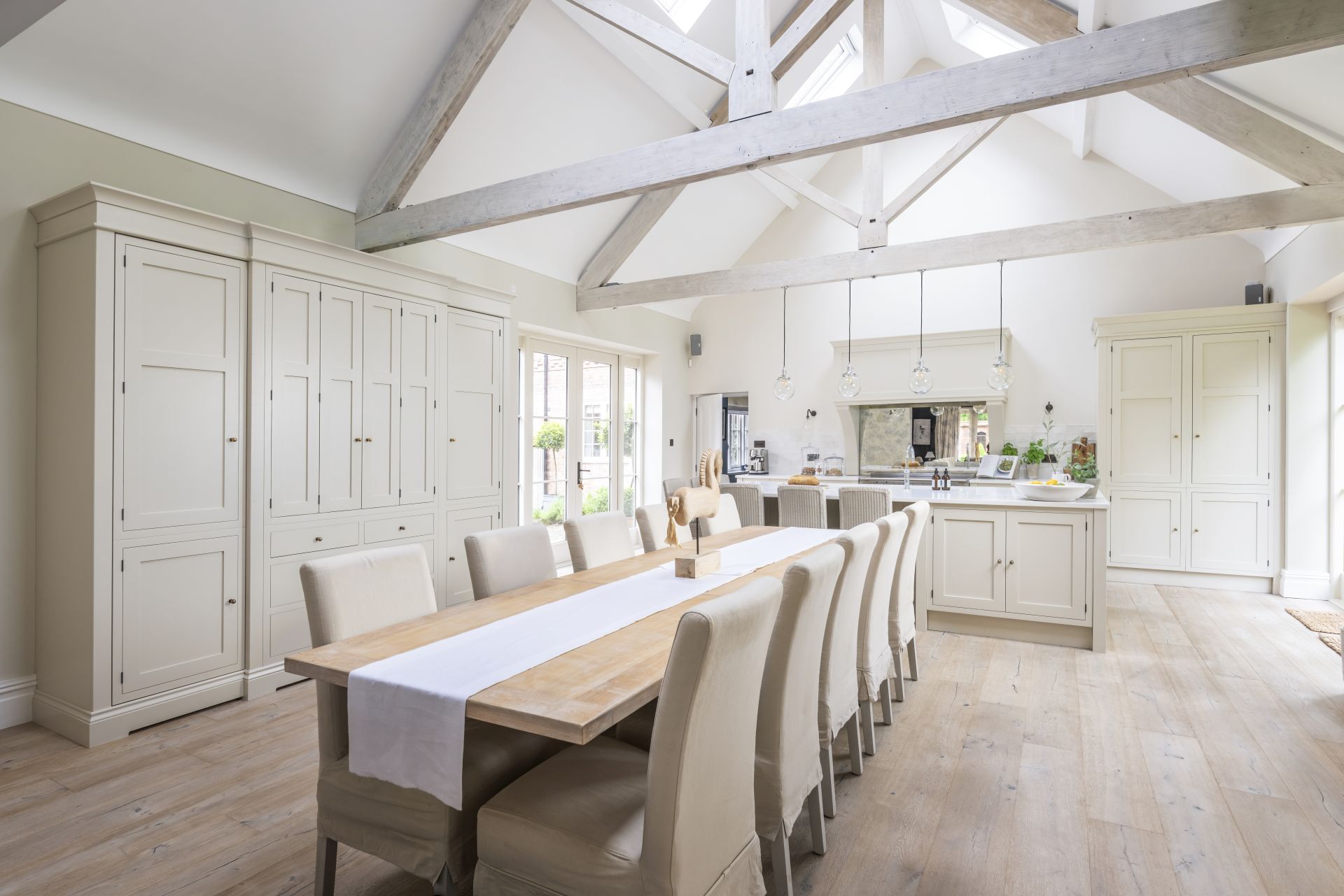 Located in Willaston, Cheshire, this bespoke Shaker kitchen offers a unique touch. The hand-painted kitchen features warm light tones and a classically proportioned kitchen island, creating an environment that’s ideal for modern living.
