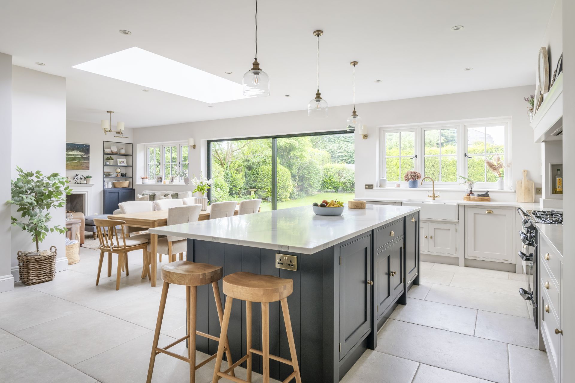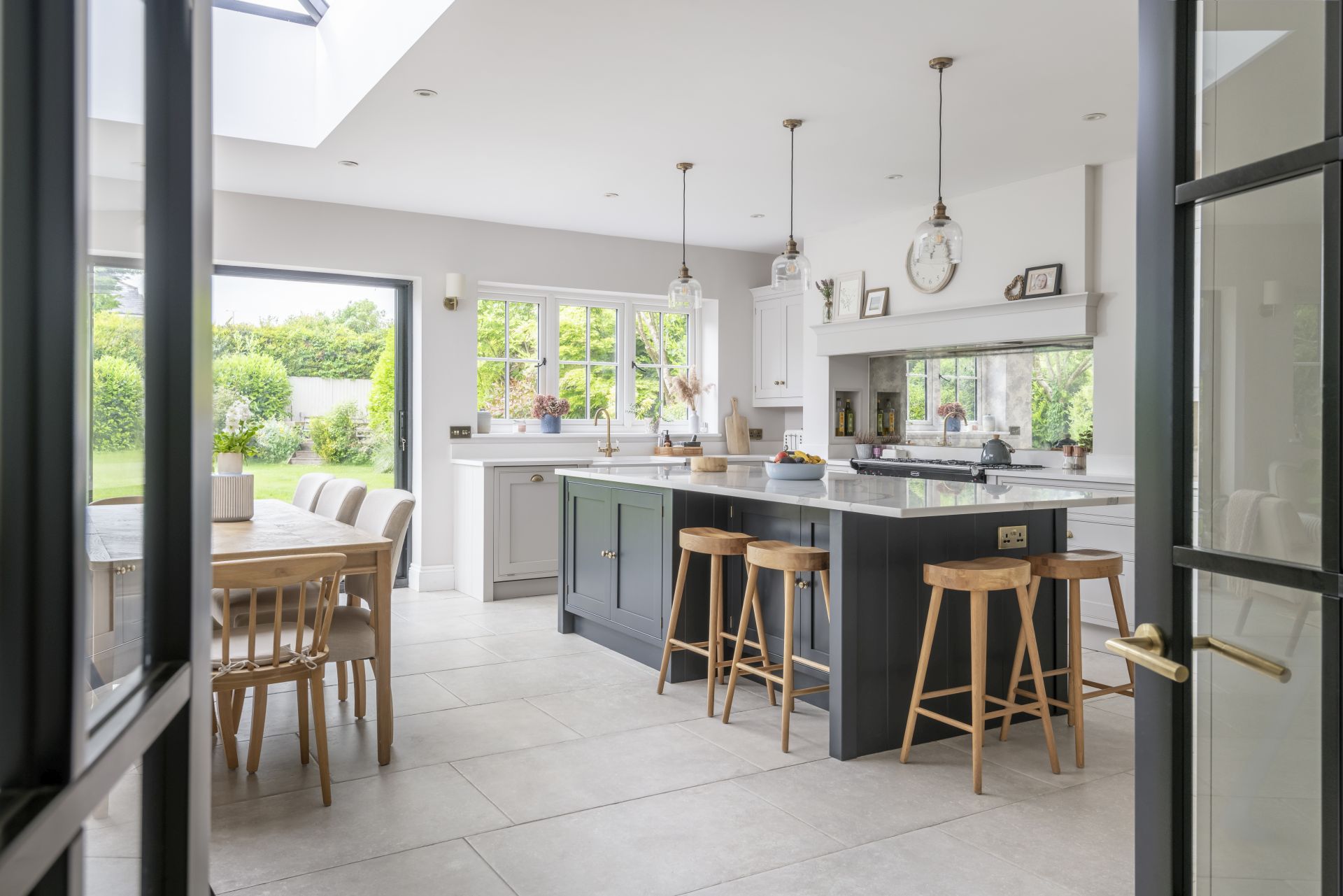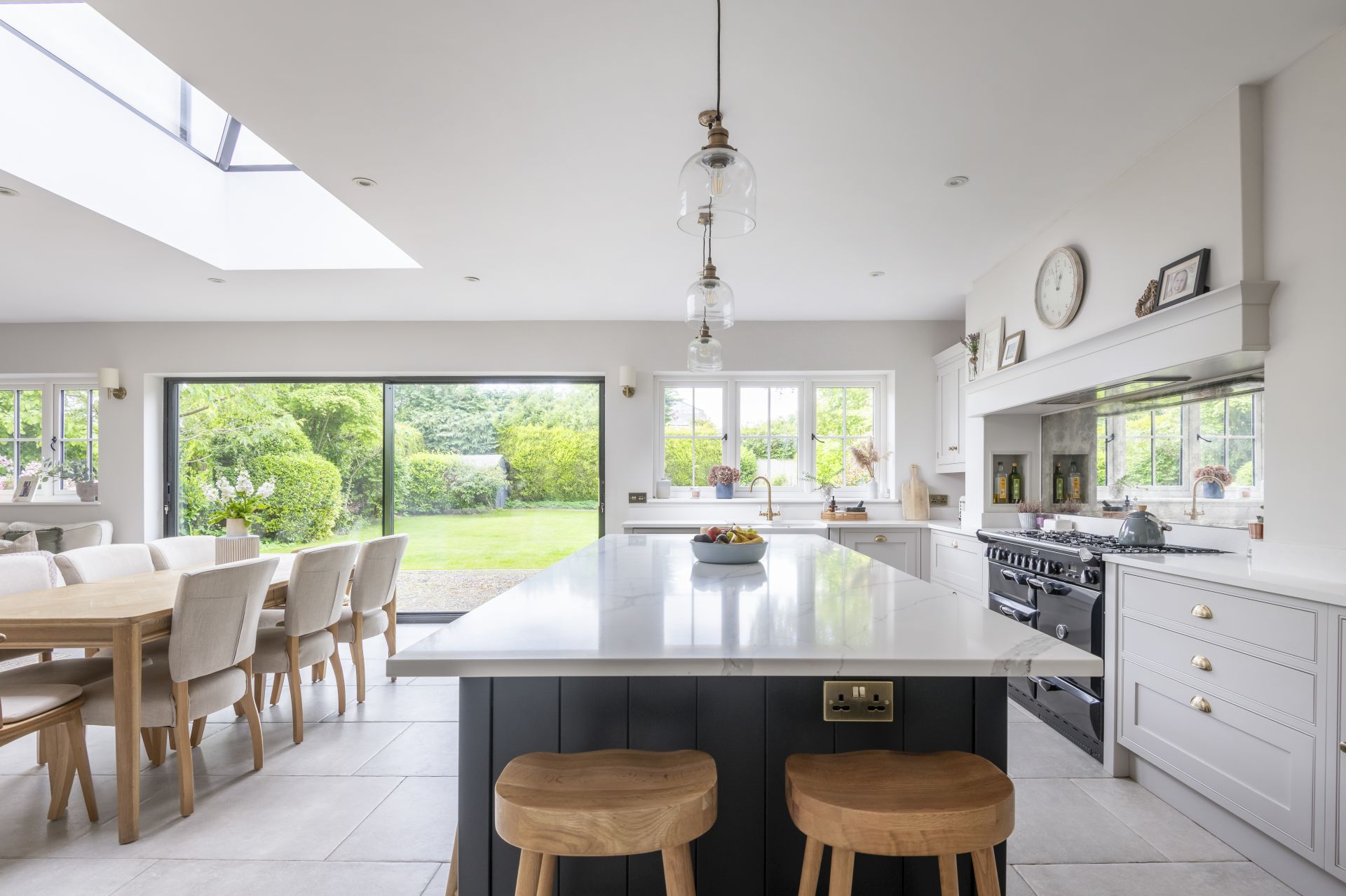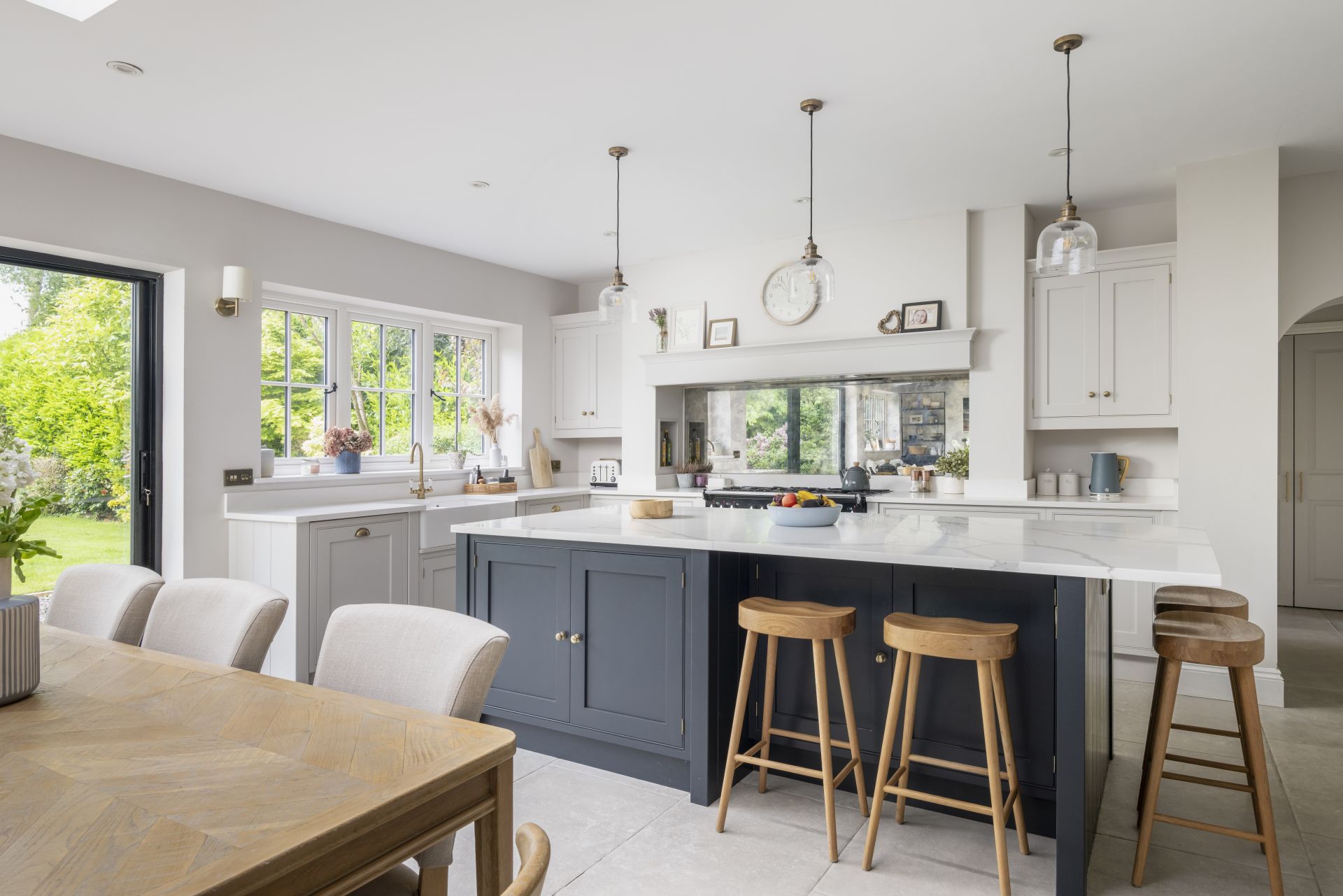 The Shaker kitchen provides a tastefully styled, open, and airy space for cooking, socialising, and connected living. Natural light floods in from large patio sliding doors, allowing for the introduction of a bold and contrasting colour to the handmade kitchen island.