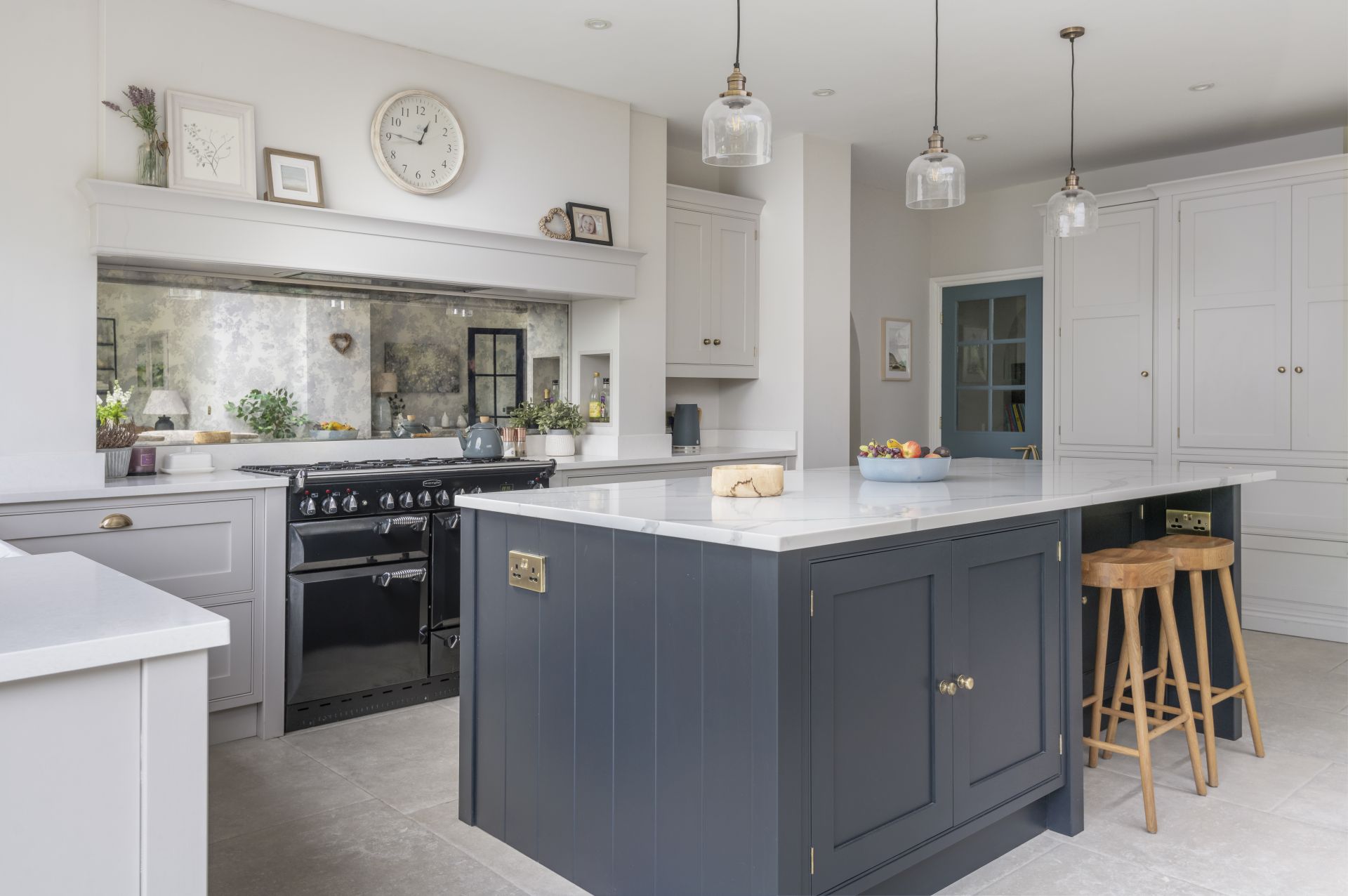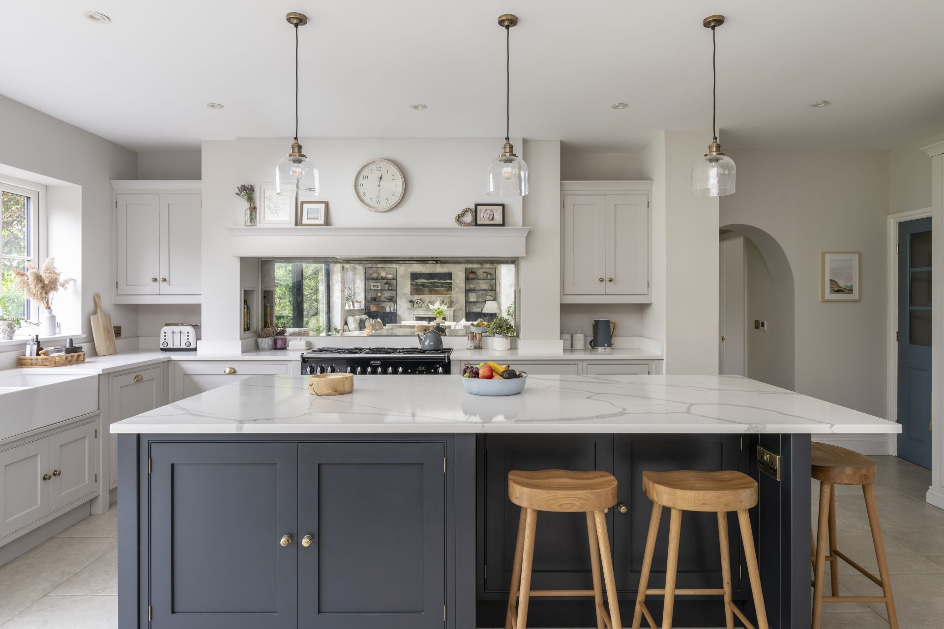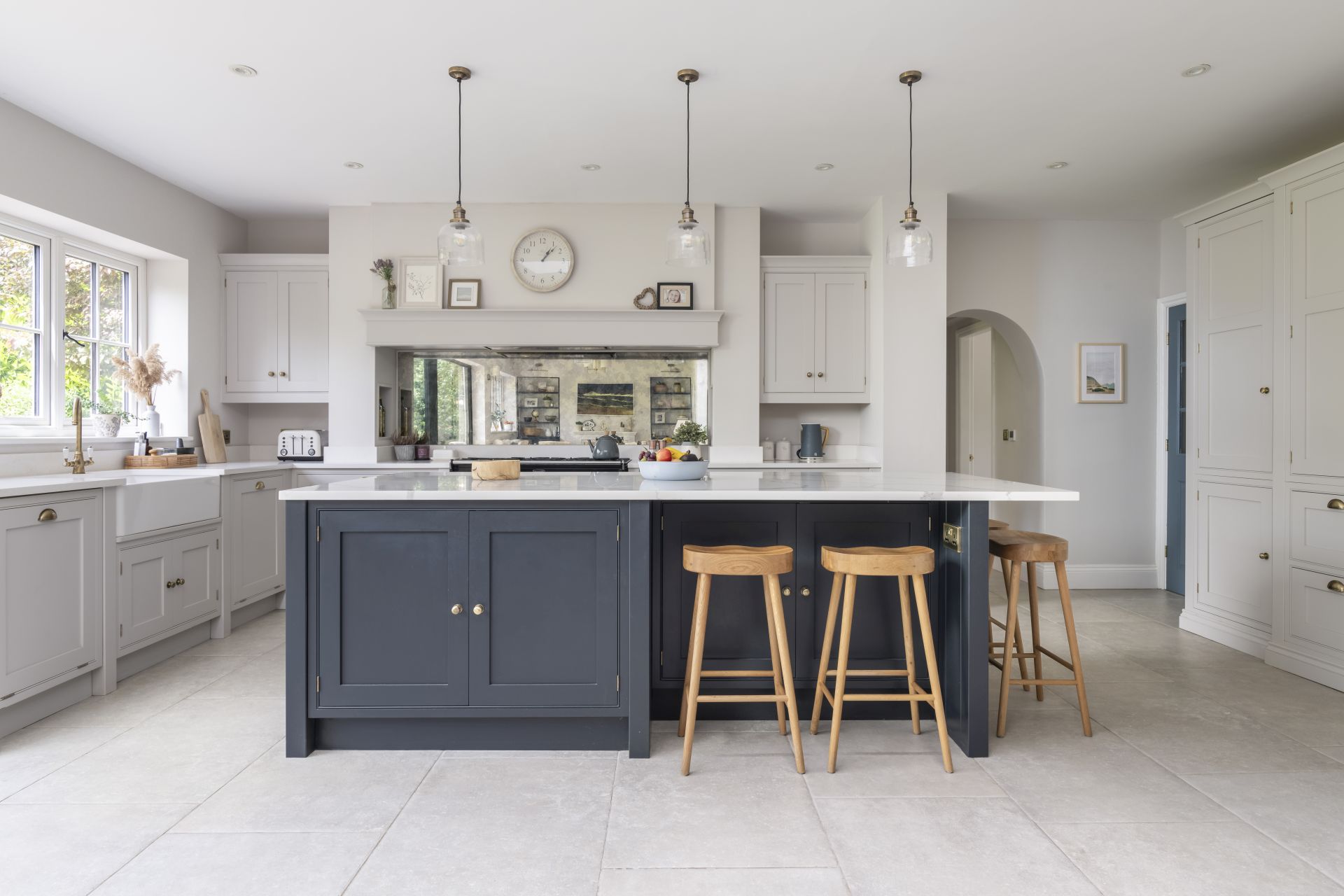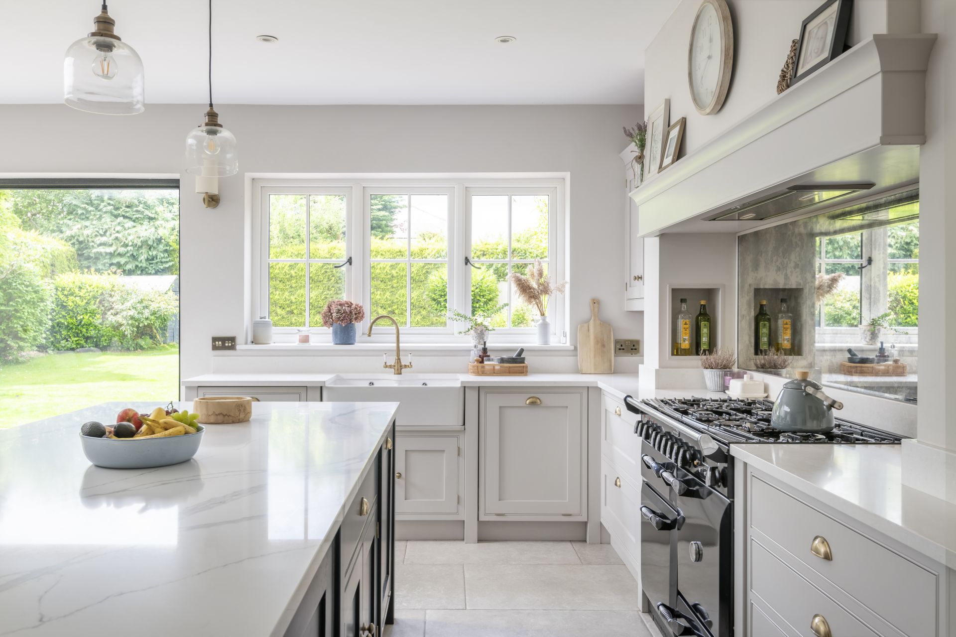 The Shaker kitchen provides a tastefully styled, open, and airy space for cooking, socialising, and connected living. Natural light floods in from large patio sliding doors, allowing for the introduction of a bold and contrasting colour to the handmade kitchen island.